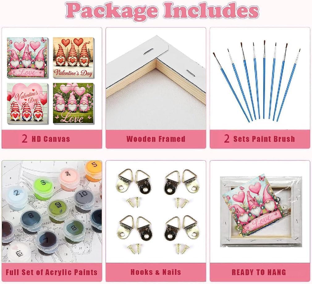 This Valentine Gnome Painting Set serves as a light, creative activity pack that encourages indoor artistic engagement. With four framed canvases, matching paint collections, and hanging tools included, the set can be used immediately without outside equipment.