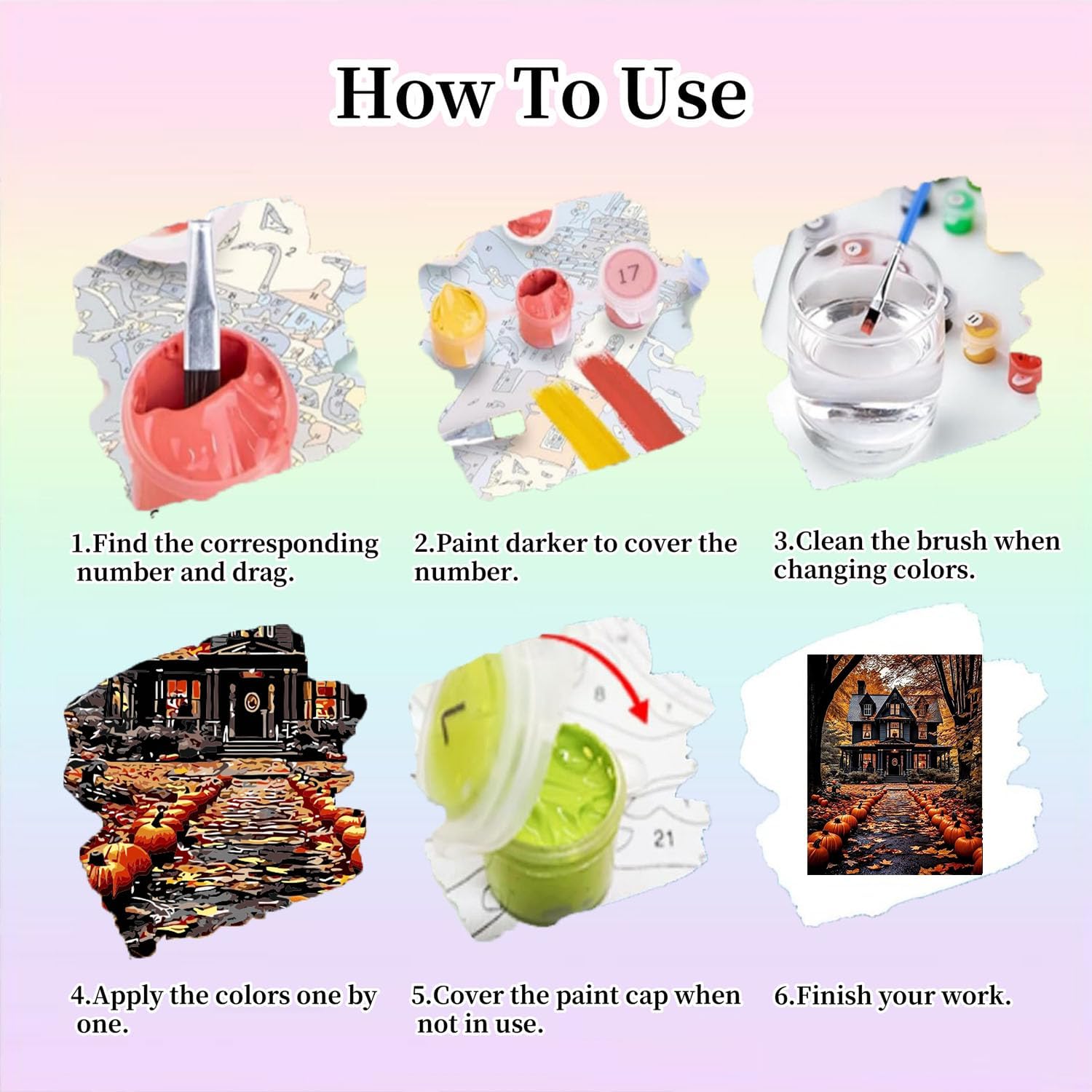 This 6 Pack Paint by Numbers kit provides six full sets of paints. The acrylics are vacuum packed to stay fresh until opened. Their bold pigments allow smooth coverage and strong contrasts, making every Halloween detail pop. These paints are waterproof when dry and resist fading, keeping artwork vivid for years.