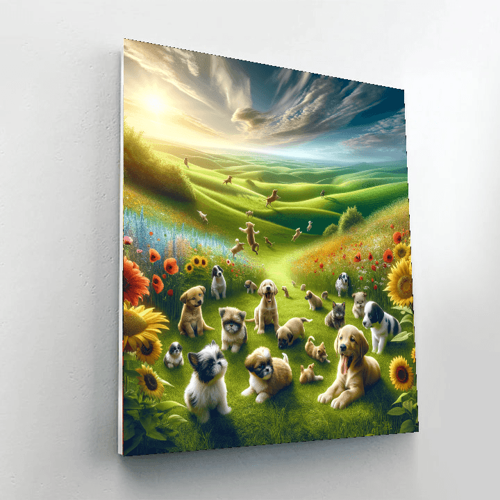 A group of playful puppies frolicking in a grassy field. Perfect for adding a touch of cuteness to a childs bedroom or playroom.