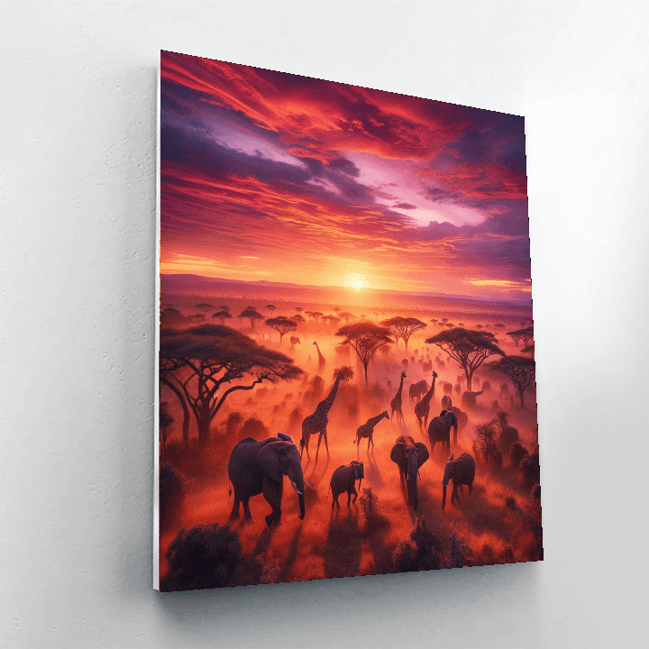A vibrant scene of the African savannah, featuring majestic elephants, towering giraffes, and a stunning sunset. Ideal for bringing a touch of exotic beauty to a living room or office.