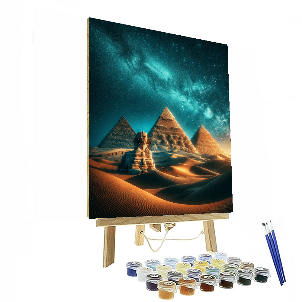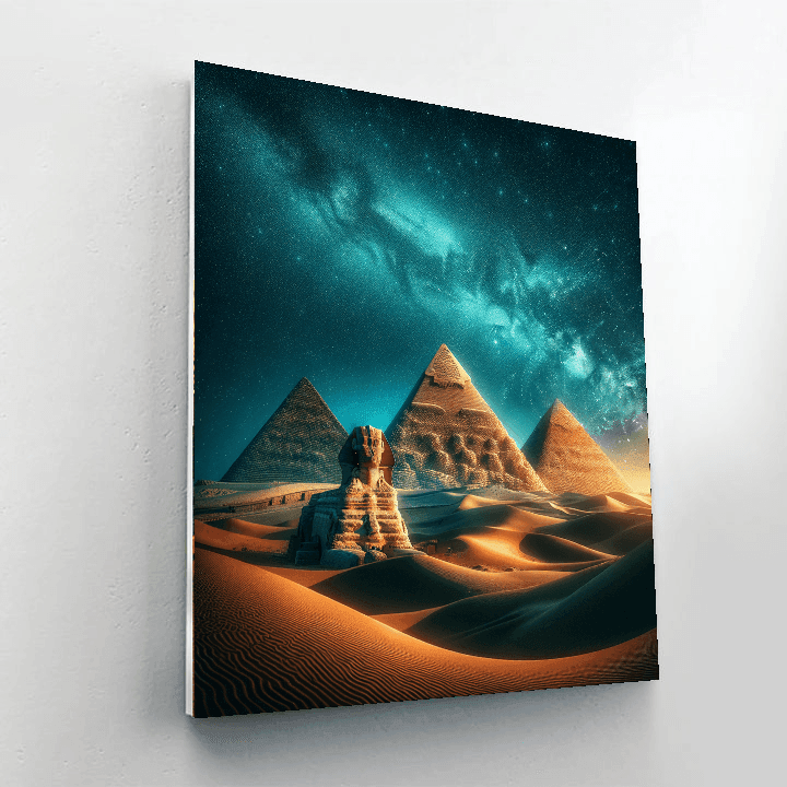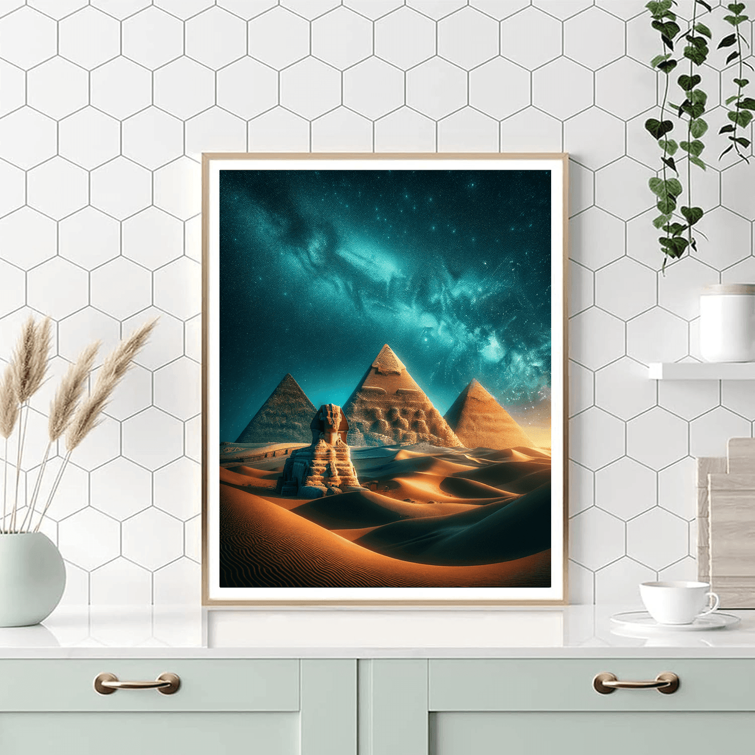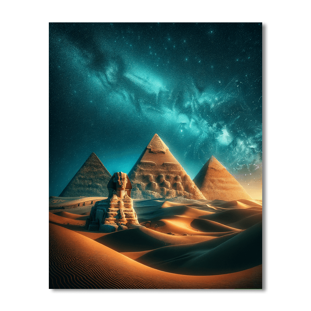 Discover the wonders of ancient Egypt with this captivating piece. Featuring iconic landmarks like the pyramids and the Sphinx under a starry night sky, it’s perfect for adding a touch of historical intrigue to your living room or office.