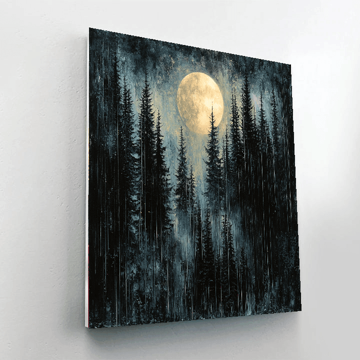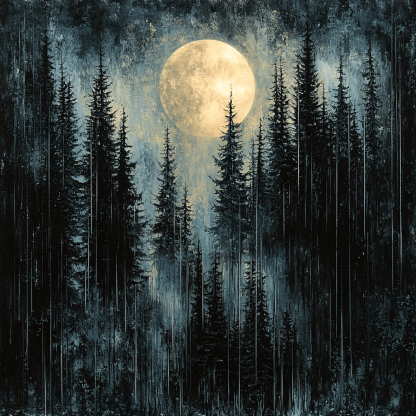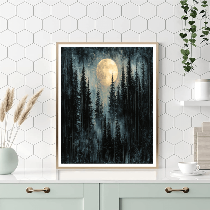 Step into a mysterious, moonlit forest with this Gothic-inspired artwork. The painting features a dense forest with tall, dark trees and a full moon casting an eerie glow. Perfect for a moody living room or a creative studio, this piece will add a touch of mystery and intrigue.