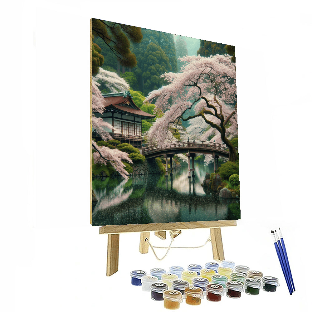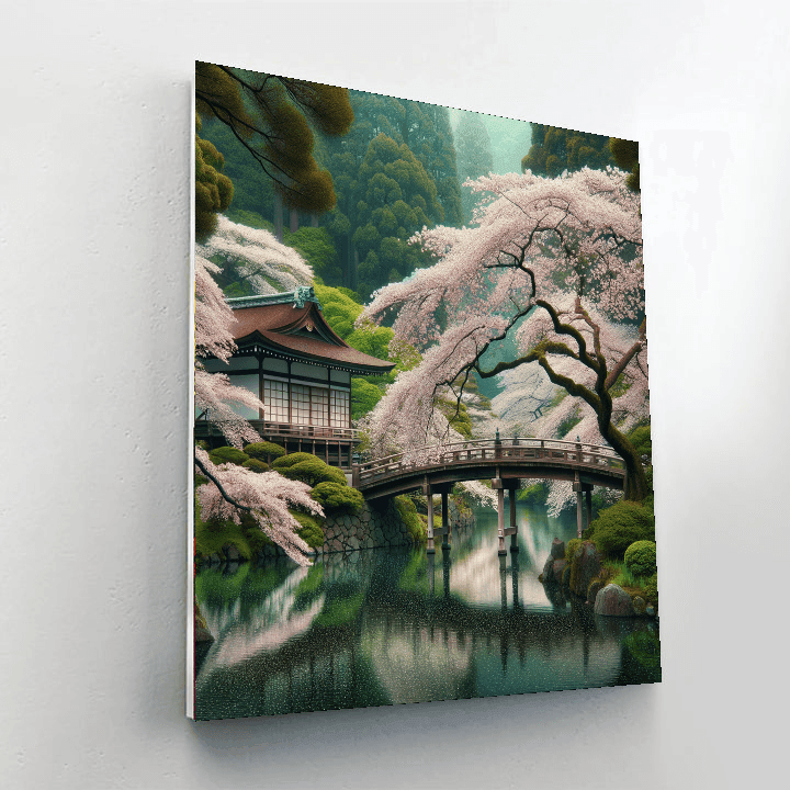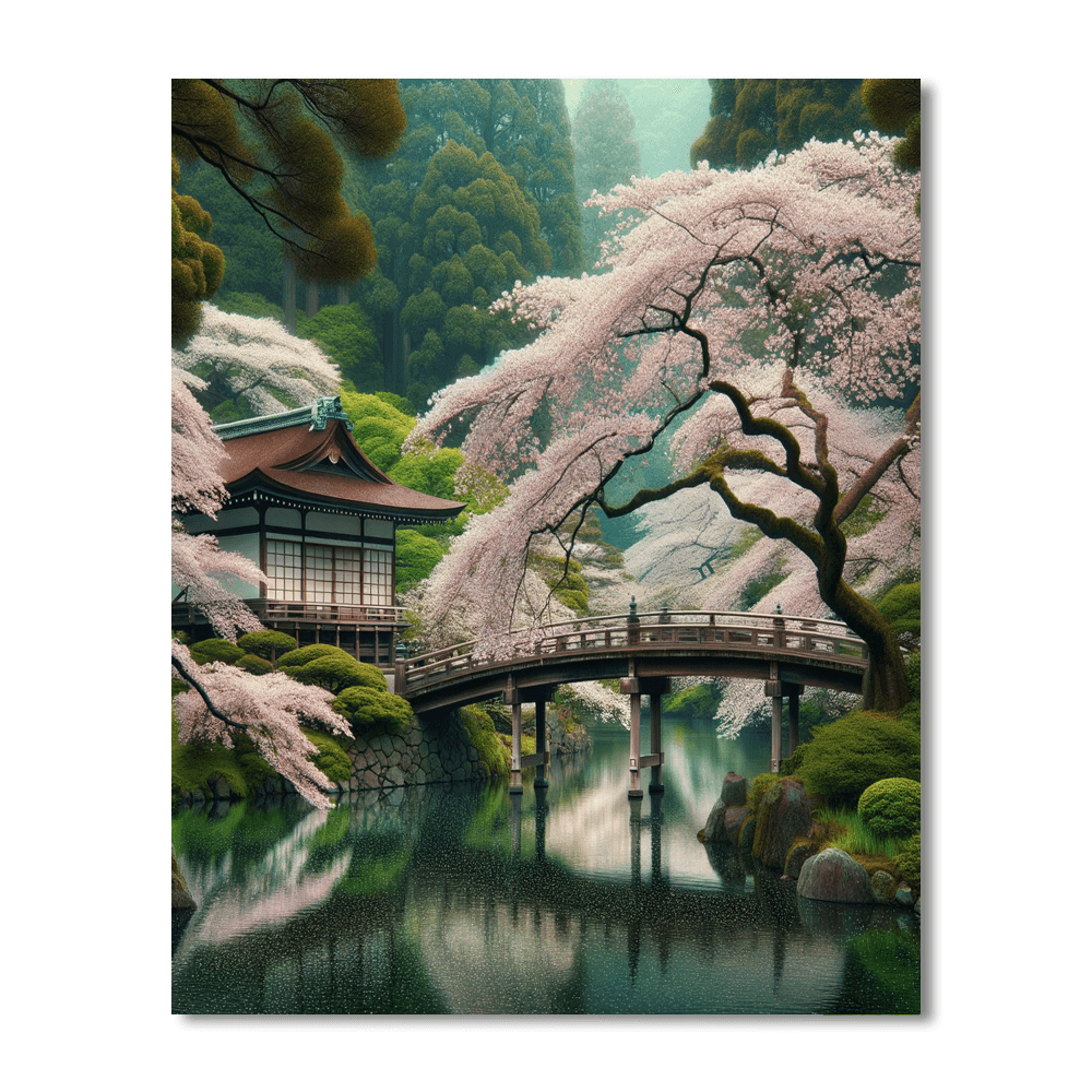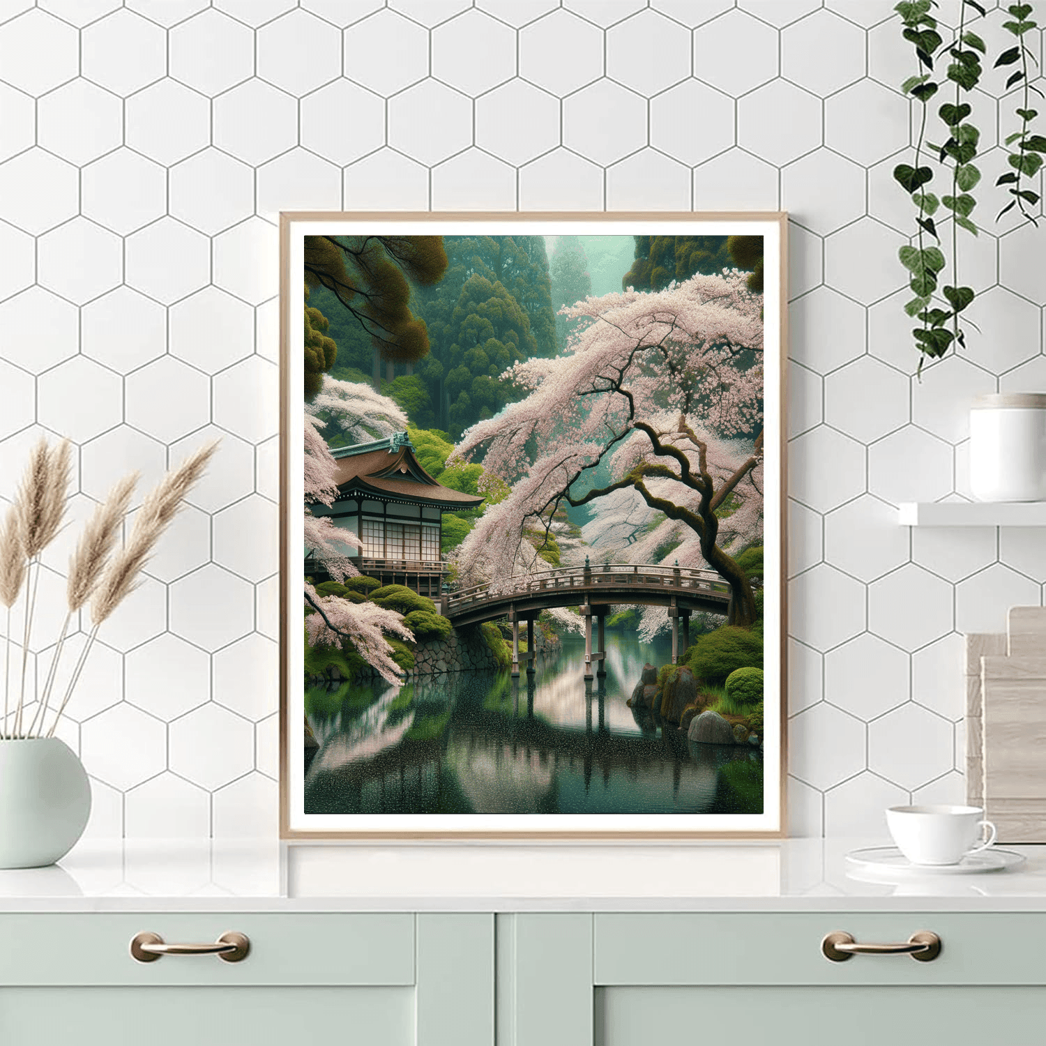 Experience the ethereal beauty of spring in Japan with Blossom Rain in Kyoto. This delicate scene captures cherry blossoms in full bloom, gently falling over a traditional Japanese bridge and a calm stream. The soft pinks and whites of the blossoms contrast beautifully with the rich wooden tones of the bridge and lush greens of the foliage, making it a perfect addition to spaces needing a touch of gentle, natural beauty.