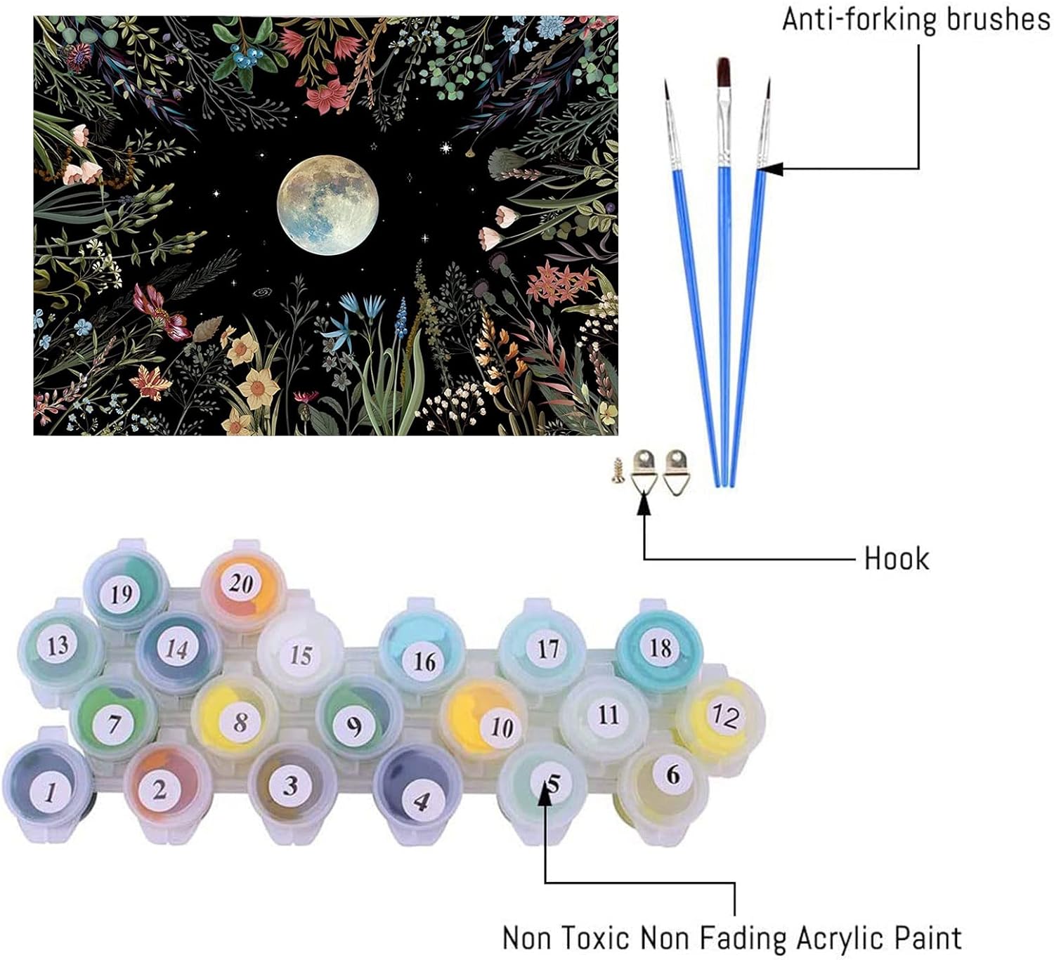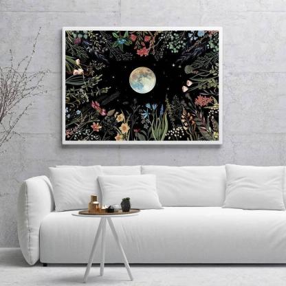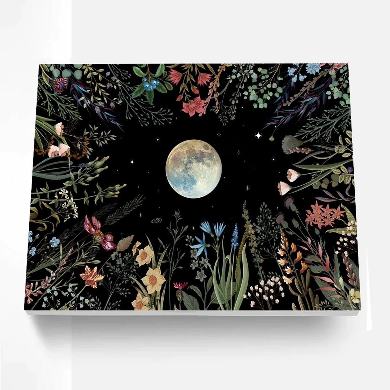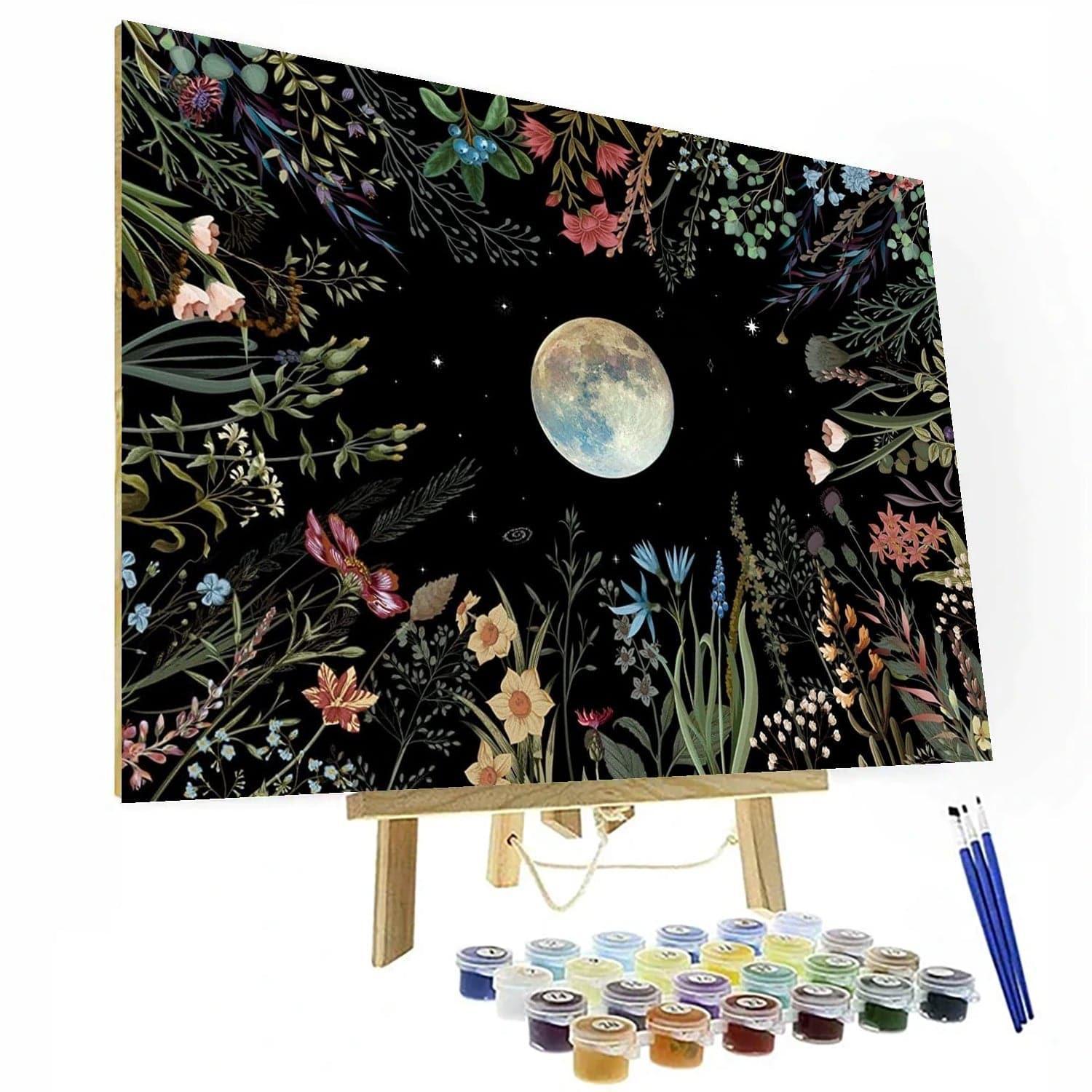 Introduce the tranquility of nature's nighttime beauty into your living space with our Botanica Moon Canvas Paint By Number Kit. This exquisite piece features a harmonious blend of florals enveloping a luminous celestial body, designed to bring a calming influence and a touch of natural elegance to any room.