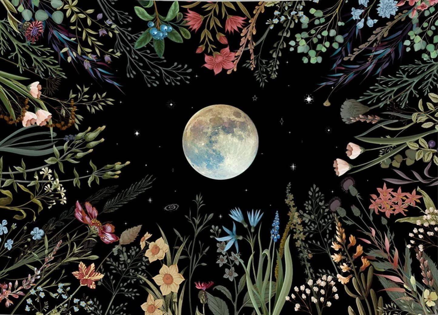 Pattern: Depicts an intricate pattern of nocturnal flora circling a full moon