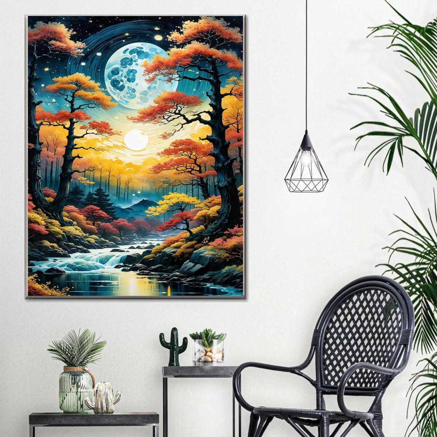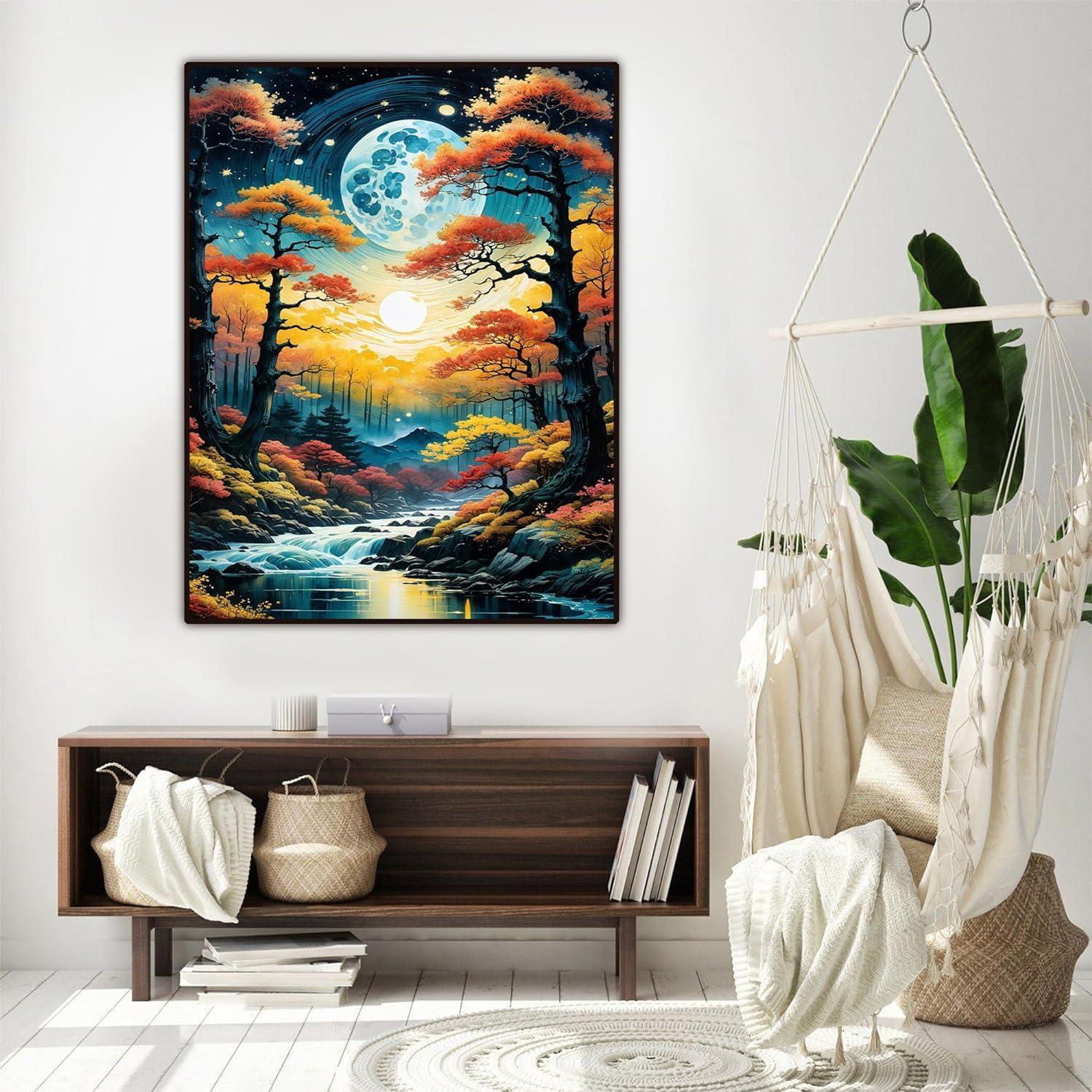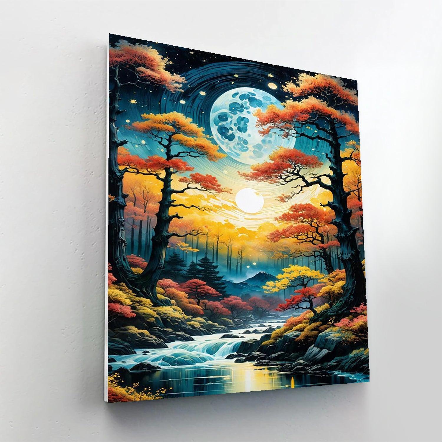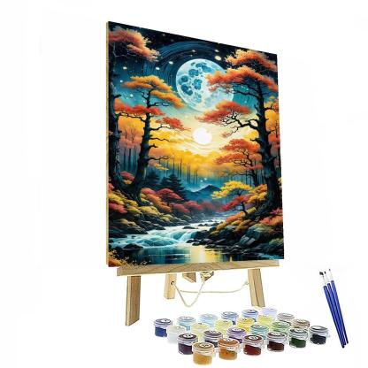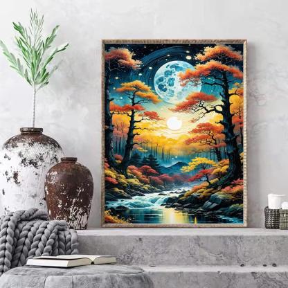 The Celestial Cascade Paint By Number Kit unveils the splendor of a cosmic ballet between the moon and the earth, wrapped in the enchanting beauty of an autumnal night. It’s an artful adventure where the tranquility of nature's landscape is lit by the gentle glow of celestial bodies.