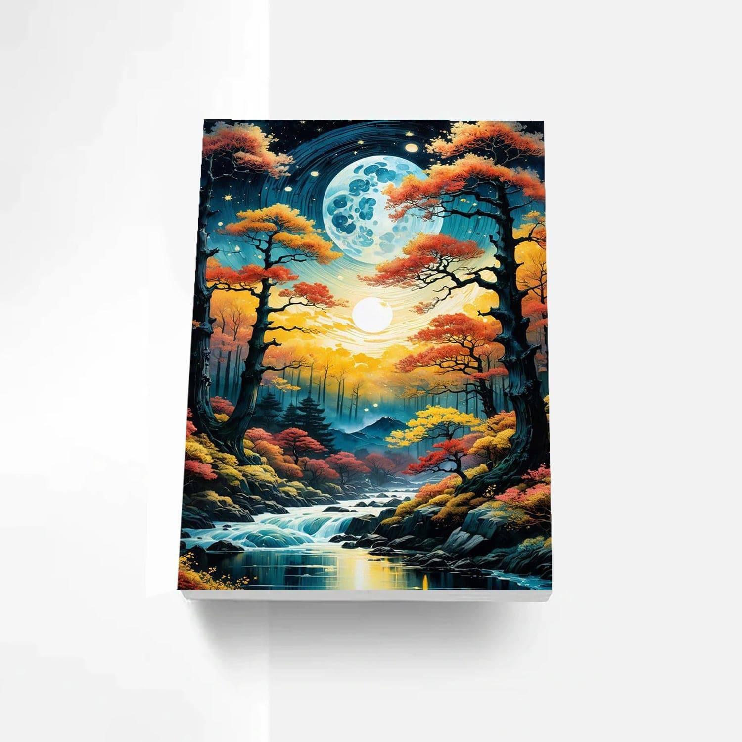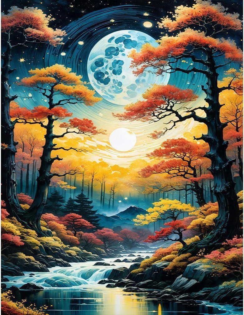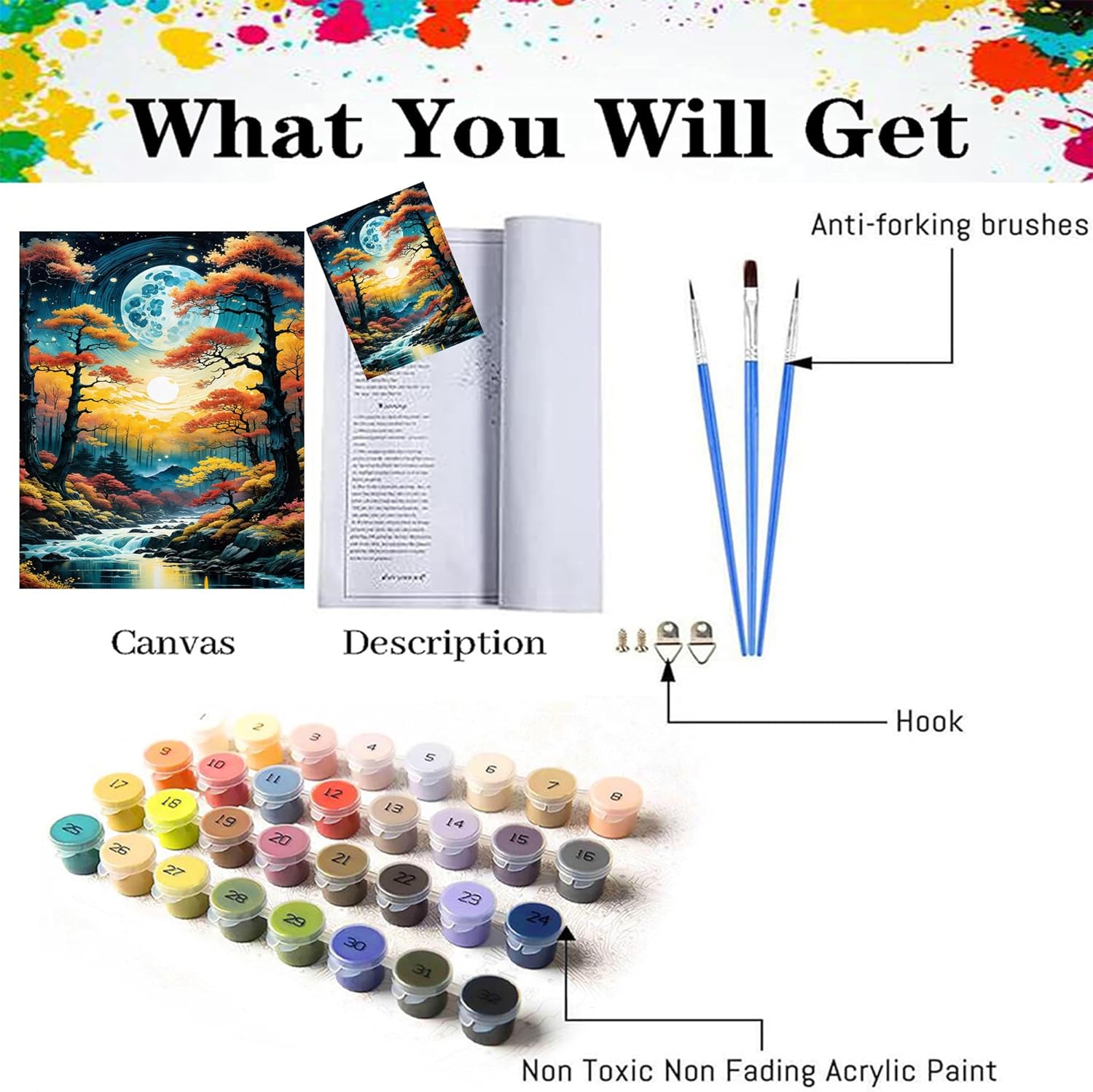 The Celestial Cascade Paint By Number Kit unveils the splendor of a cosmic ballet between the moon and the earth, wrapped in the enchanting beauty of an autumnal night. It’s an artful adventure where the tranquility of nature's landscape is lit by the gentle glow of celestial bodies.