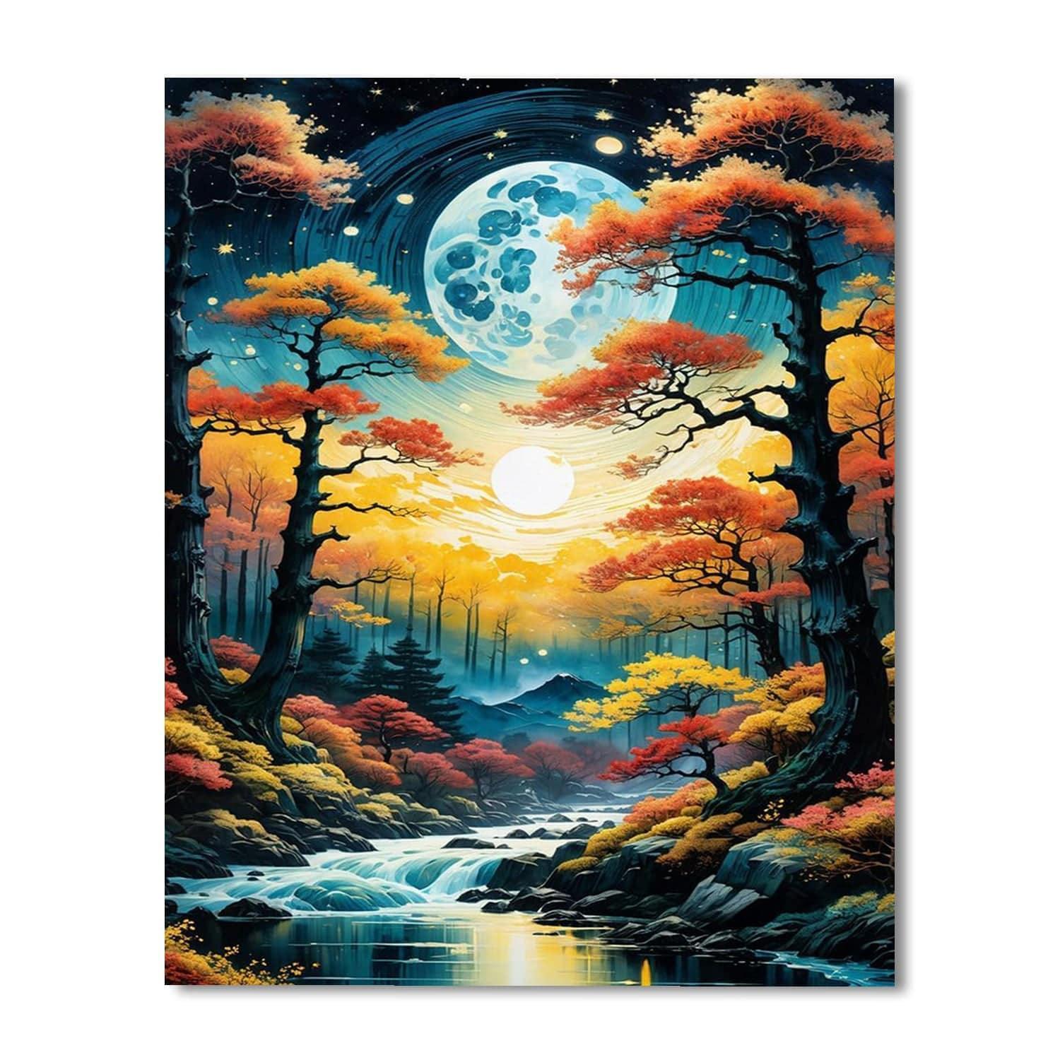 The Celestial Cascade Paint By Number Kit unveils the splendor of a cosmic ballet between the moon and the earth, wrapped in the enchanting beauty of an autumnal night. It’s an artful adventure where the tranquility of nature's landscape is lit by the gentle glow of celestial bodies.