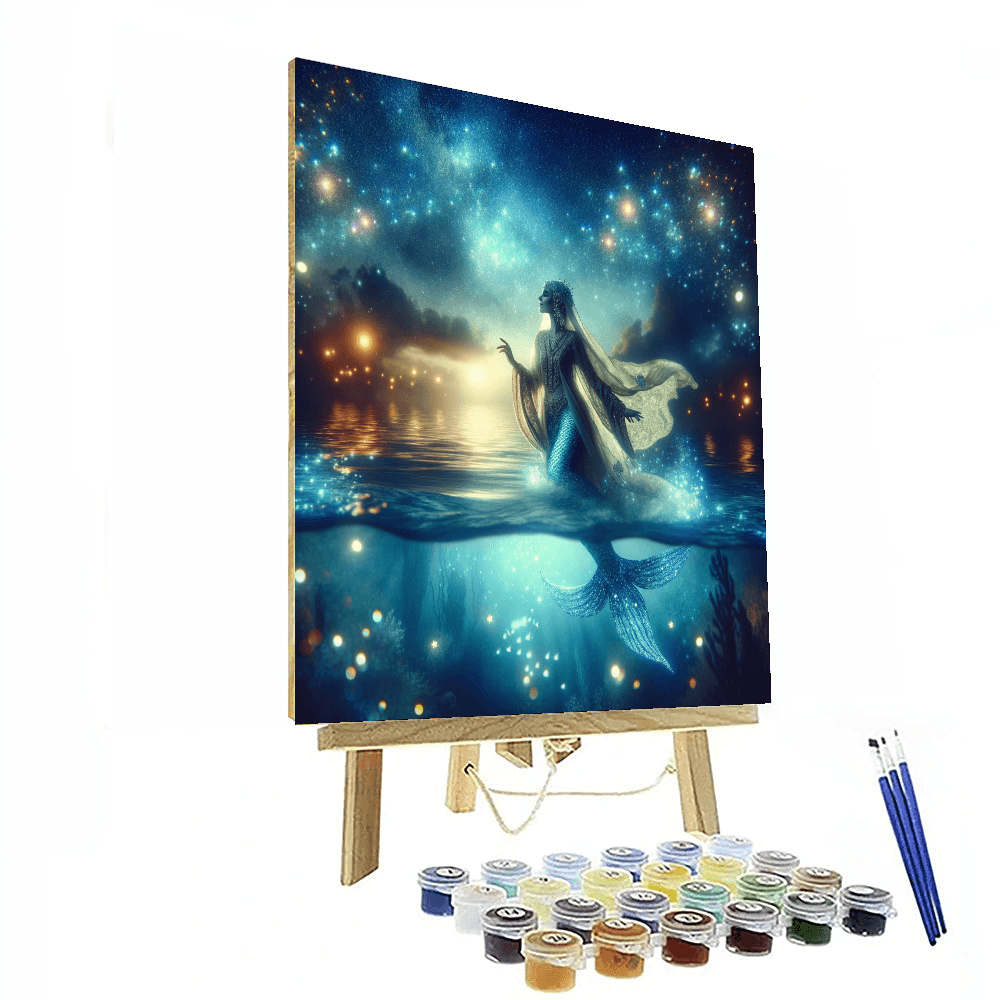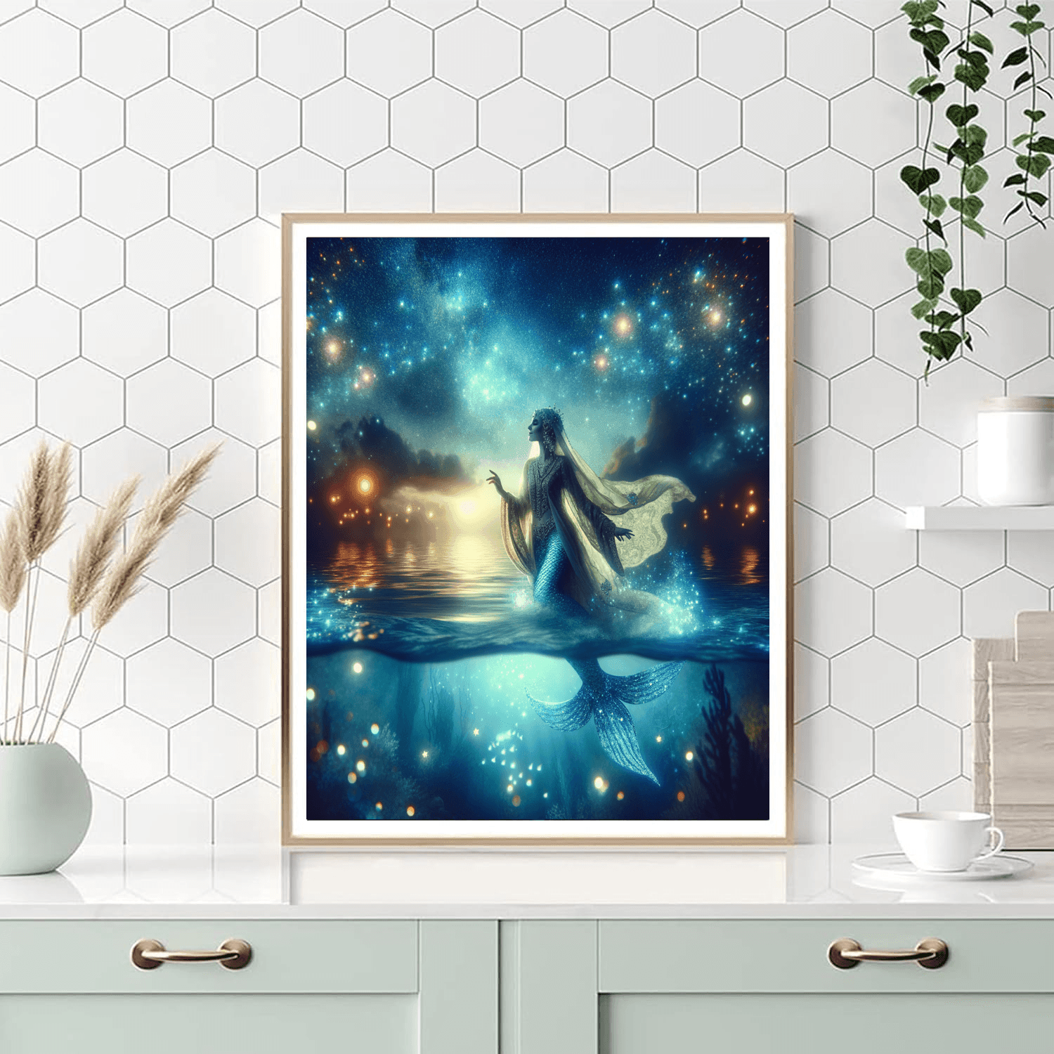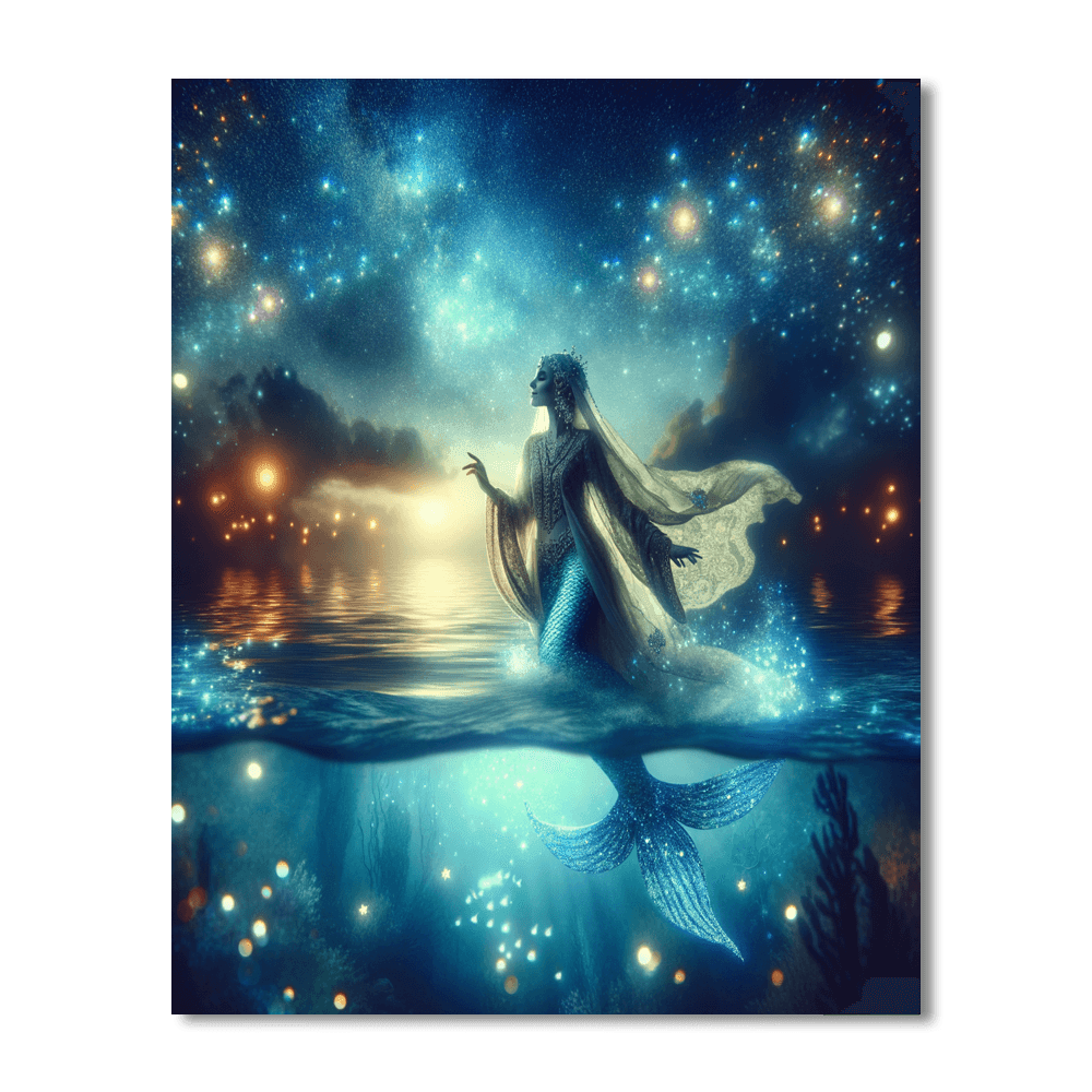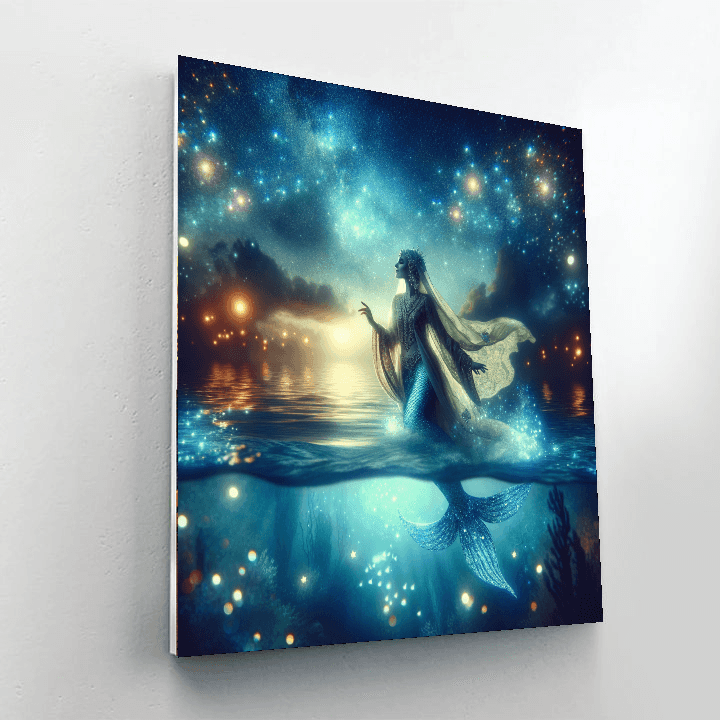 Dive into a world of fantasy with the Celestial Mermaid Lagoon. This magical artwork features a celestial mermaid gracefully swimming in a shimmering lagoon under a starlit sky. The ethereal glow of the water and the mermaids iridescent scales create a sense of mystery and enchantment, making it a perfect addition to a dreamy bedroom or creative space.