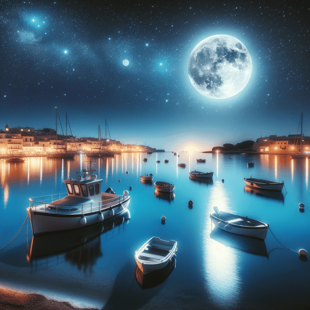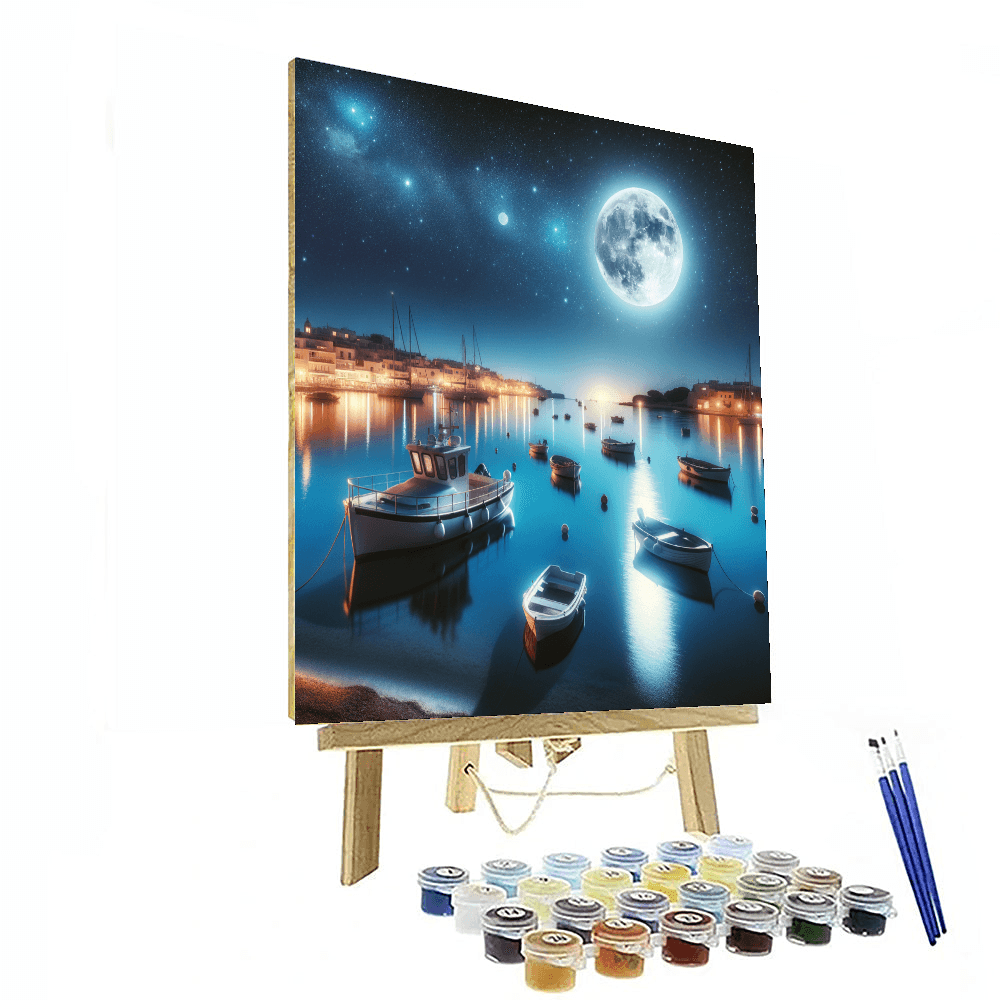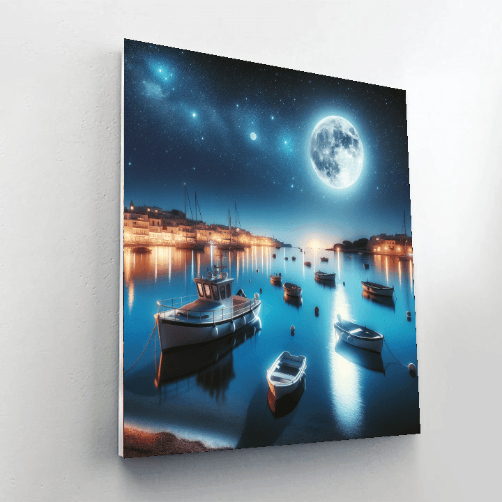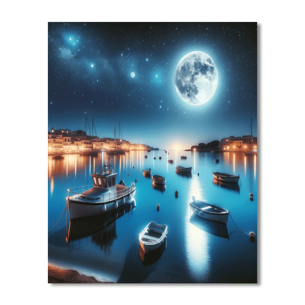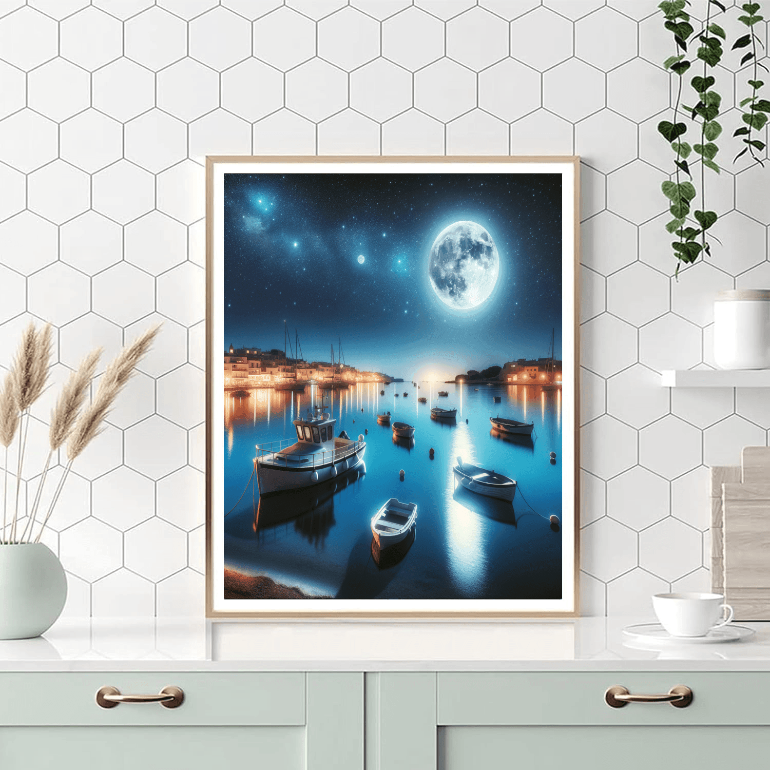 Celestial Moonlit Harbor depicts a tranquil harbor scene under a full moon. The gentle waters reflect the moonlight, and boats bob quietly at their moorings. This peaceful nighttime scene is perfect for bringing a sense of calm and serenity to your living space, ideal for bedrooms or areas where relaxation is key.