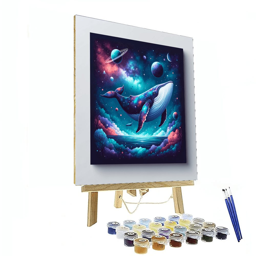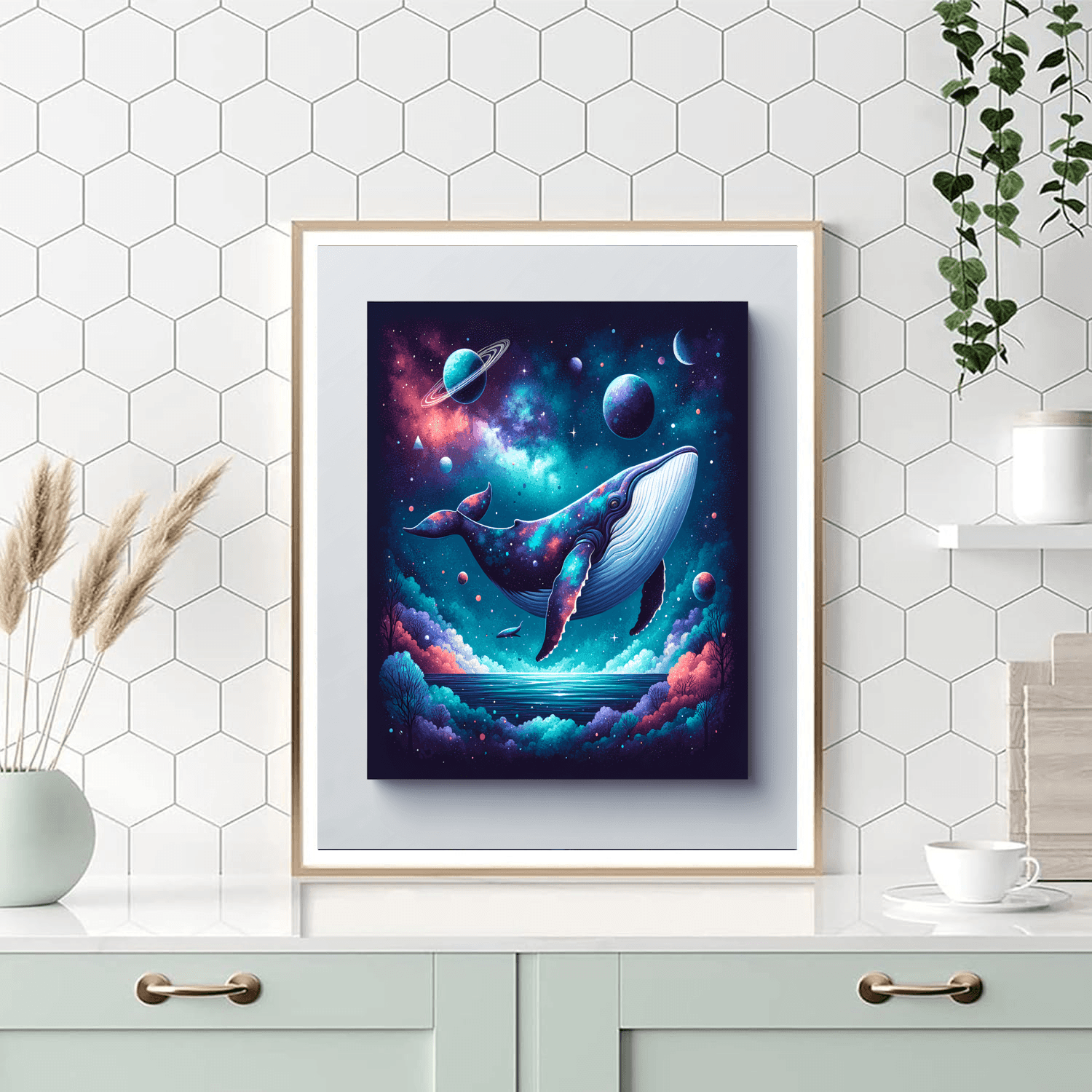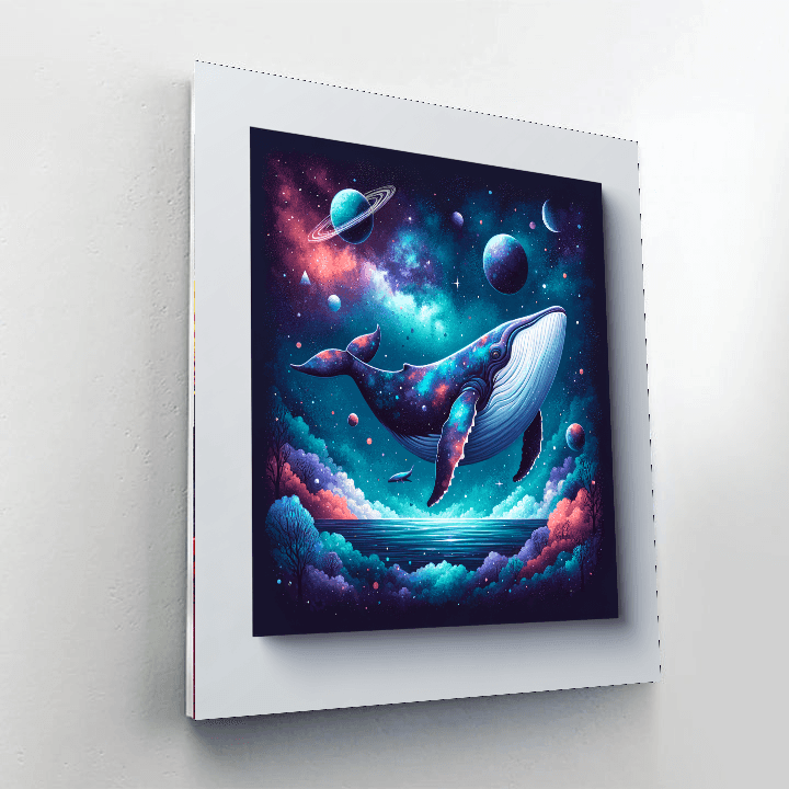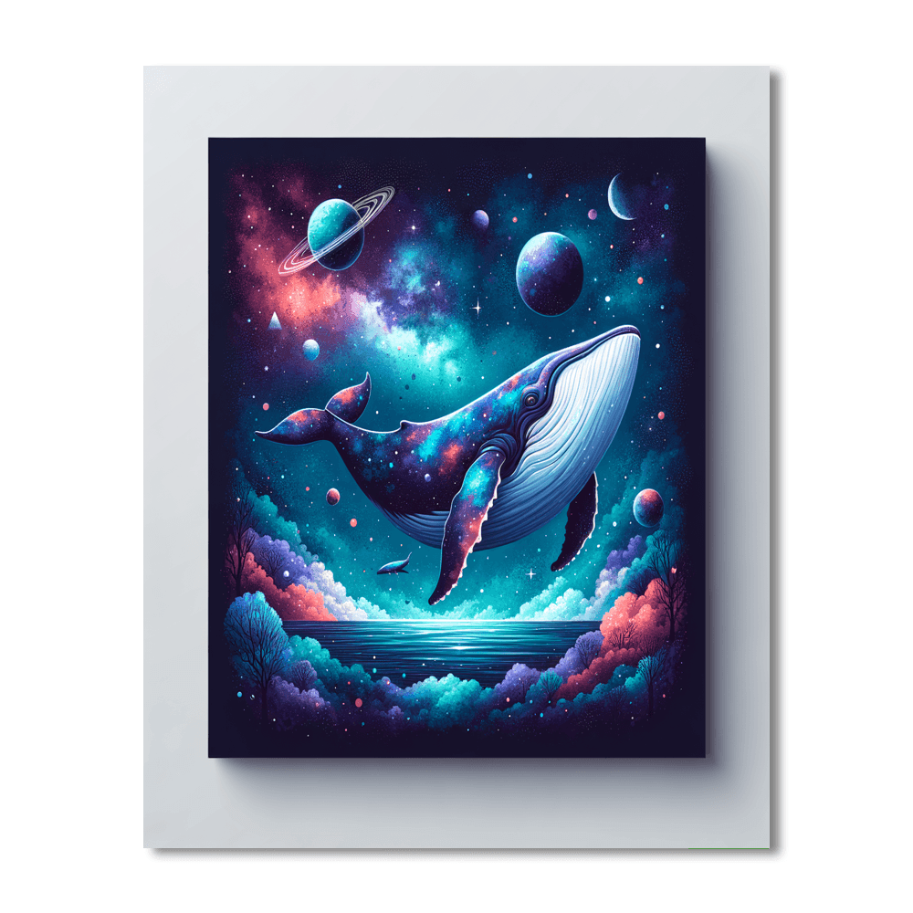 Dive into the depths of the ocean with the Celestial Whale Song art piece. A majestic whale swims gracefully among celestial bodies like stars and planets, creating a harmonious and mystical scene. The cosmic color palette of deep blues, purples, and teals adds a sense of wonder and magic to the artwork. Perfect for those who feel a deep connection to the sea and the cosmos.