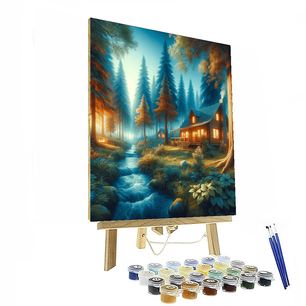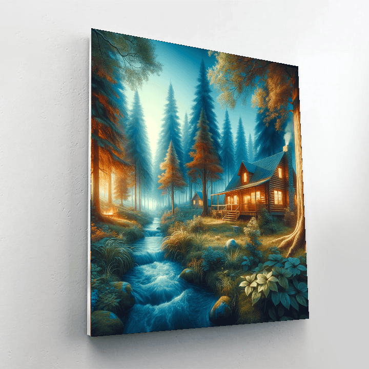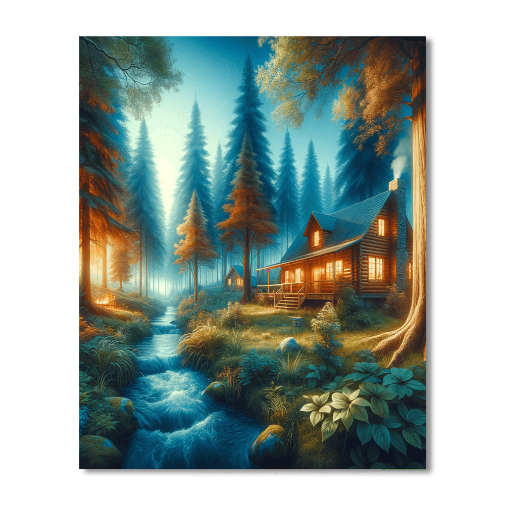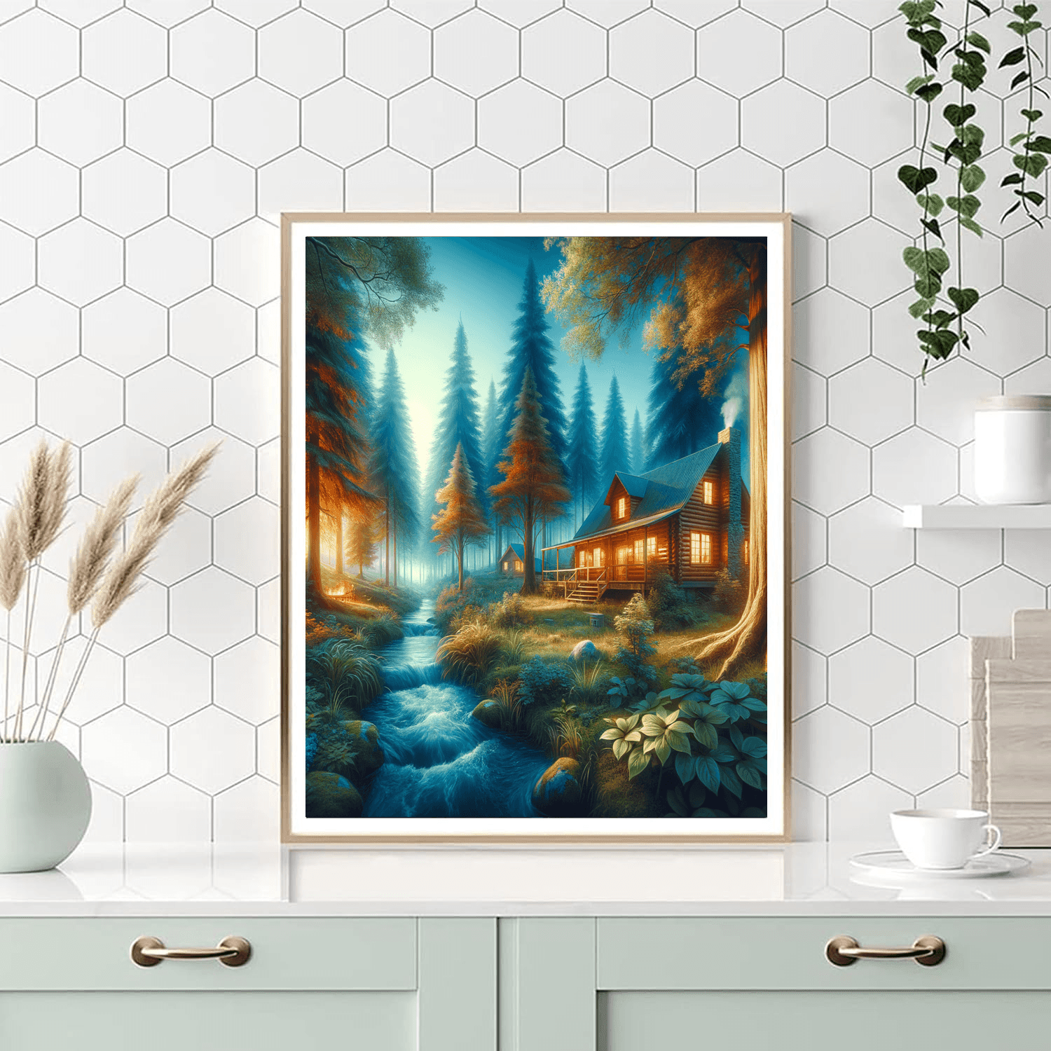 Bring the warmth of a cozy cabin into your home with this charming design featuring a rustic cabin surrounded by nature. Ideal for living rooms or reading nooks, this artwork invites relaxation and comfort.
