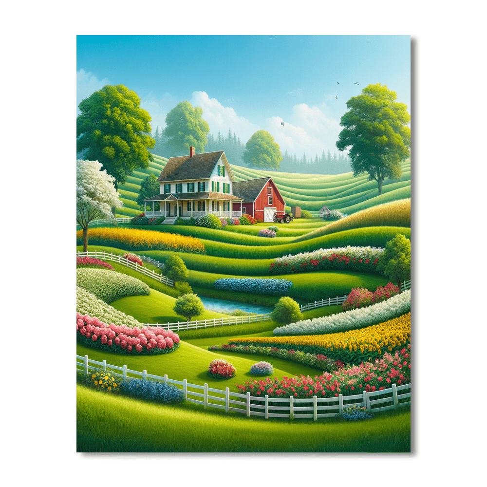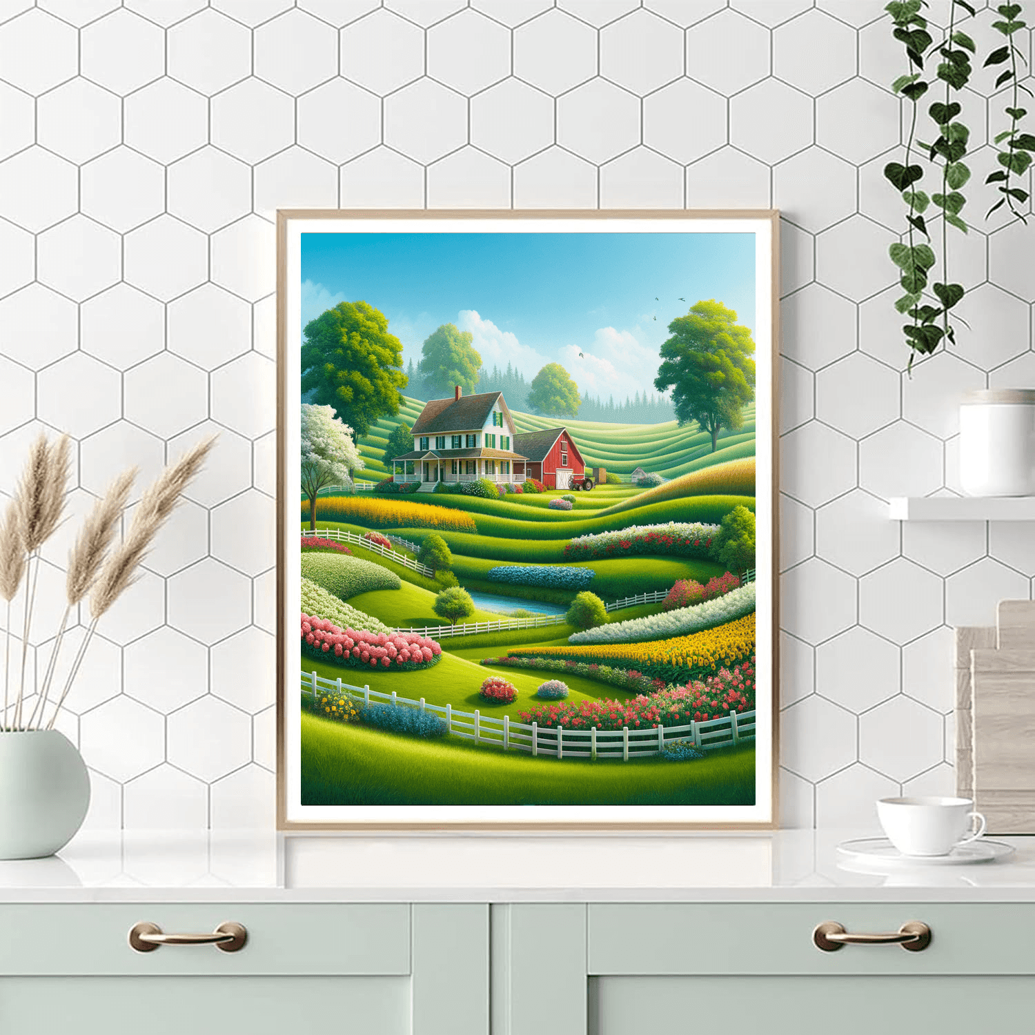 Bring the warmth of the countryside into your home with this delightful design featuring a charming farmhouse surrounded by lush fields and blooming gardens. This artwork captures the essence of rural life and is perfect for anyone who appreciates the beauty of nature. Ideal for a kitchen, living room, or any space where you want to create a cozy and inviting atmosphere.