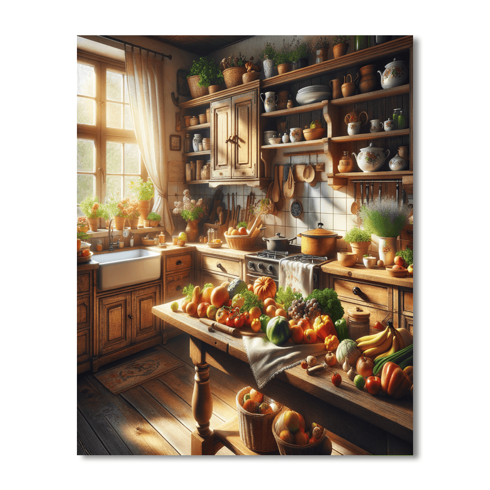 Capture the warmth of home with this delightful depiction of a farmhouse kitchen filled with fresh produce and rustic charm. Perfect for kitchens or dining areas, this piece adds a cozy touch to your home, inviting family gatherings and culinary creativity.