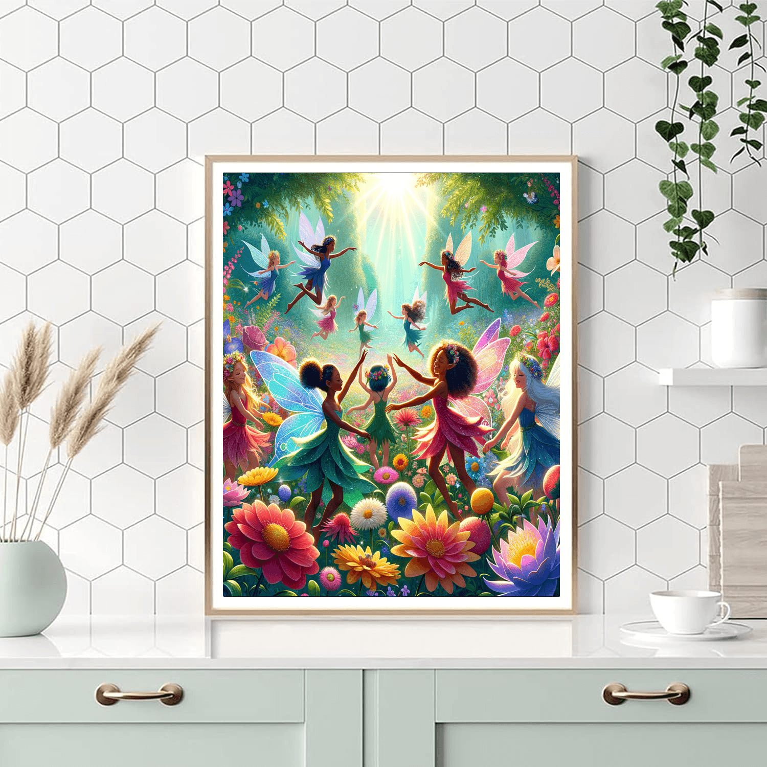 This whimsical product features enchanting fairies frolicking in a vibrant garden, perfect for childrens bedrooms or playrooms. The colorful imagery sparks imagination and creativity, making it a delightful addition to any childs space. This piece not only decorates but also inspires a love for fantasy and adventure, encouraging young minds to explore their creativity.