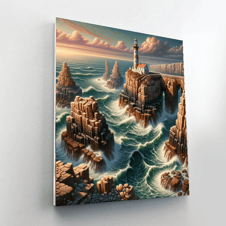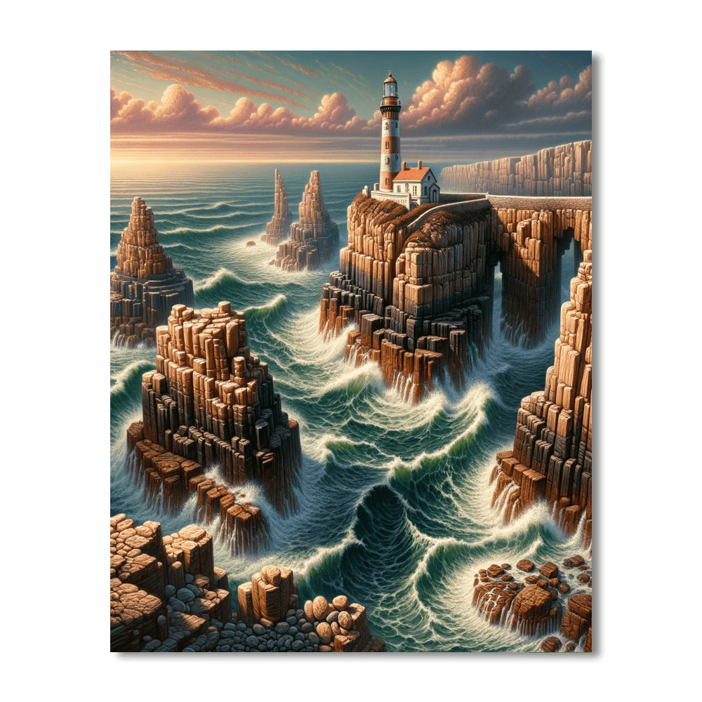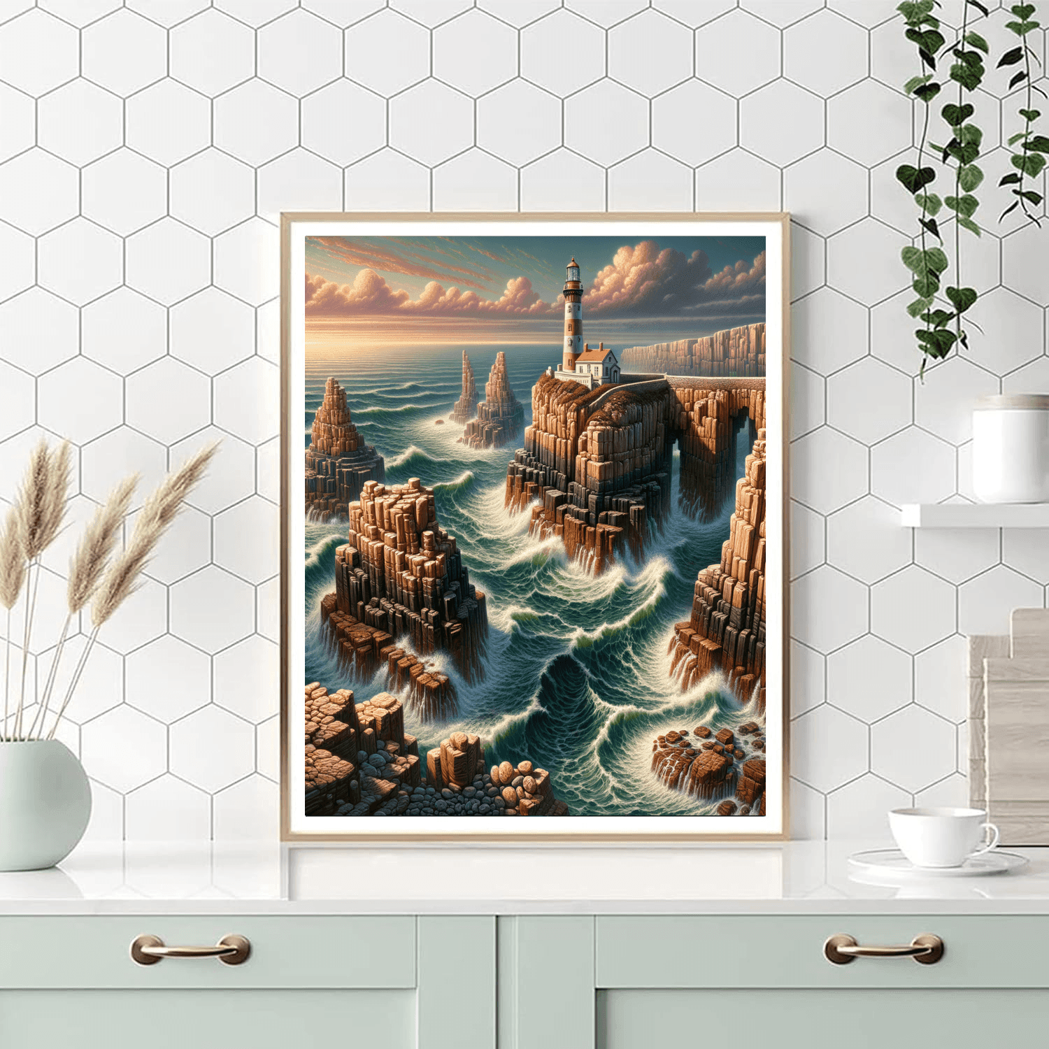Capture the serene beauty of a coastal lighthouse with this product. It features a picturesque scene with a charming lighthouse, rocky cliffs, and crashing waves. Perfect for adding a touch of coastal charm to your living room or bathroom.