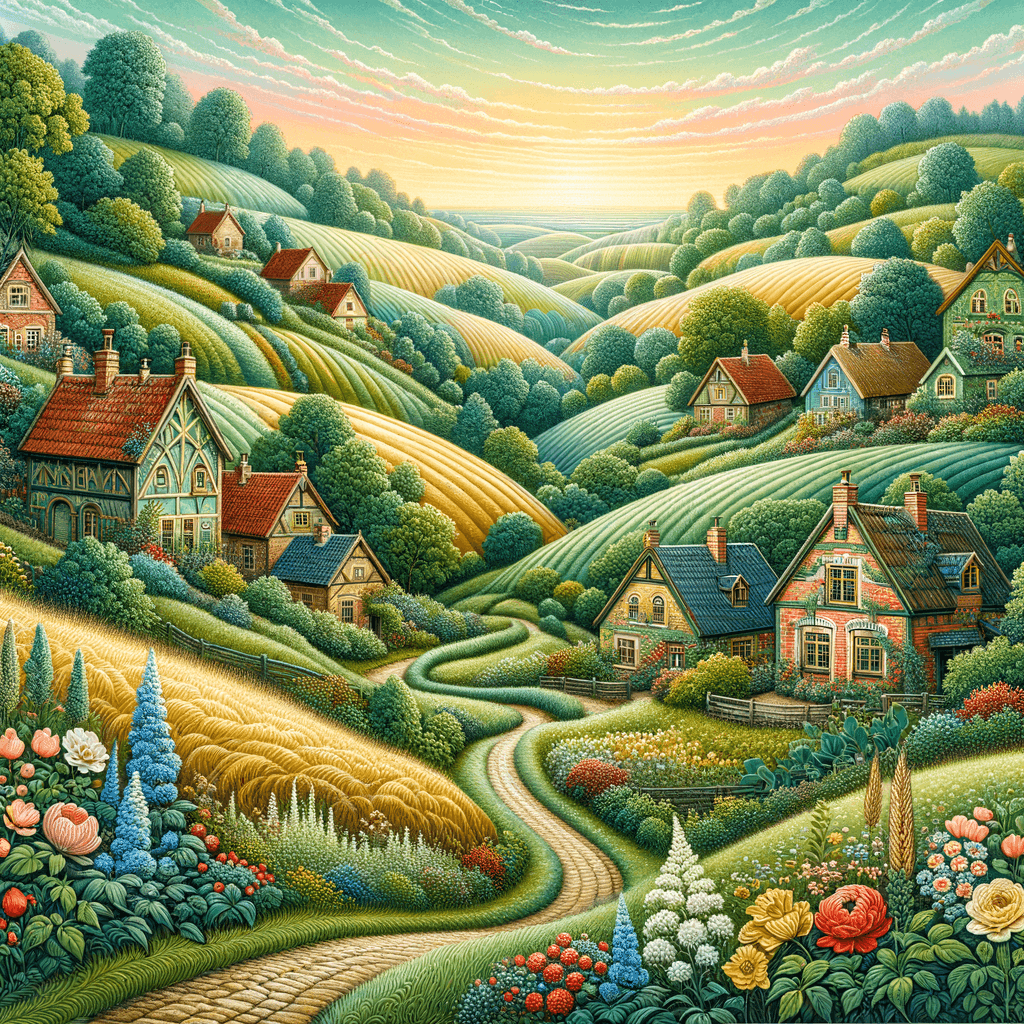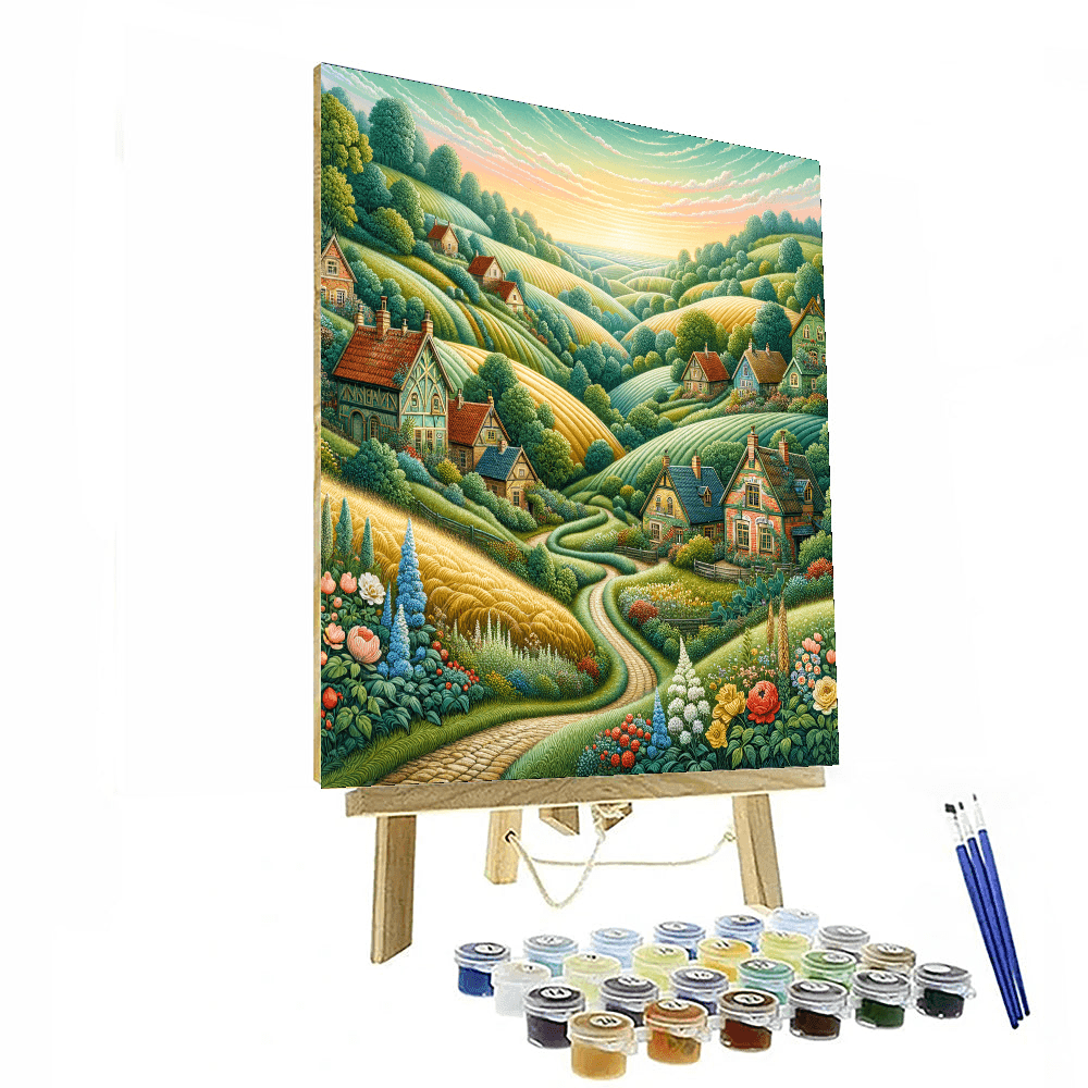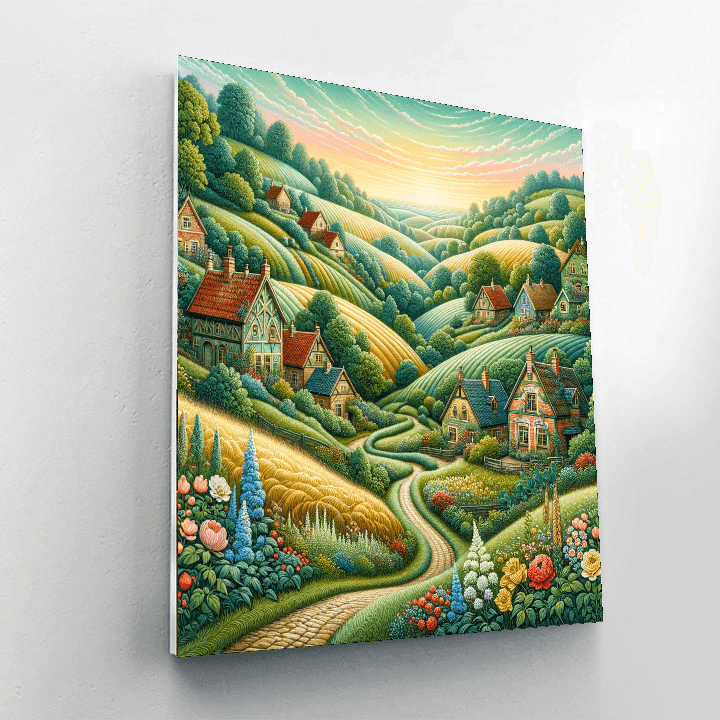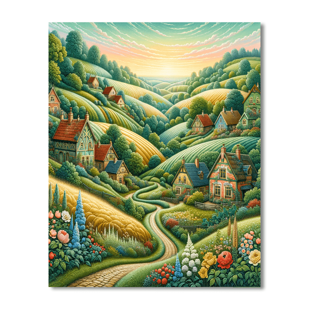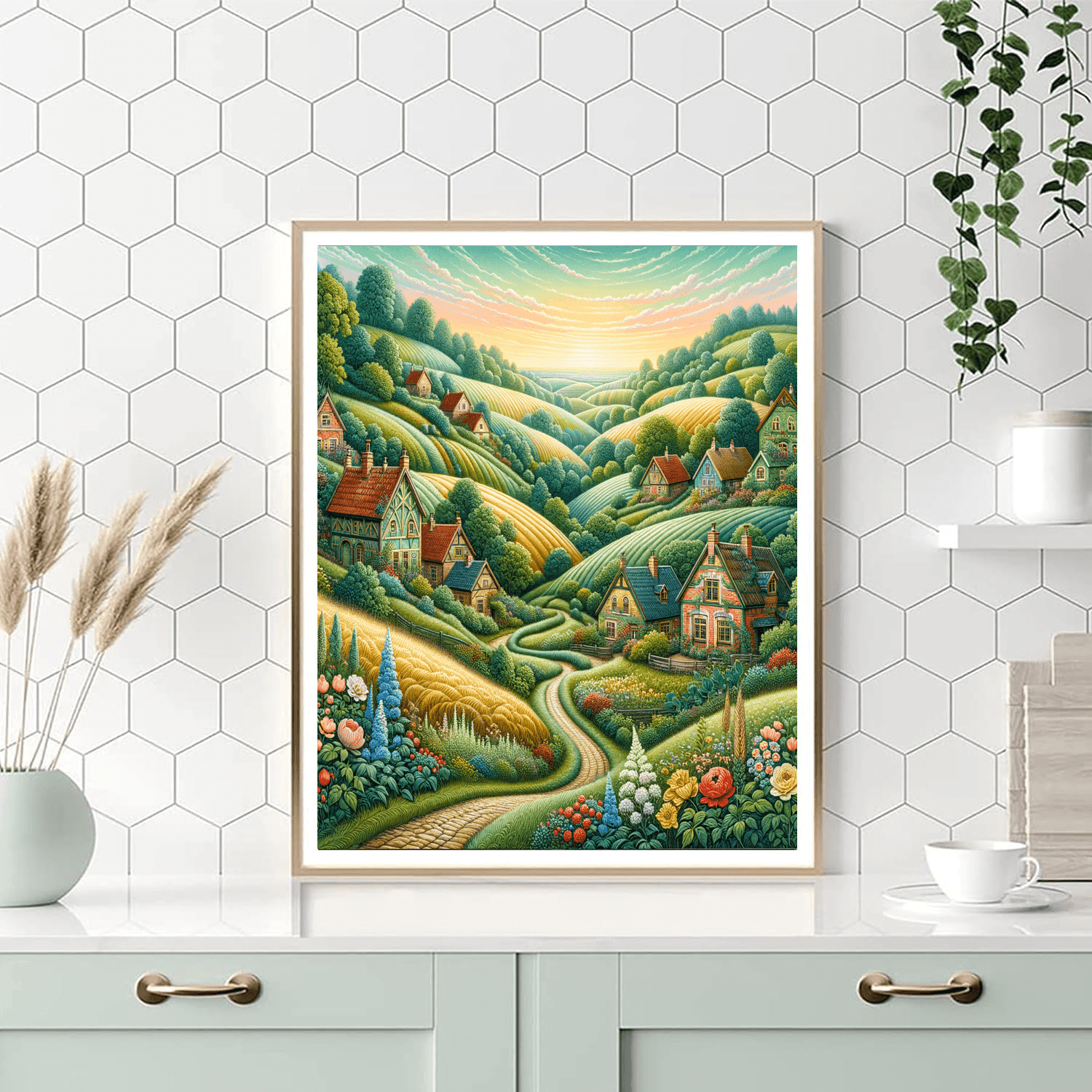 Transport yourself to a quaint village with this charming depiction of rolling hills and cozy cottages. The warm colors and inviting scenery create a sense of comfort and nostalgia, making it an ideal choice for those who appreciate the beauty of rural life. This product serves as a wonderful creative outlet while also enhancing the decor of any room. Perfect for living rooms, studies, or hallways, it brings a touch of warmth and charm to your home.