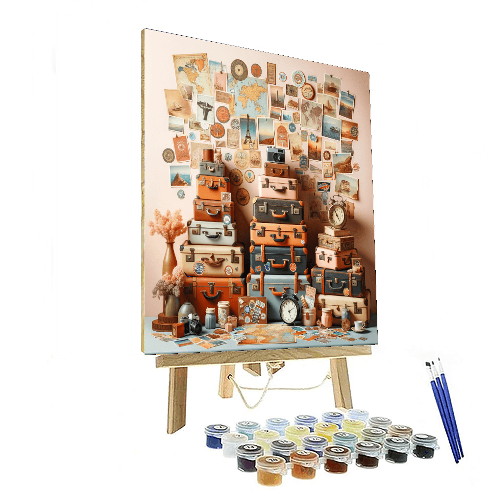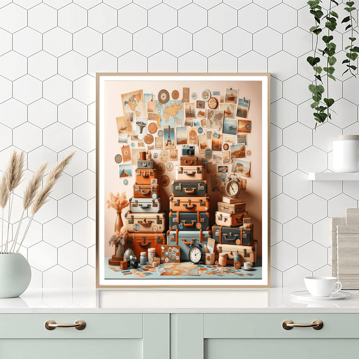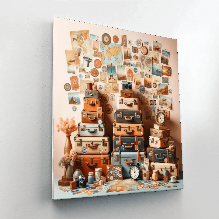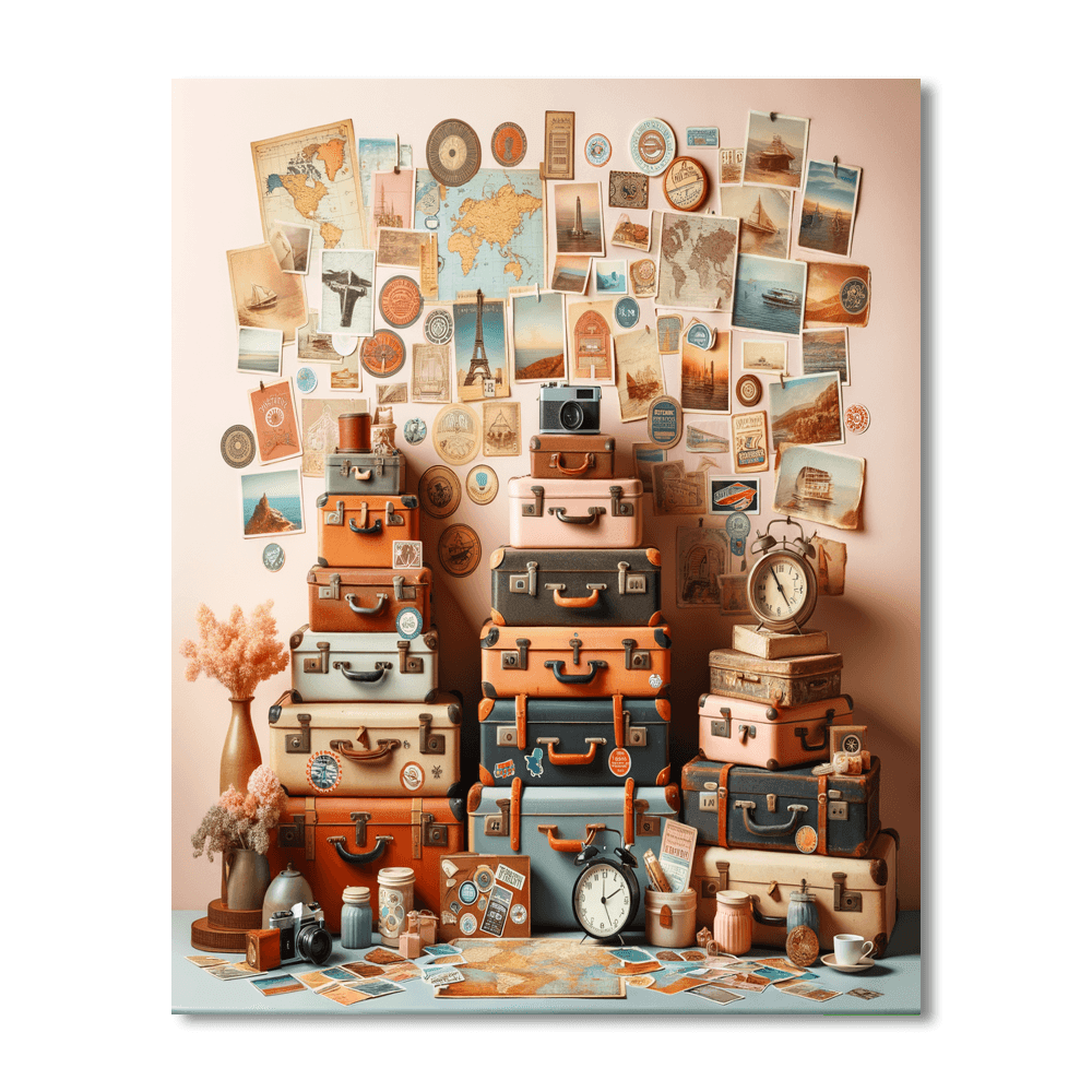Celebrate the joy of travel with this delightful artwork featuring vintage suitcases and travel memorabilia. Perfect for living rooms or home offices, it adds a touch of nostalgia and adventure to any space. Ideal for those who love exploring new places, it serves as a beautiful reminder of the joy of discovery.