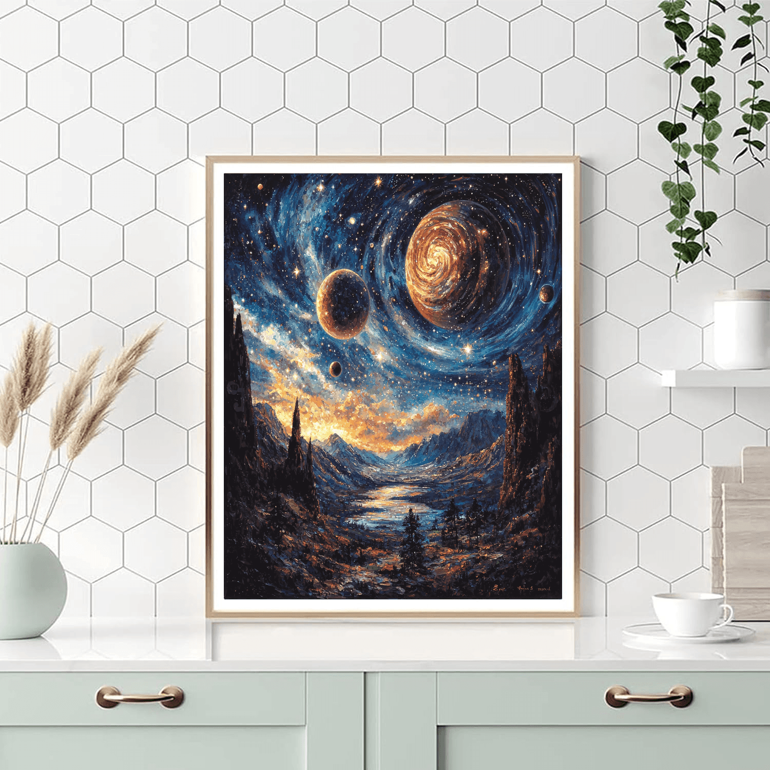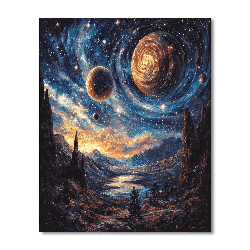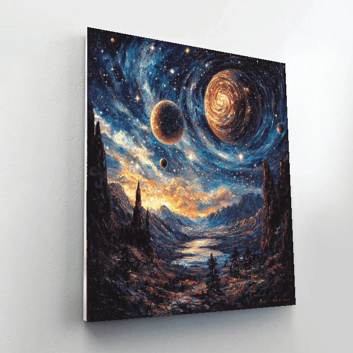 Embark on a celestial journey with this captivating painting inspired by planetary exploration. The cosmic beauty of the planets and the vastness of space create a sense of awe and curiosity. Ideal for adding a touch of cosmic wonder to your home decor.