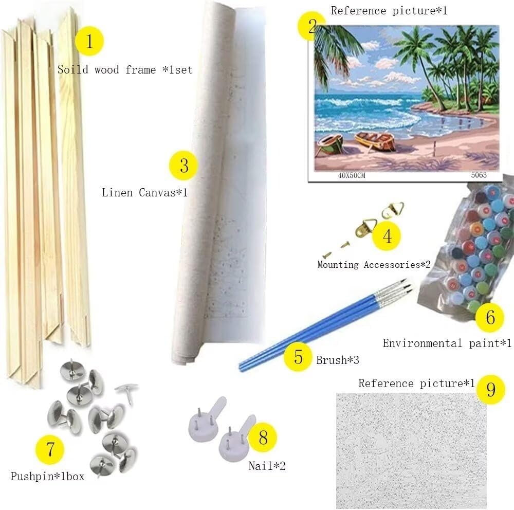 All-Inclusive Kit: Includes a 16x20-inch pre-printed linen canvas, a complete set of acrylic paints, three brushes (small, medium, large), wall-mount hooks, and screws for easy display.