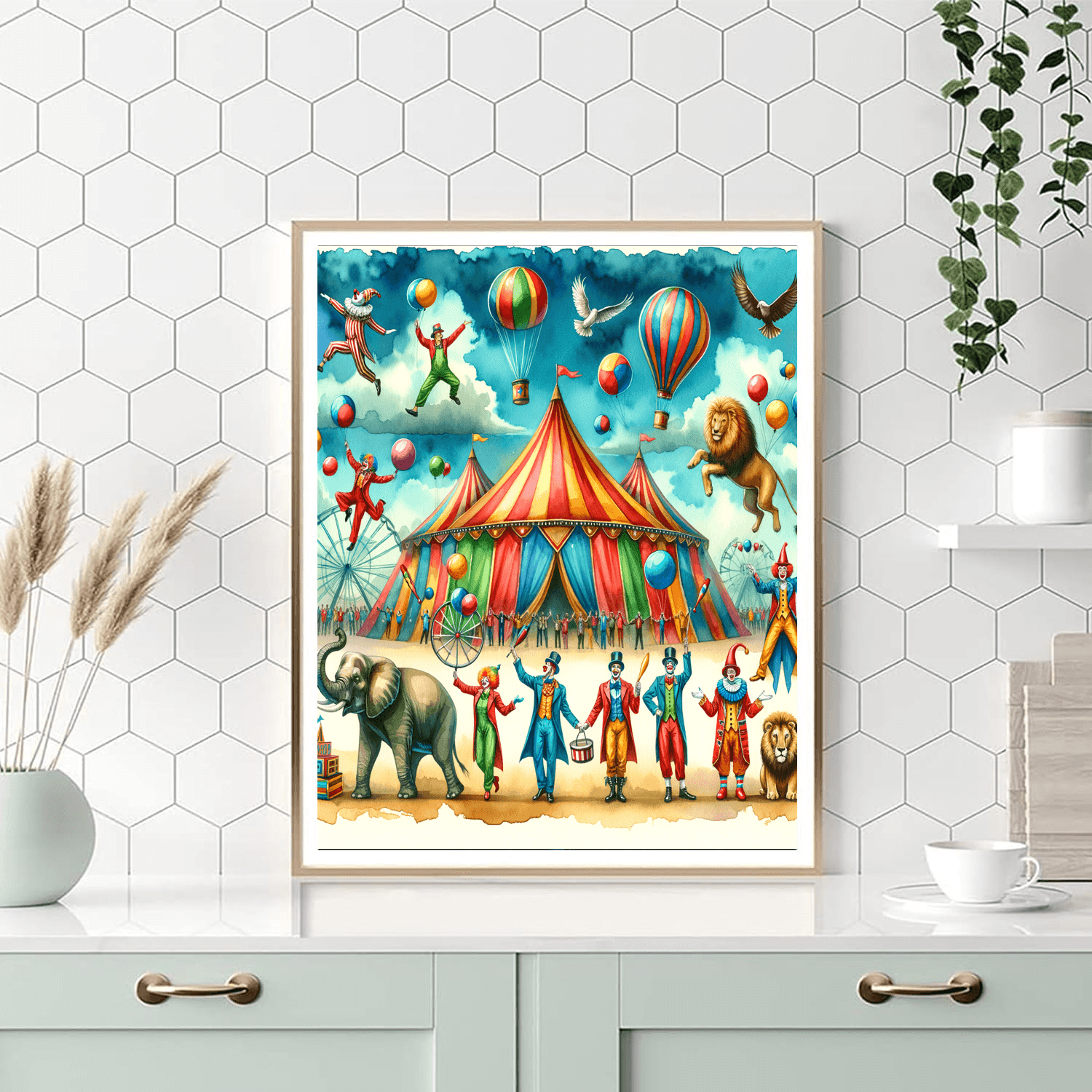 This product features a lively circus scene with clowns, acrobats, and animals performing tricks. Its perfect for kids who love the excitement and fun of the circus. This can be a great addition to a kids bedroom or playroom, creating a joyful and entertaining atmosphere.