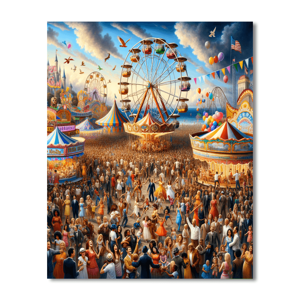 Experience the joy and excitement of a carnival with this vibrant artwork. Featuring colorful rides, festive decorations, and cheerful crowds, this piece captures the essence of fun and celebration. Perfect for a childs bedroom or playroom, it sparks creativity and imagination. The lively colors and playful composition create an inviting atmosphere that encourages fun and exploration. This piece serves as a celebration of joy and the happiness found in shared experiences.