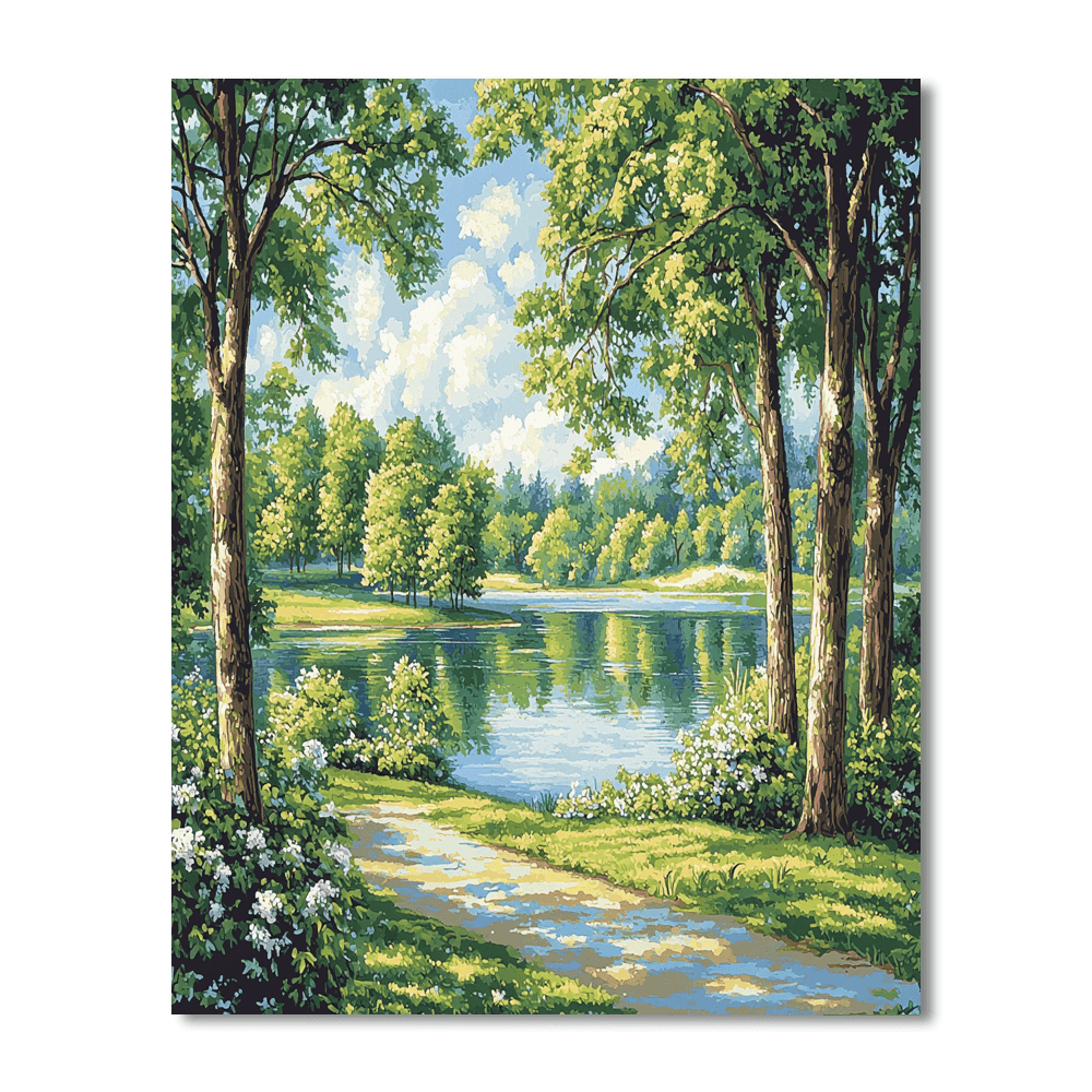 Bring the tranquility of a serene lakeside into your home with this beautiful piece. Perfect for a bedroom or living room, this artwork captures the calm beauty of a lake surrounded by lush trees. The use of soft colors and detailed brushstrokes creates a peaceful and calming atmosphere.