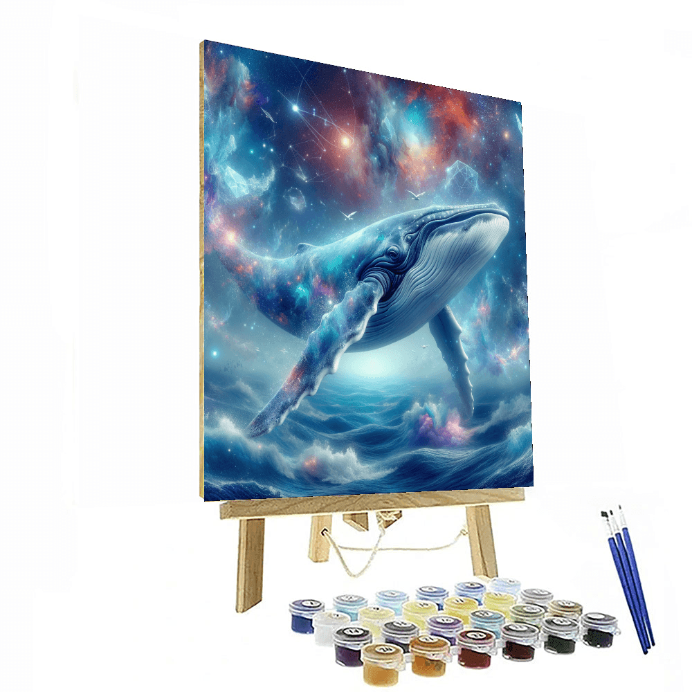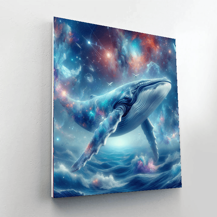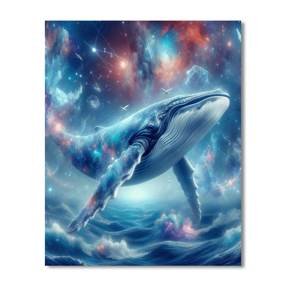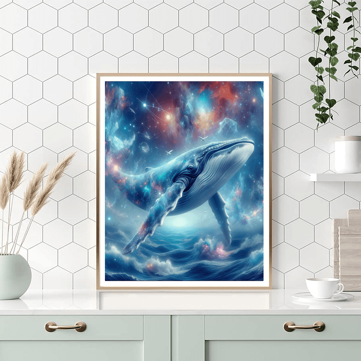 A majestic whale swimming through a cosmic ocean filled with stars and galaxies. Perfect for adding a touch of wonder to a childs bedroom or a creative studio.