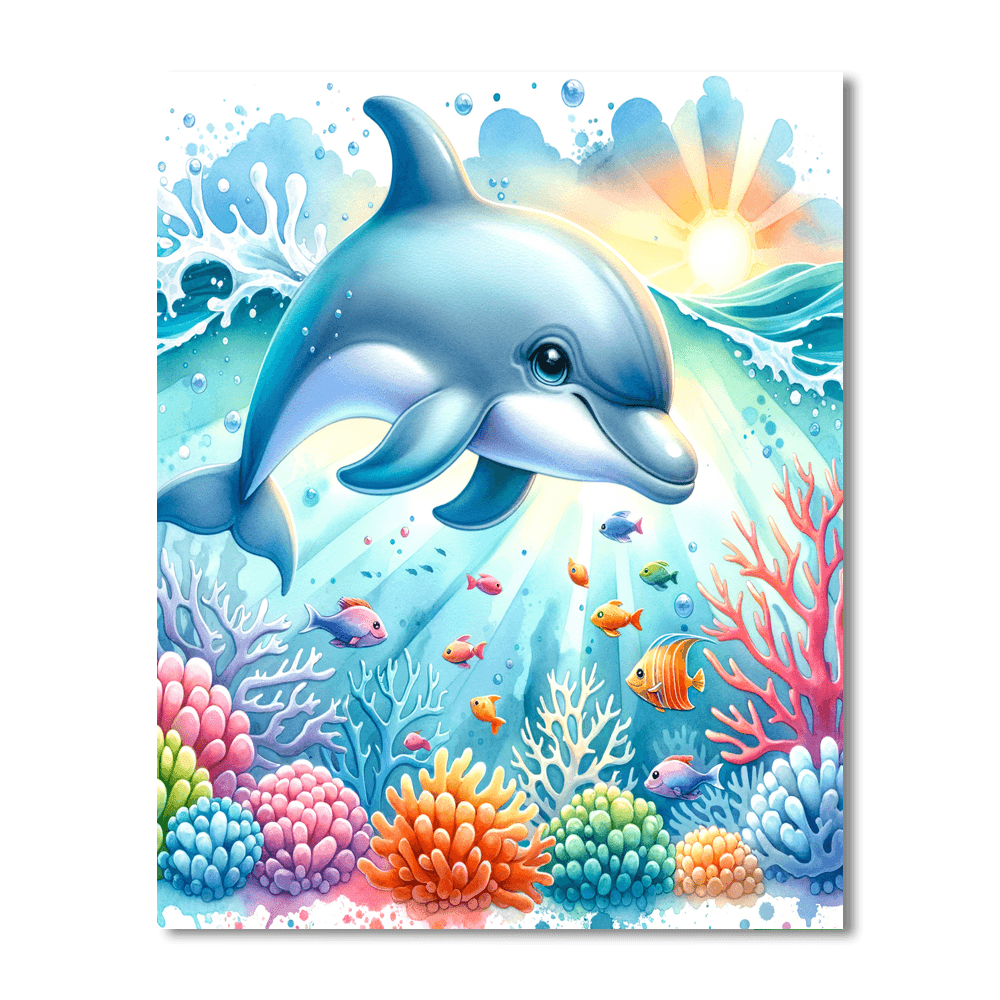 Dive into creativity with the Dazzling Dolphin! This delightful product allows kids to paint a playful dolphin swimming in a vibrant ocean. Designed for children aged 7-12, it encourages artistic expression while introducing them to the wonders of marine life. This charming scene is perfect for a childs bedroom or playroom, adding a splash of color and fun to their decor.