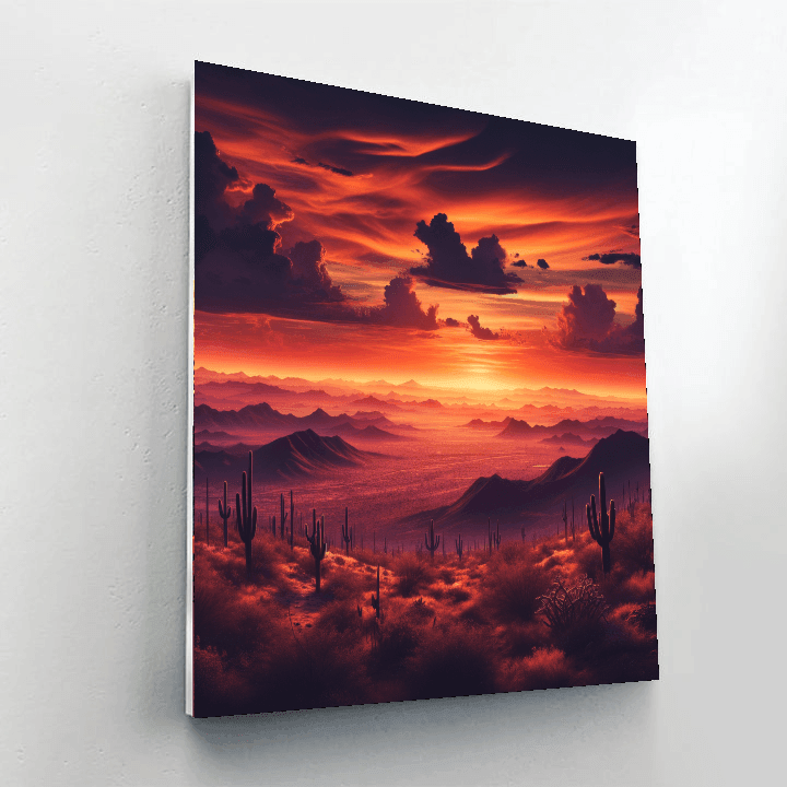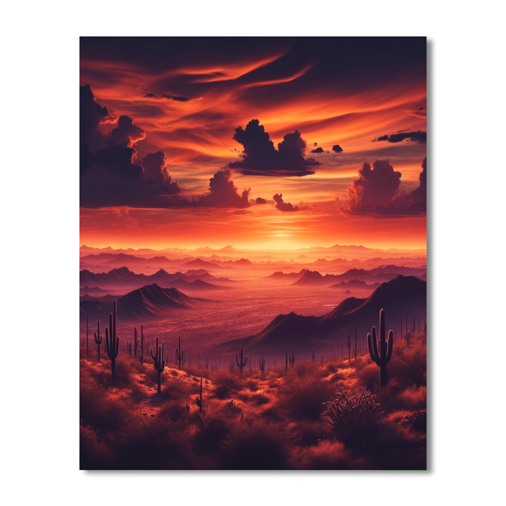 Experience the vast beauty of the desert with Desert Sunset Vista. This piece captures a breathtaking desert landscape at sunset, with vibrant hues of orange and red in the sky and the silhouettes of cacti and distant mountains. Its perfect for those who love the serene, expansive beauty of desert scenes and is ideal for adding a touch of warmth and natural beauty to any room.