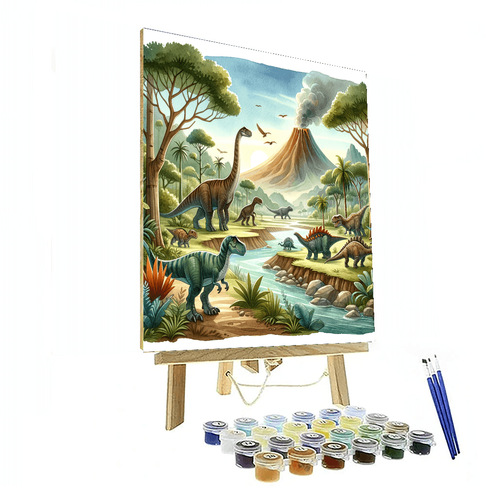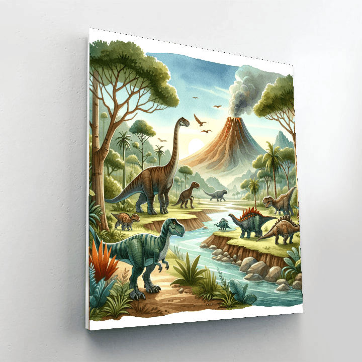 Embark on a prehistoric Dino Discovery Adventure with this educational painting. Explore the world of dinosaurs as you paint a scene filled with different species, lush greenery, and a volcano in the background. Perfect for young paleontologists in the making, this painting offers both fun and learning. Suitable for kids aged 5-14 years.