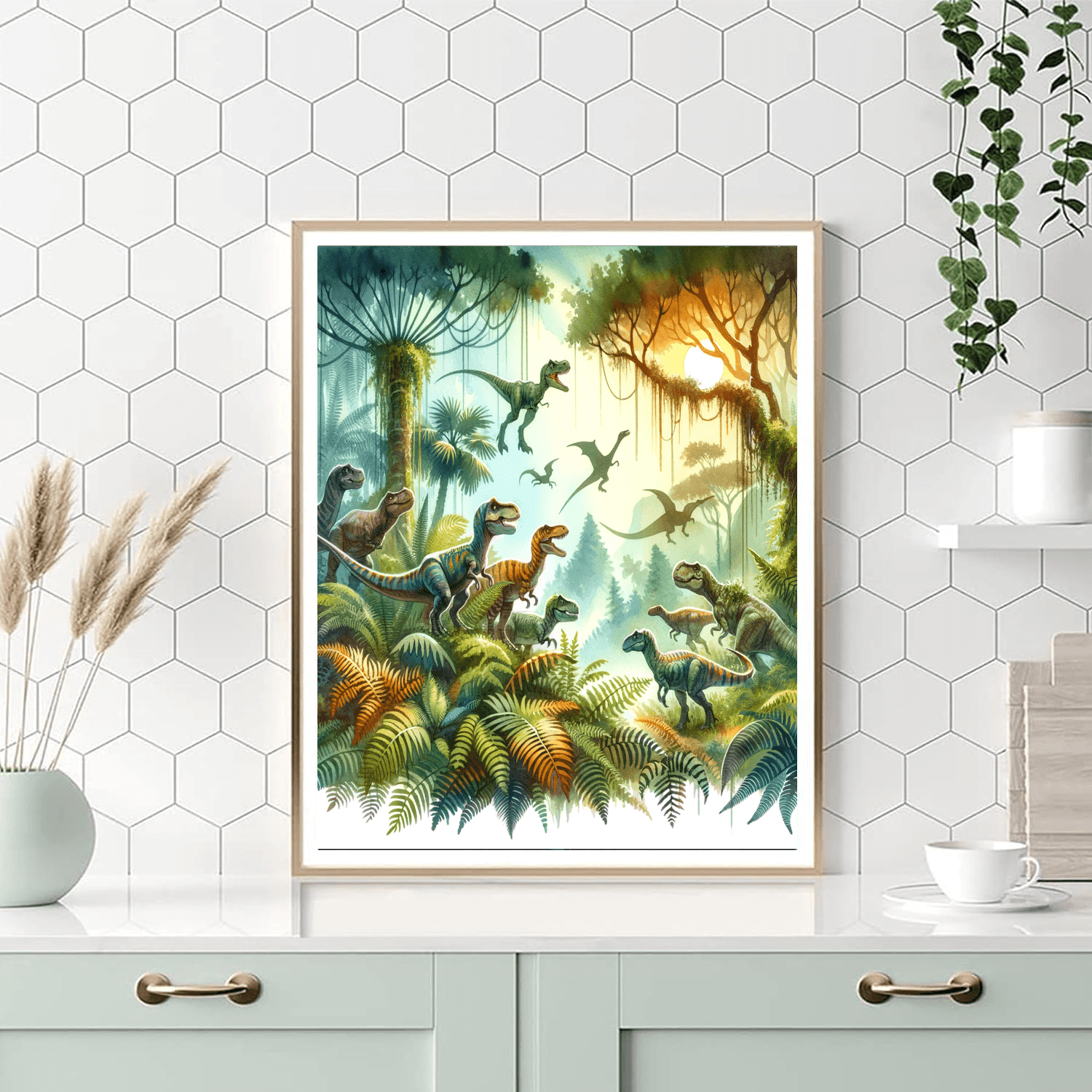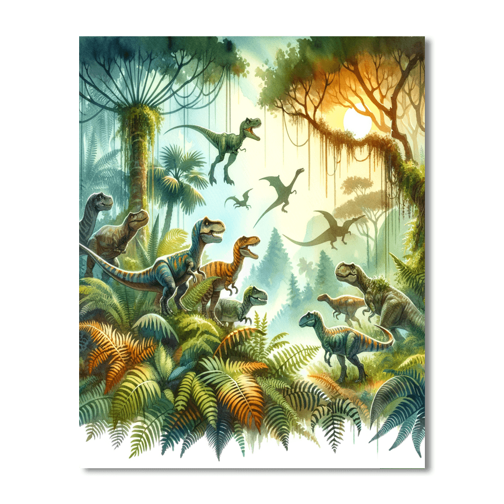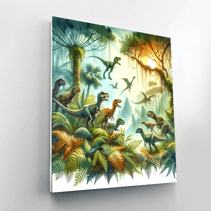 Embark on a prehistoric adventure with the Dino Discovery painting kit for kids aged 7-12. This educational artwork features various dinosaurs in a lush jungle setting, providing a fun and engaging way for children to learn about these fascinating creatures.