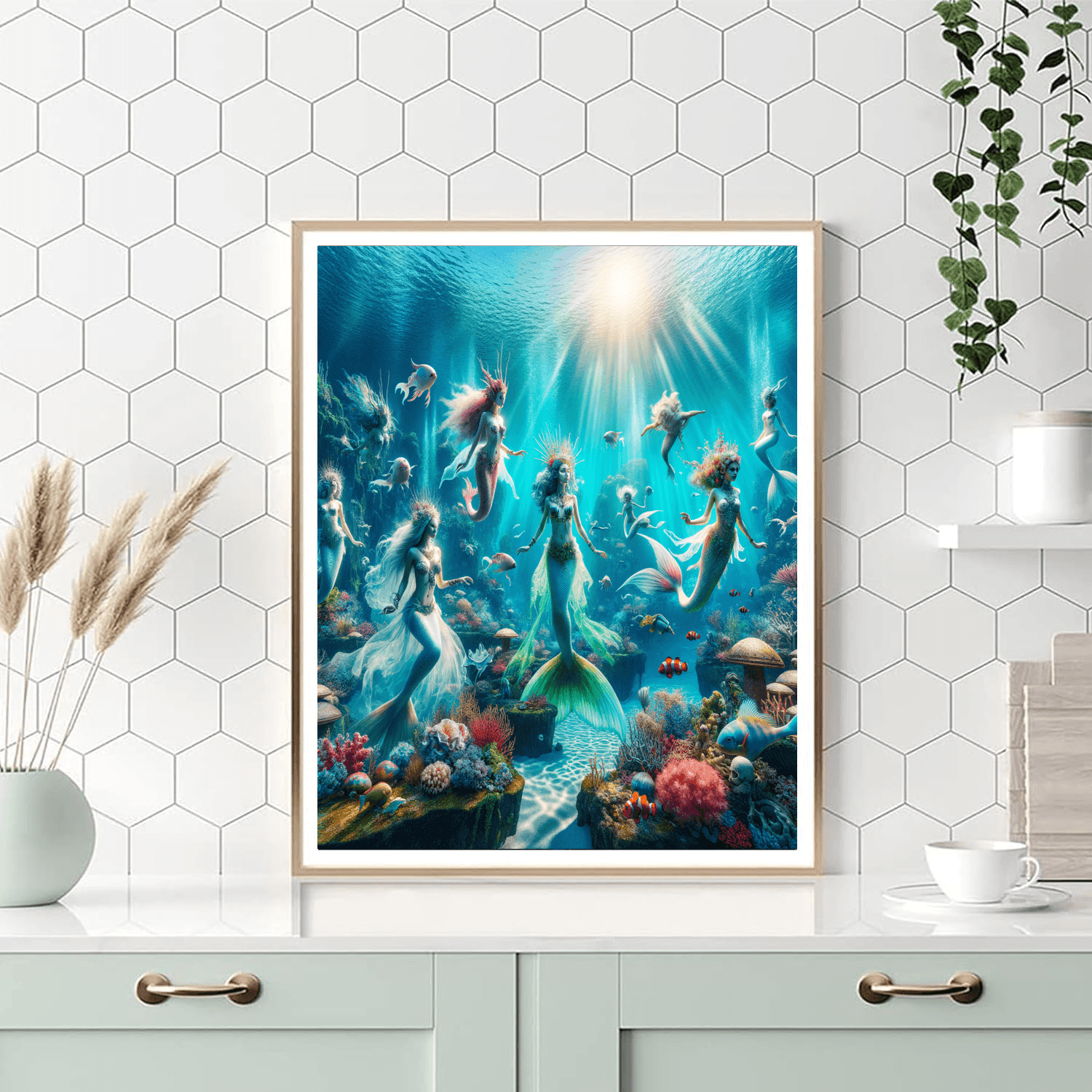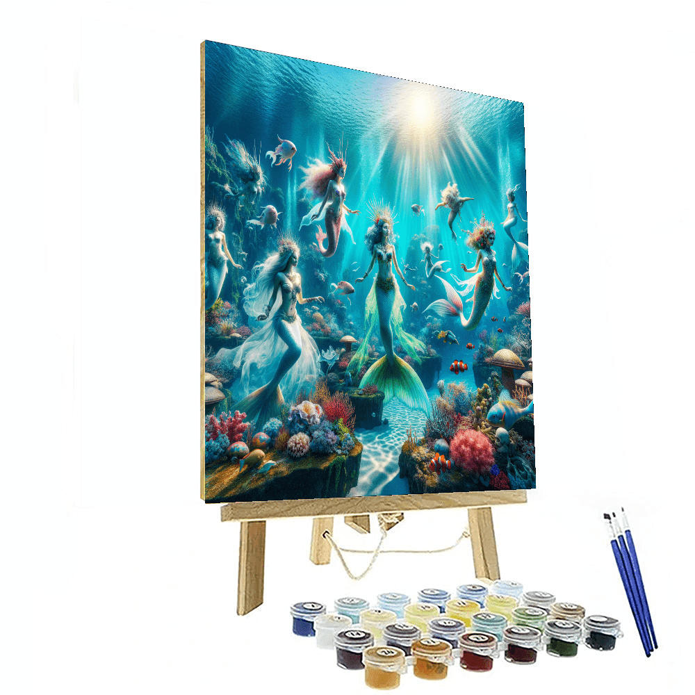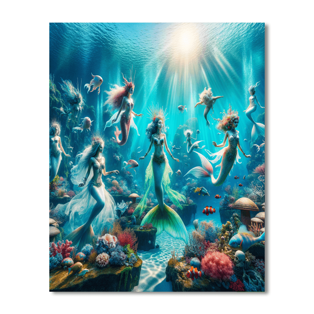 Dive into a dreamy underwater world with this enchanting painting featuring a magical mermaid lagoon teeming with colorful marine life. The whimsical scene of mermaids and sea creatures frolicking in the crystal-clear waters will transport you to a realm of fantasy and wonder. Perfect for adding a touch of aquatic magic to a childs bedroom or playroom.
