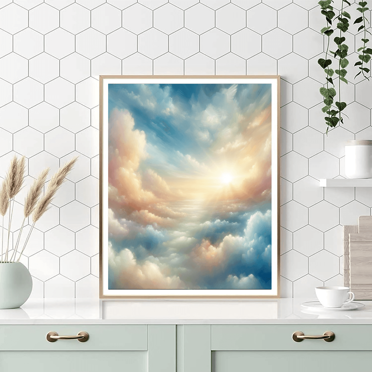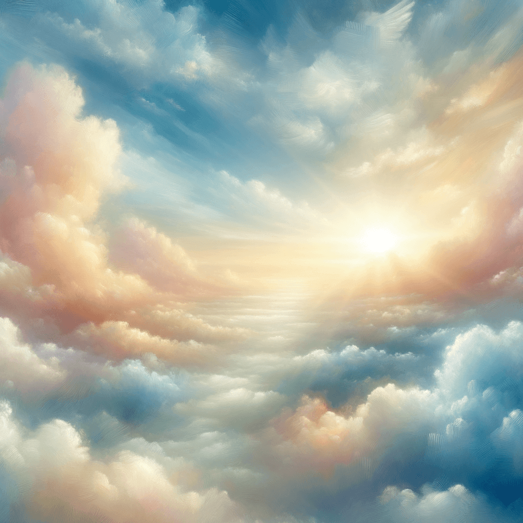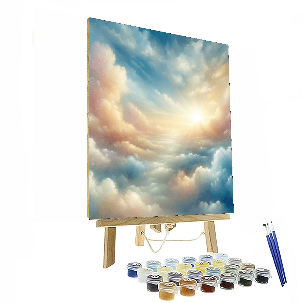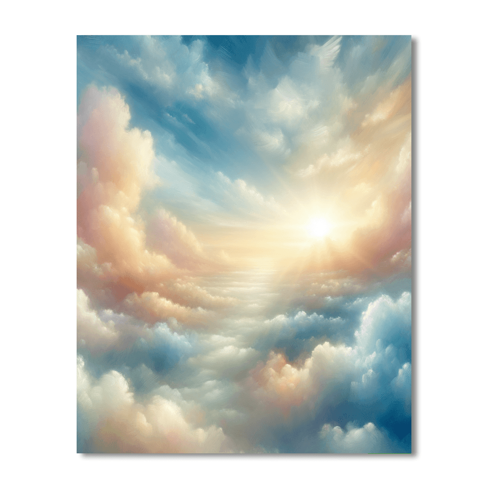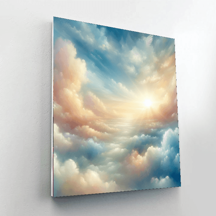Drift away on a sea of pastel clouds with this dreamy cloudscape painting. The soft hues, fluffy clouds, and gentle sunlight create a serene and ethereal atmosphere. Perfect for those who love soft, soothing colors and dreamy landscapes.