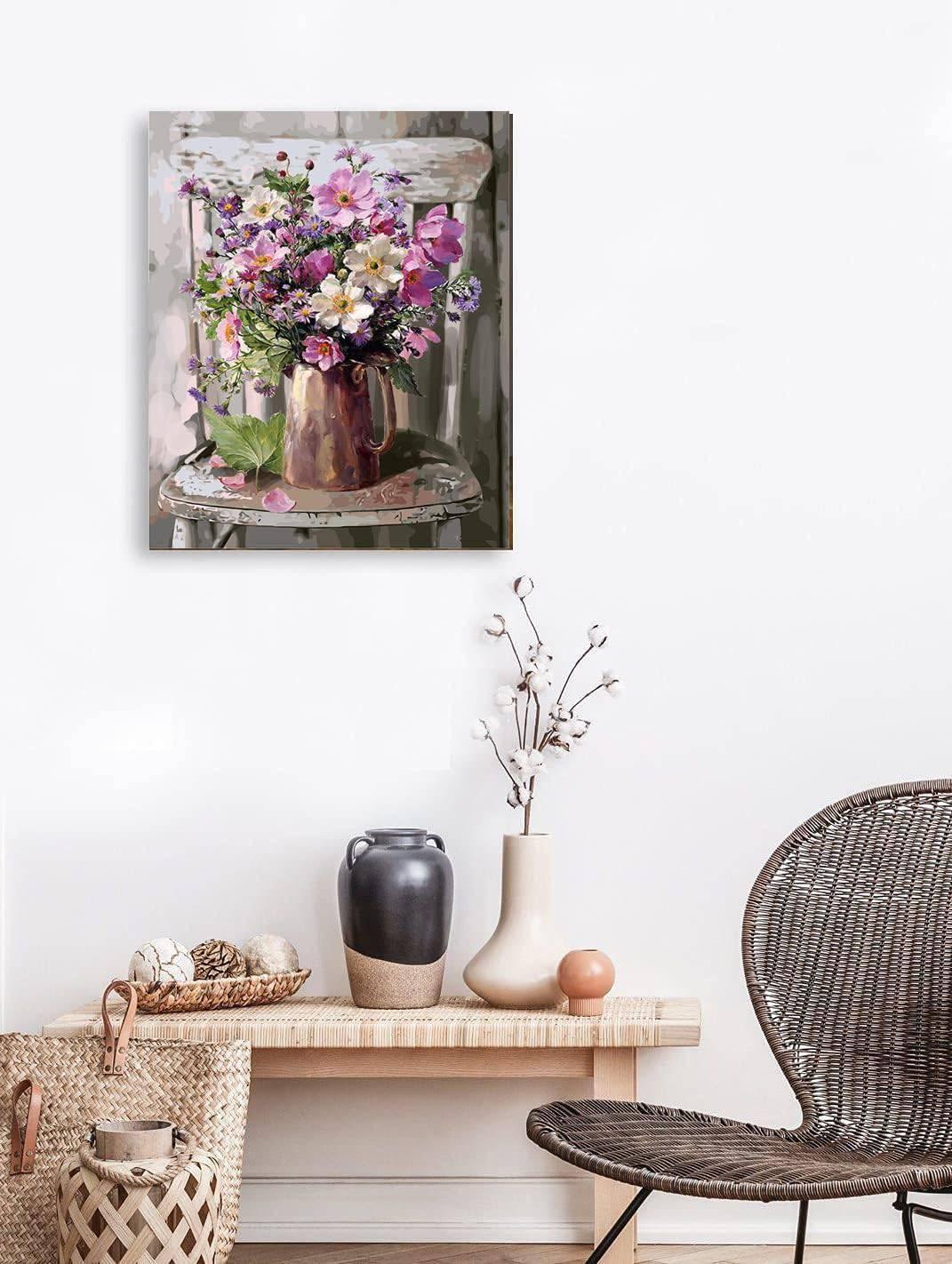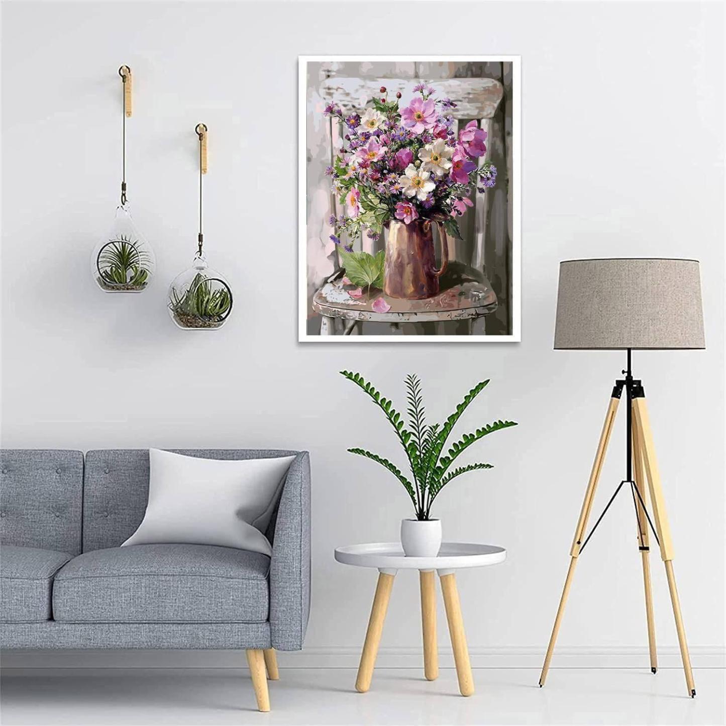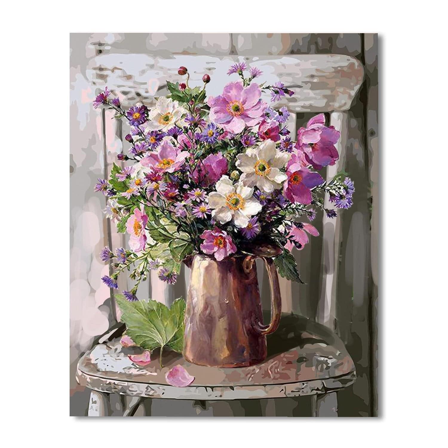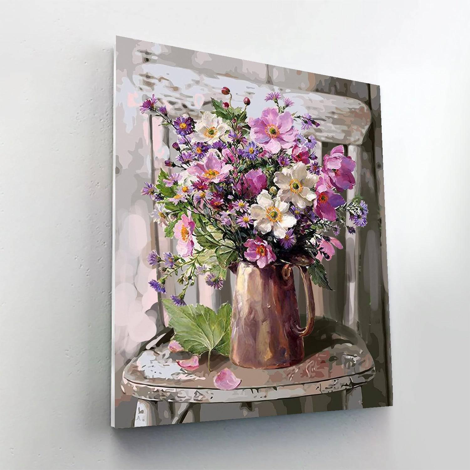 Enrich your living space with the tranquil and painterly Elegance Floral Paint By Numbers Kit. This artwork captures a timeless still-life scene, featuring a rustic metallic pitcher overflowing with a bouquet of wildflowers, all set upon a classic weathered chair, invoking the serene ambiance of a country cottage.