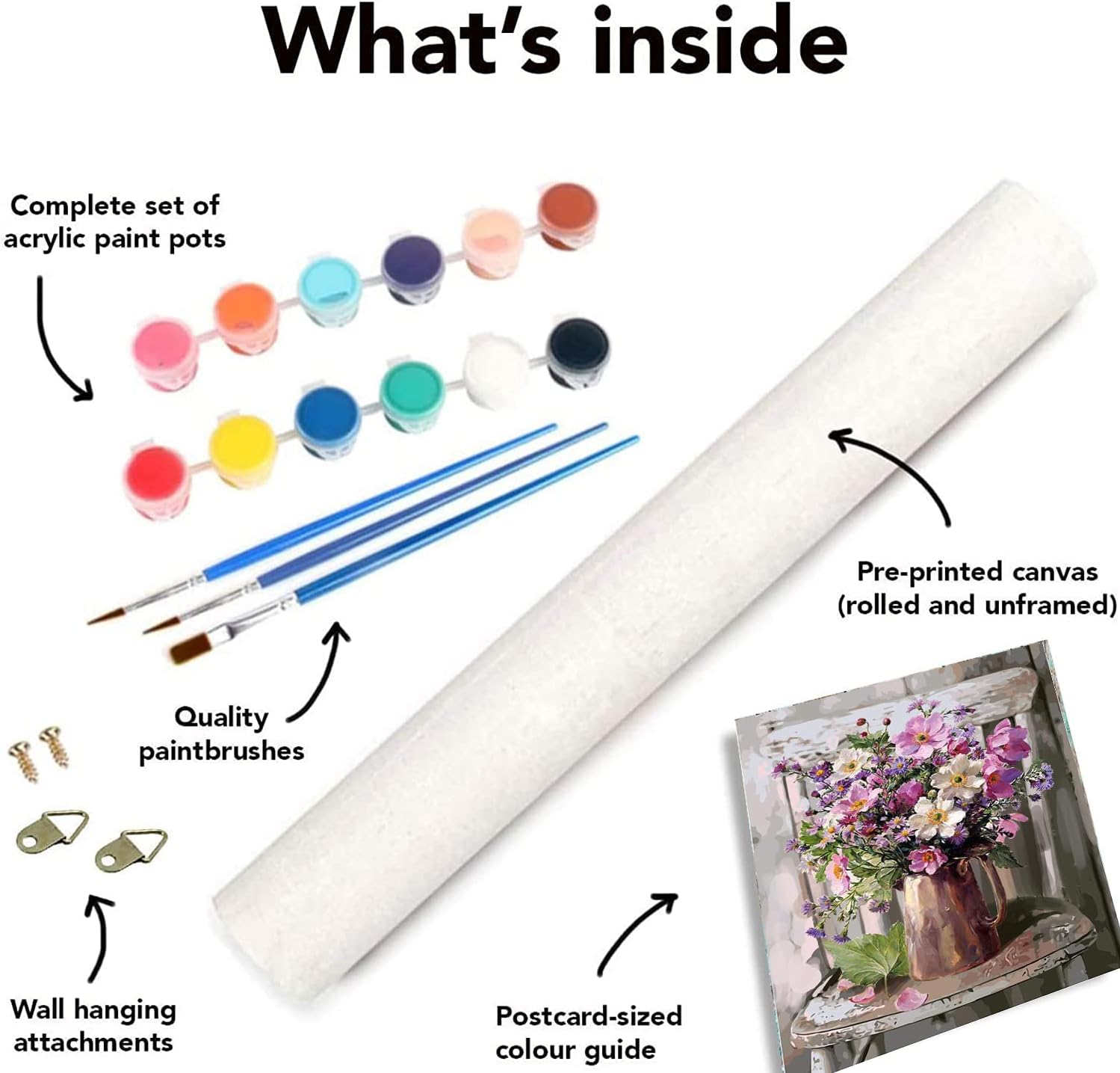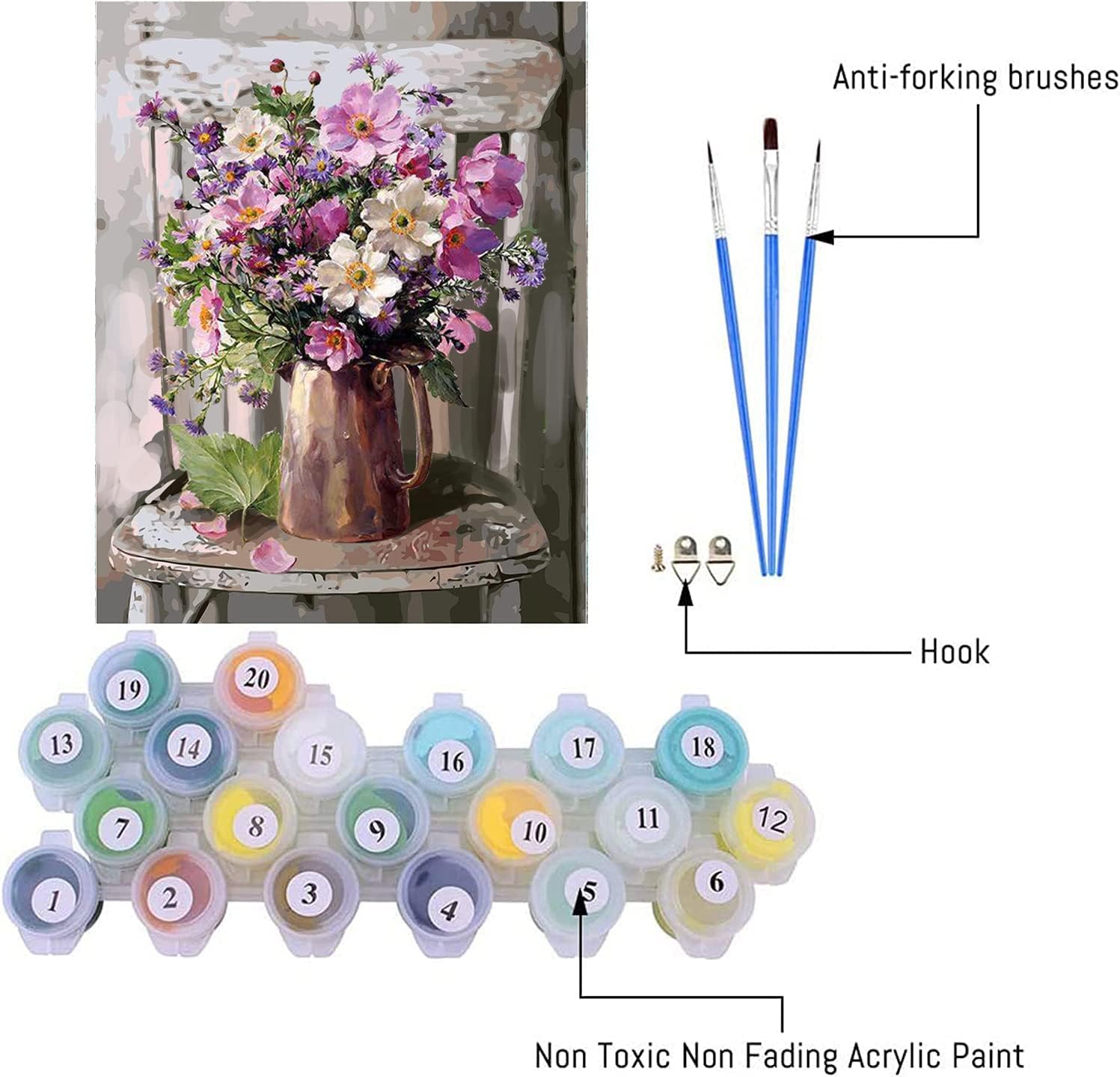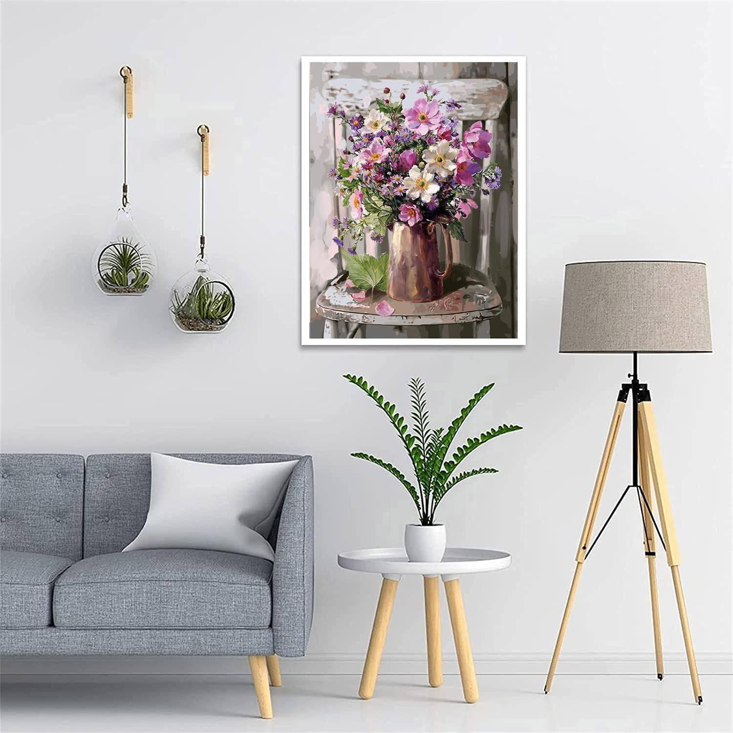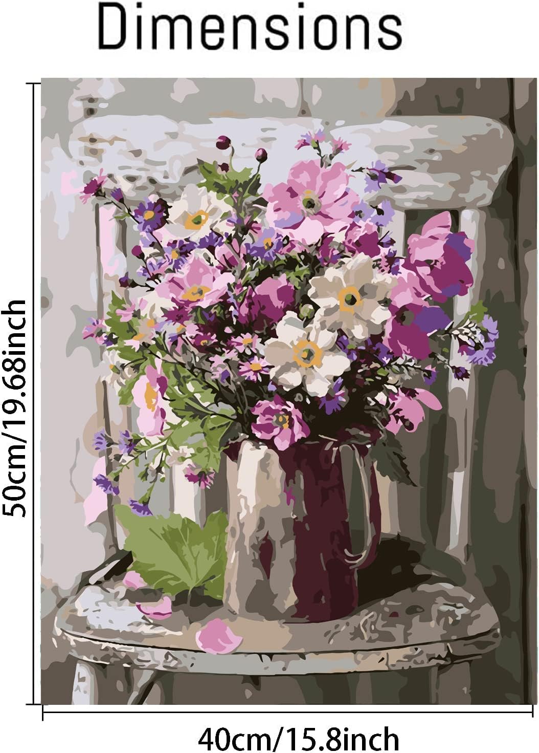 Enrich your living space with the tranquil and painterly Elegance Floral Paint By Numbers Kit. This artwork captures a timeless still-life scene, featuring a rustic metallic pitcher overflowing with a bouquet of wildflowers, all set upon a classic weathered chair, invoking the serene ambiance of a country cottage.