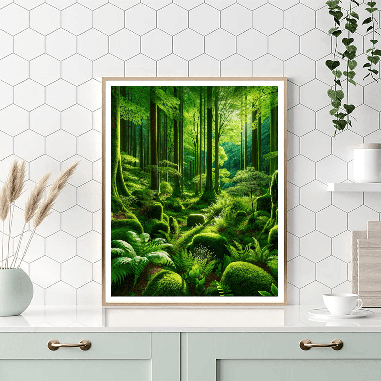 Immerse yourself in the lush beauty of the Emerald Enchanted Forest. This enchanting artwork transports you to a magical realm where emerald trees tower over a carpet of vibrant moss and delicate ferns. The rich green tones and intricate details of the forest create a sense of tranquility and wonder, making it an ideal choice for a nature-inspired space.