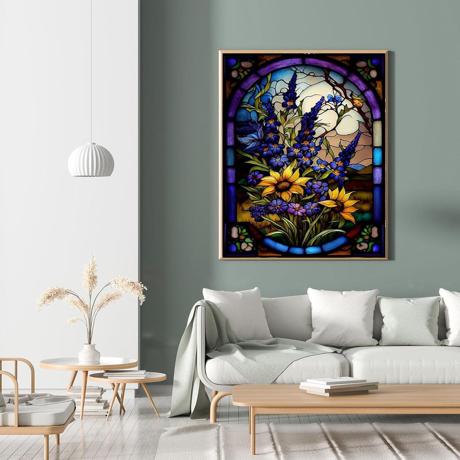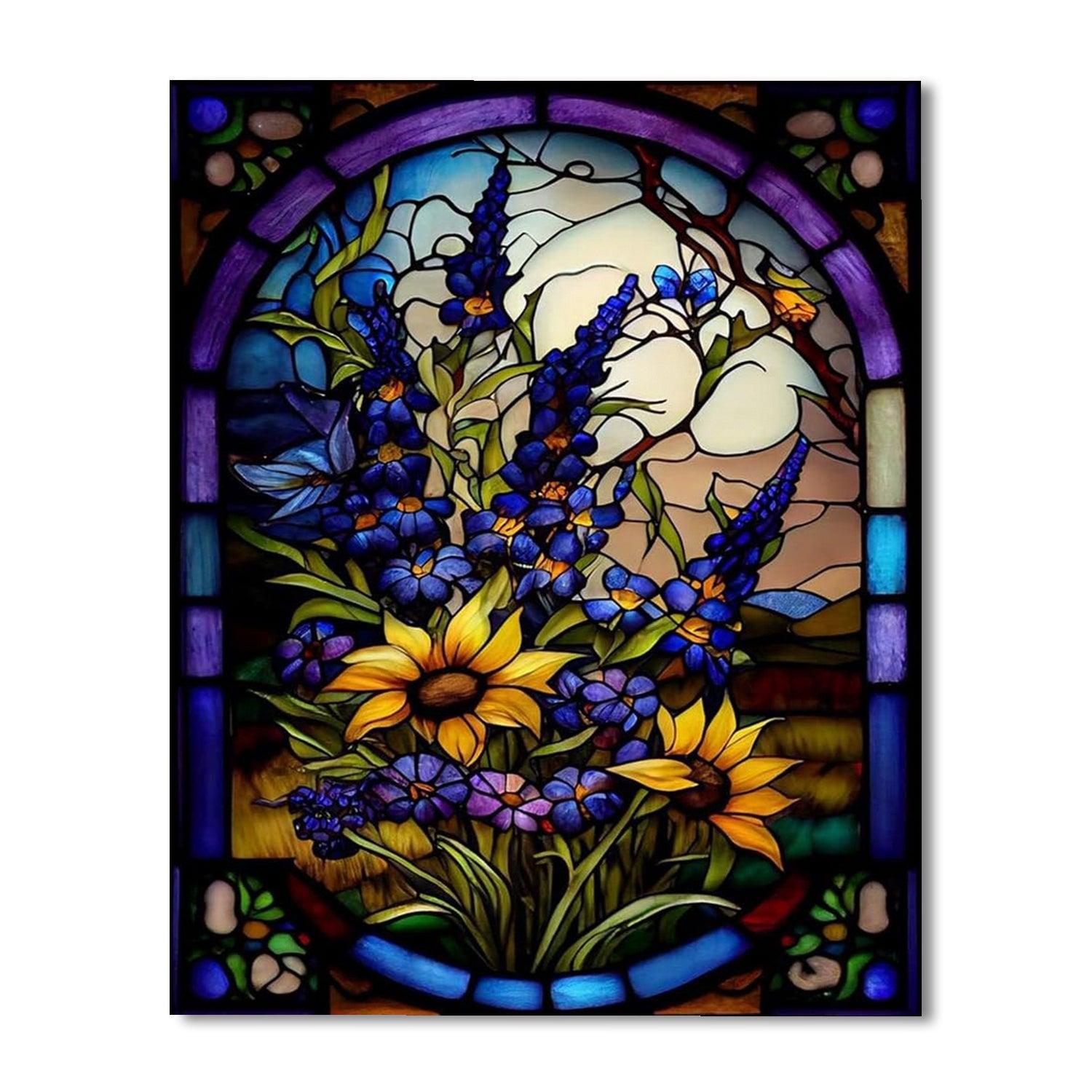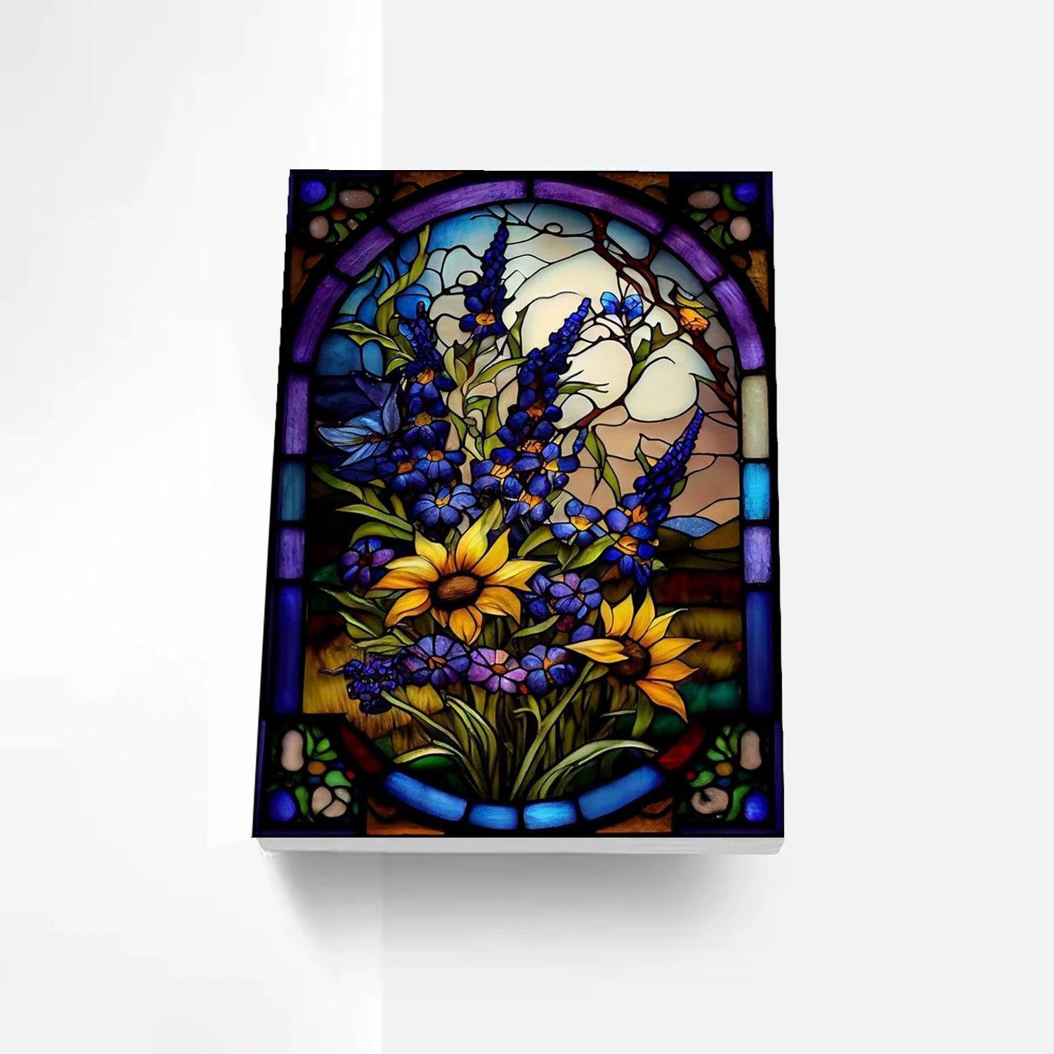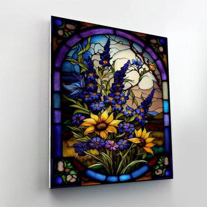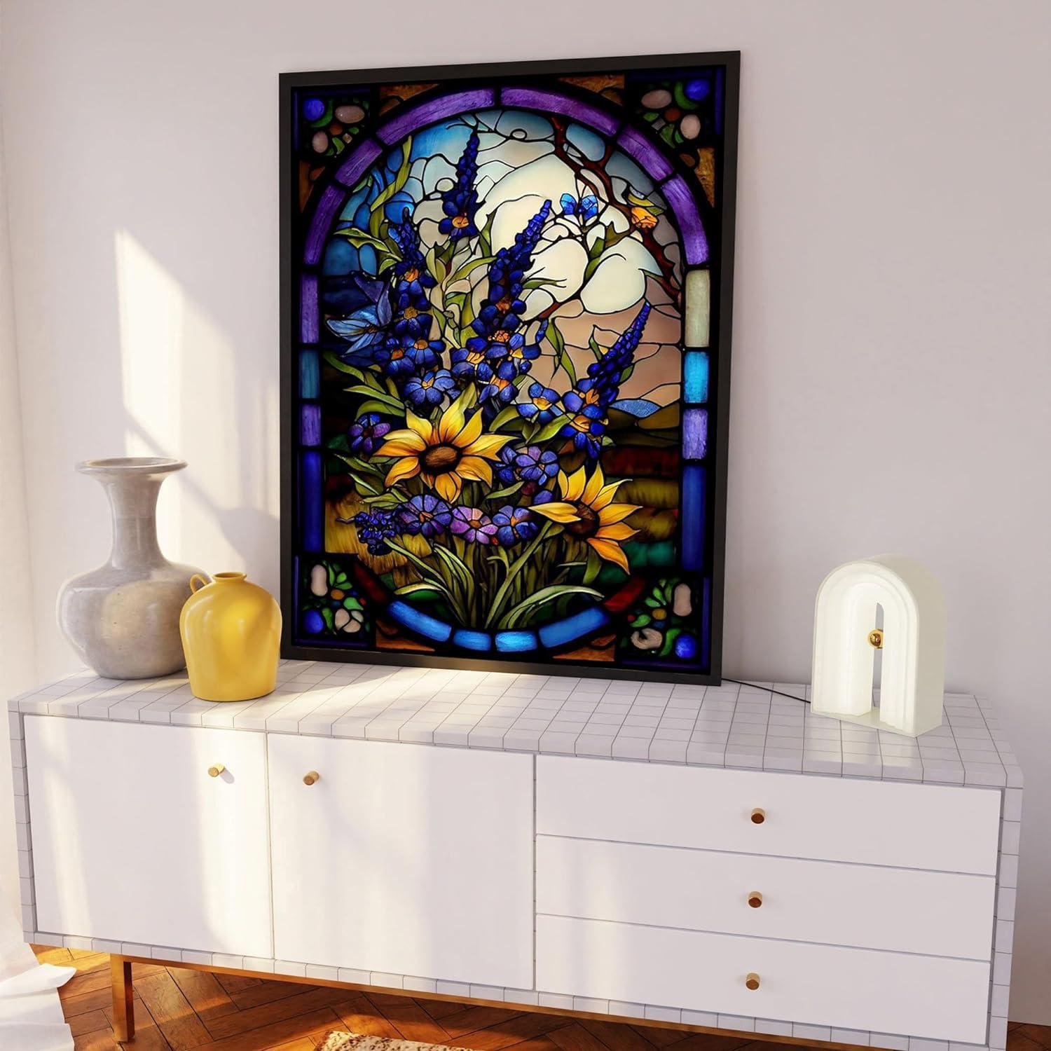 Design: The artwork, with its vibrant colors and floral subject, is designed to mimic the look of a stained glass window, bringing an element of enchantment to any decor.