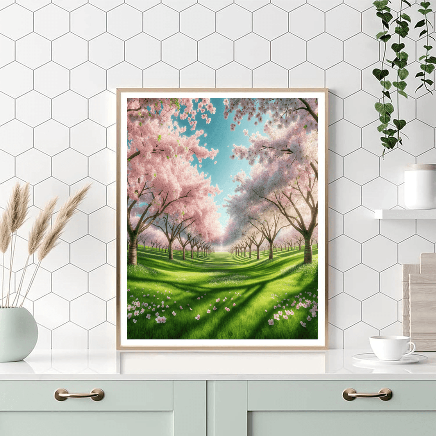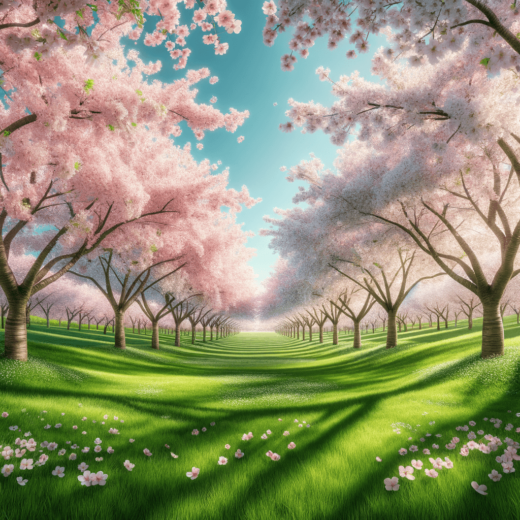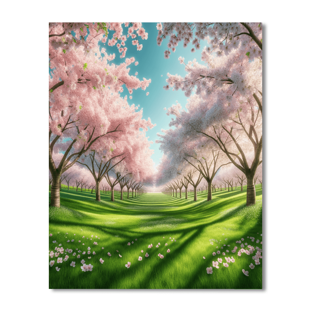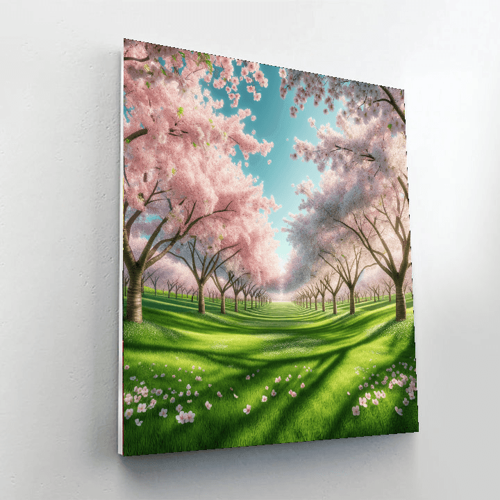 Enchanted Cherry Blossoms offers a stunning view of cherry trees in full bloom, creating a canopy of pink and white flowers. This piece is perfect for those who appreciate the delicate beauty of flowers and the fleeting nature of cherry blossoms. The soft colors and gentle composition evoke feelings of joy and renewal, making it an excellent choice for spaces that could use a touch of spring, such as living rooms or entryways.