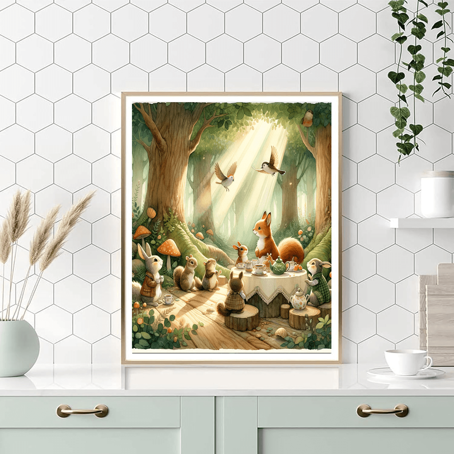 Step into a magical forest for a whimsical tea party with this charming painting featuring adorable woodland creatures gathered under a canopy of trees. Let your imagination wander as you enjoy a delightful gathering with furry friends in a fairy-tale setting. Perfect for kids who love animals and imaginative play, this painting will bring a touch of magic to any space. Display it in a playroom or garden to create a cozy and inviting atmosphere.