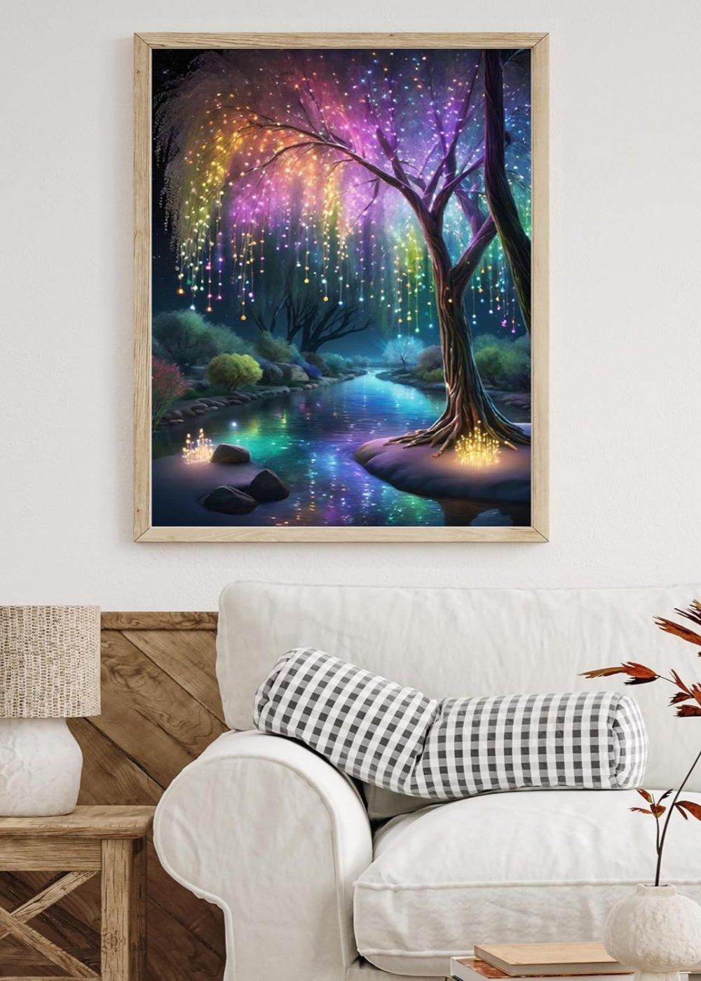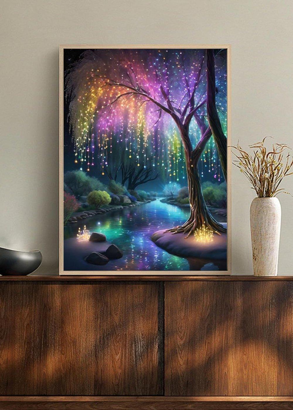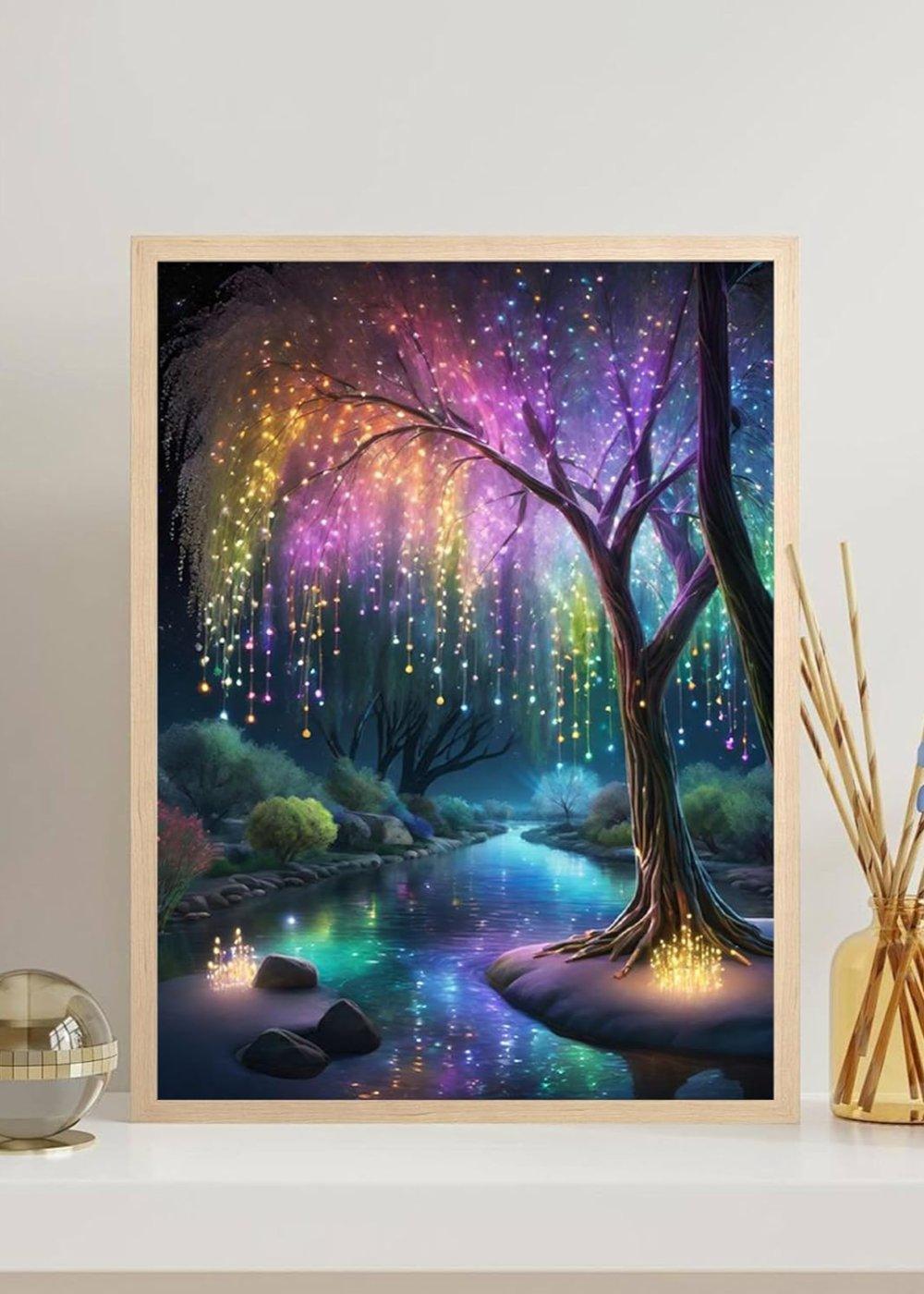 Immerse yourself in a magical night scene with the Enchanted Illumination Tree Paint By Number Kit. This stunning artwork features a luminous tree with cascading orbs of light in vibrant rainbow colors, reflecting beautifully on a serene river. The dreamy setting, with its enchanting glow, evokes a sense of wonder and serenity, perfect for adding a whimsical touch to any space.