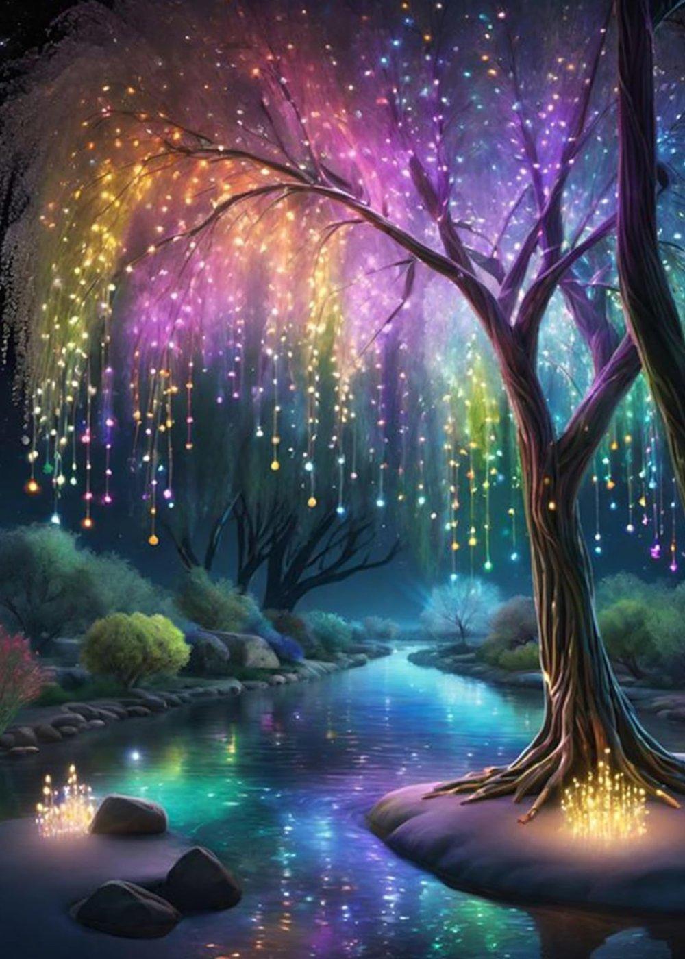 • Theme: A magical and enchanting night scene featuring an illuminated tree with glowing, multicolored lights cascading like a weeping willow over a serene river.