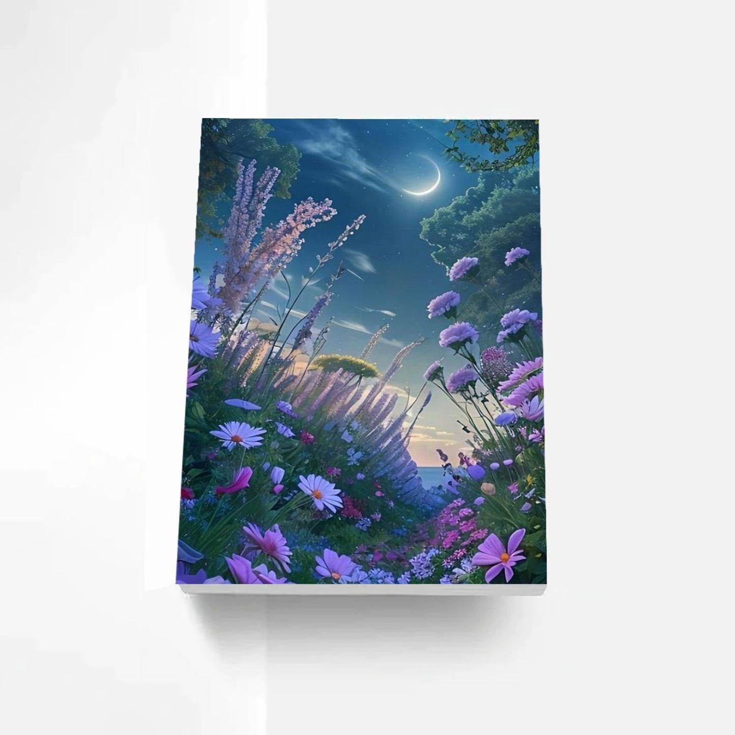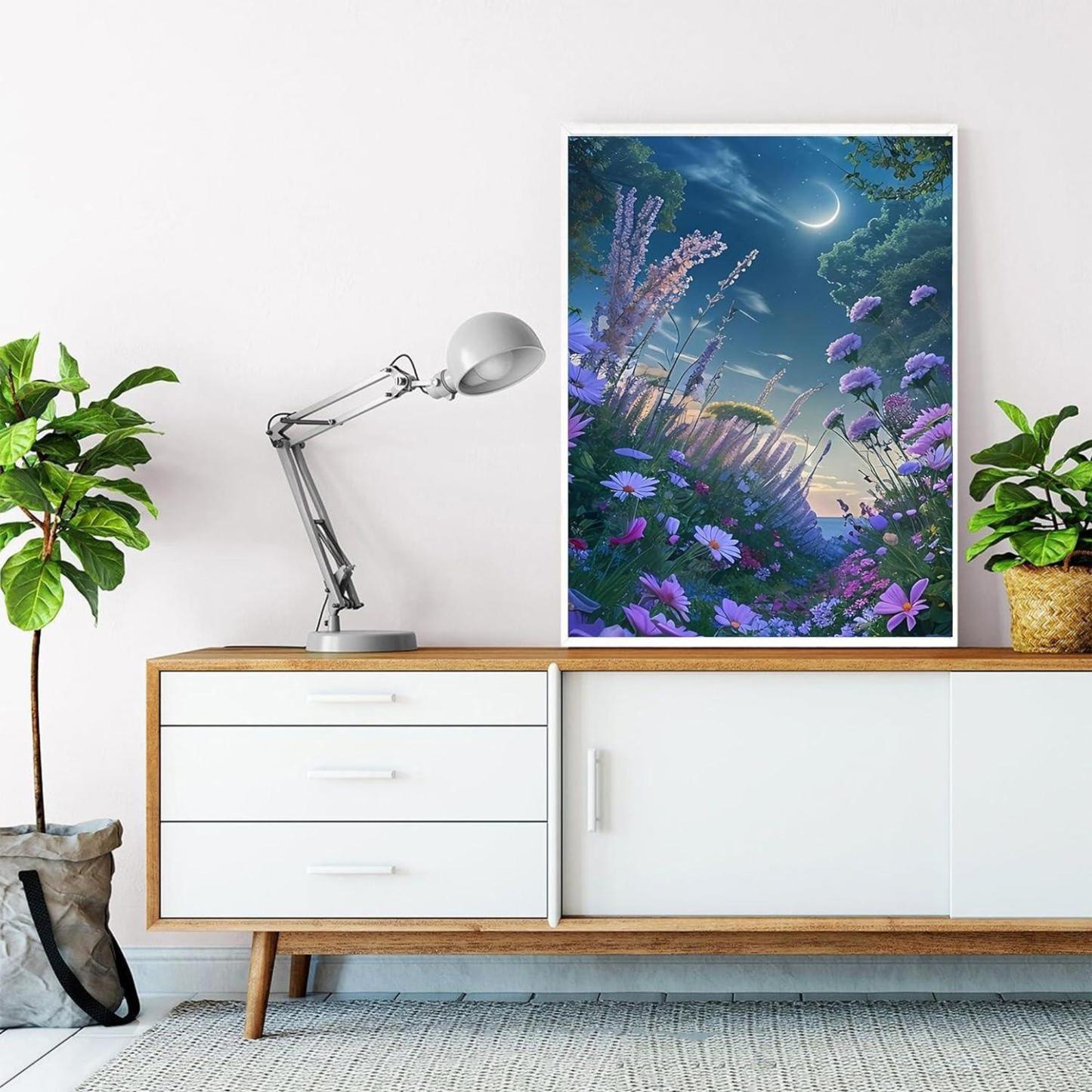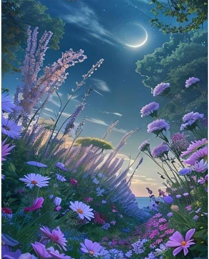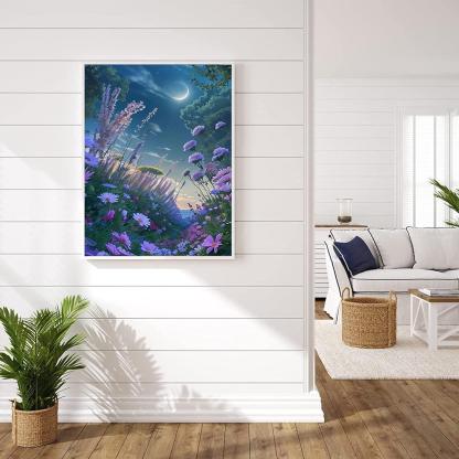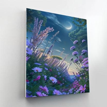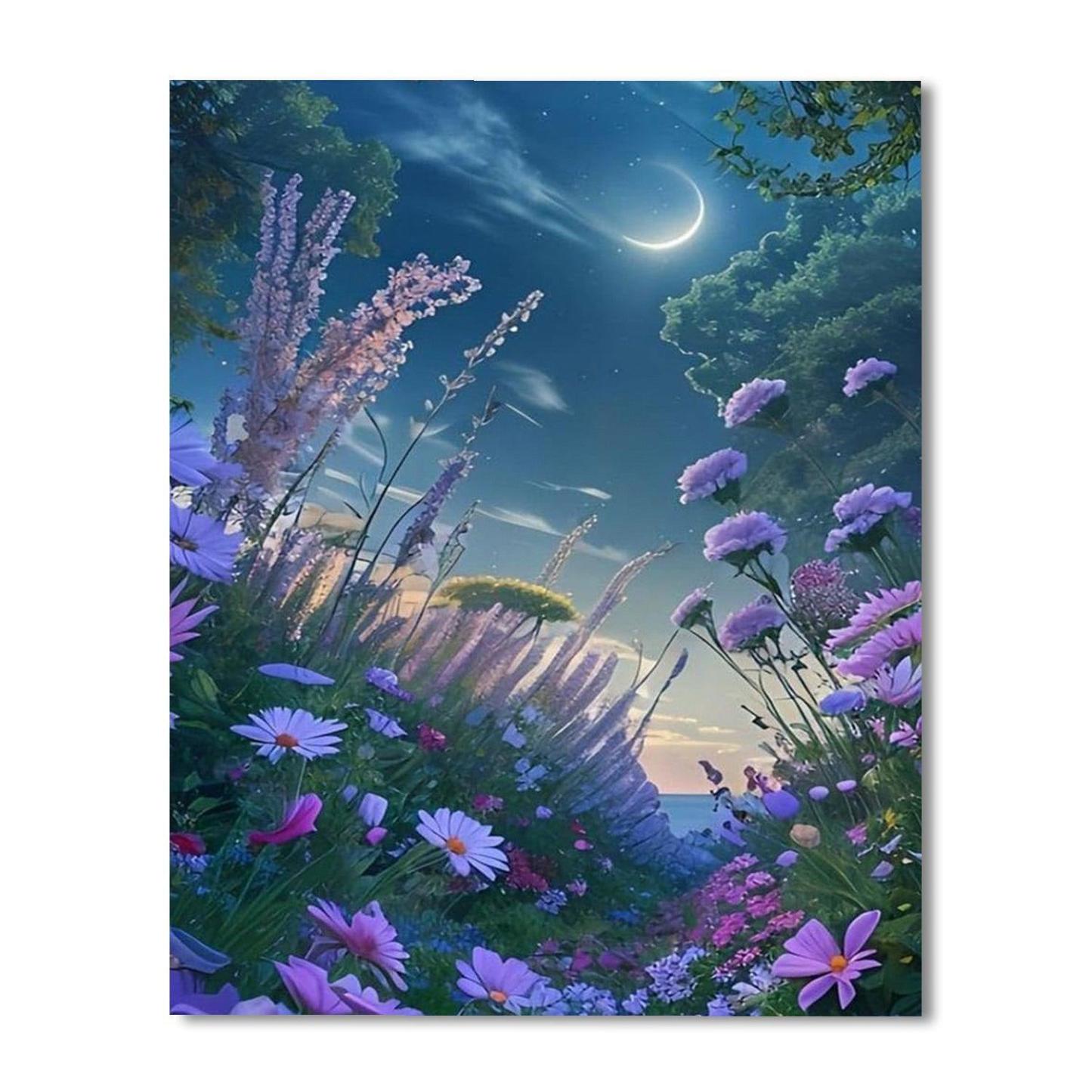 Craft a serene night time panorama with the Enchanted Meadow Paint By Number Kit. Designed for tranquility seekers, this set unveils a lush meadow under a mesmerizing crescent moon, inviting painters to bring this serene nocturnal scene to life.