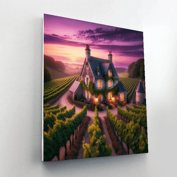 Discover the romantic allure of Enchanted Twilight Vineyard, where rows of grapevines under the twilight sky create a mesmerizing pattern leading to an old stone cottage. The last rays of the sun cast a soft purple and pink glow over the vineyard, enhancing the magical feel. This artwork is ideal for dining rooms or wine cellars, adding an element of sophistication and charm, perfect for those who appreciate fine wine and the beauty of the countryside.