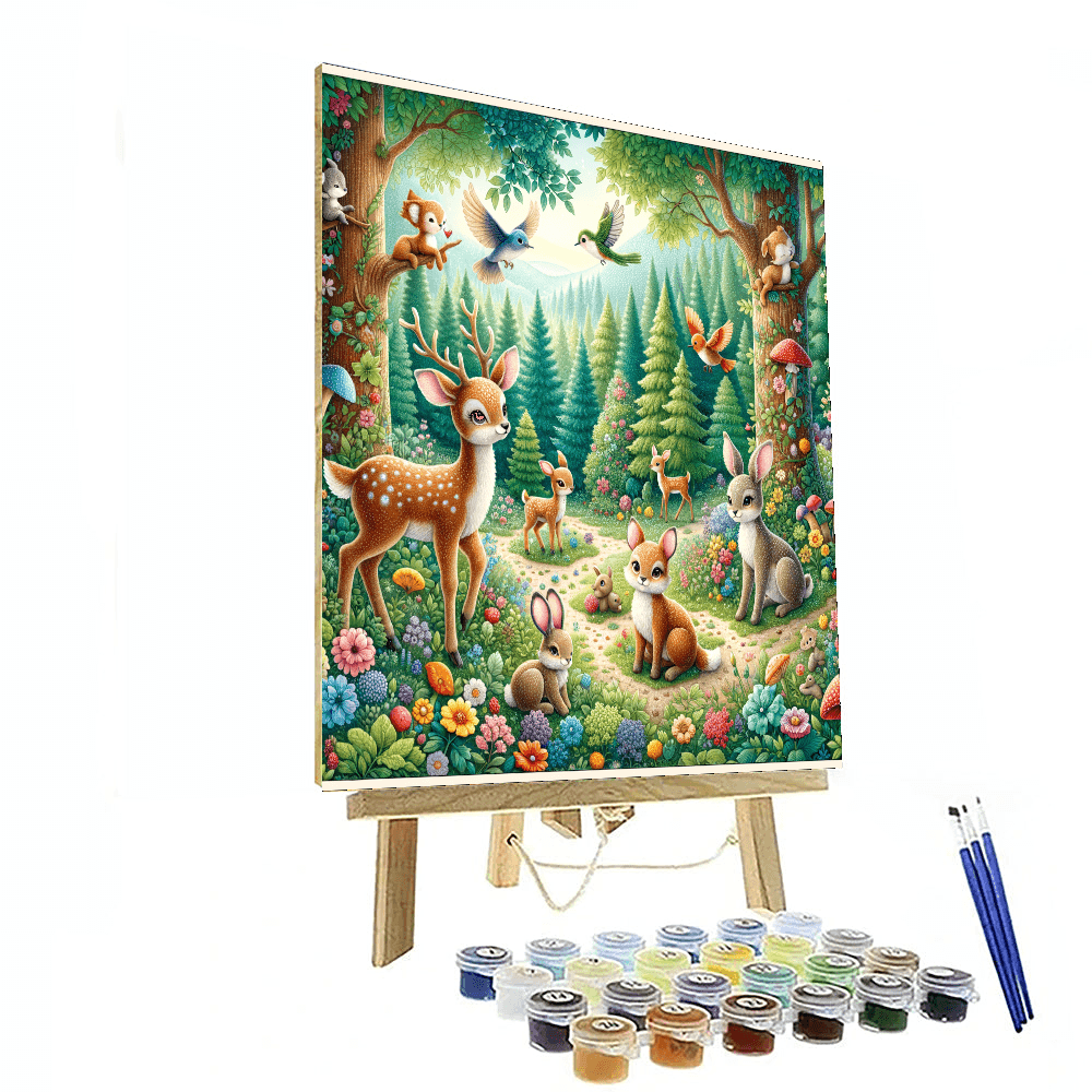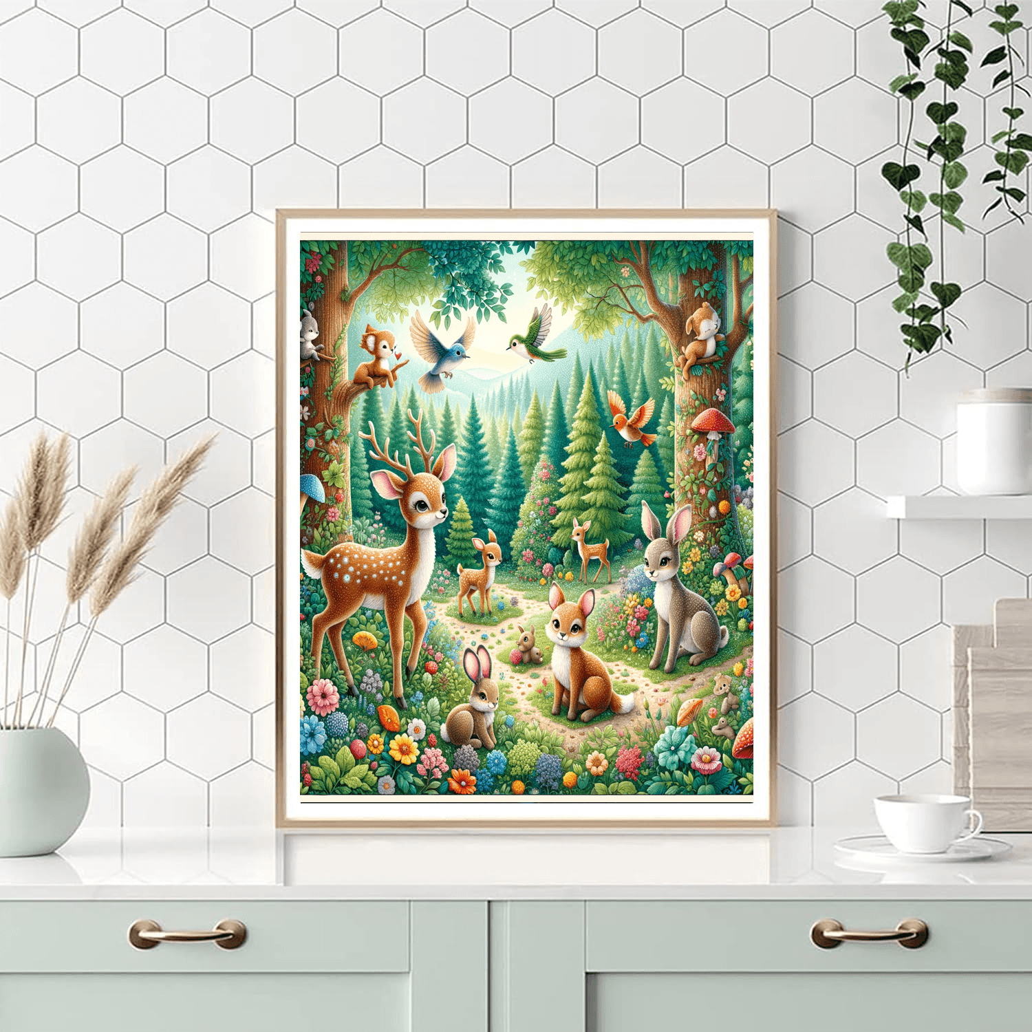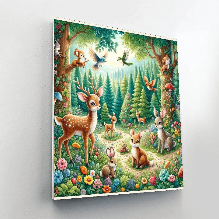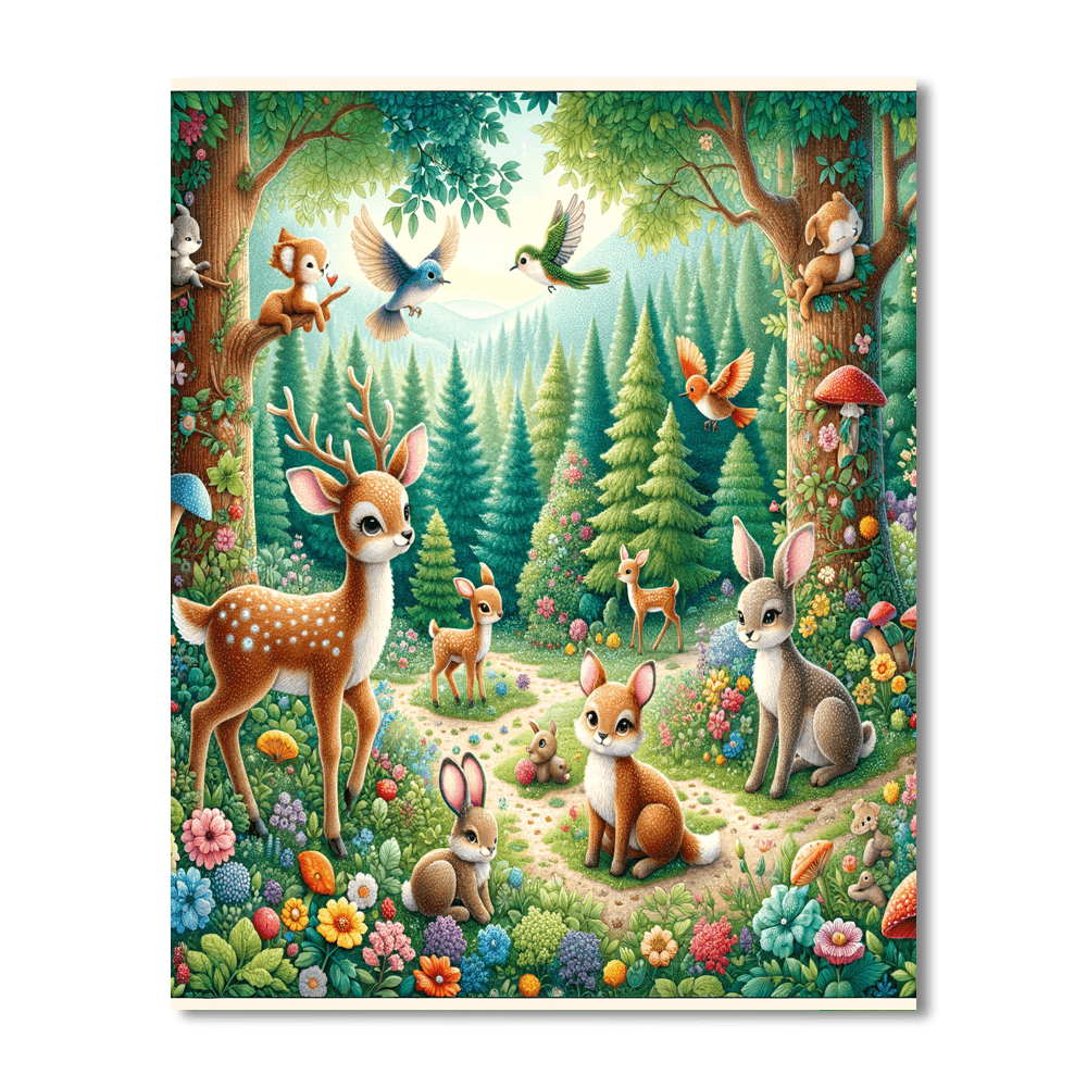 A delightful depiction of enchanting woodland creatures, perfect for adding a touch of magic and wonder to any room. The vibrant colors and intricate details make it a captivating piece for a childs bedroom or a whimsical living room. This enchanting artwork can inspire creativity and imagination, making it a delightful addition to your home decor.