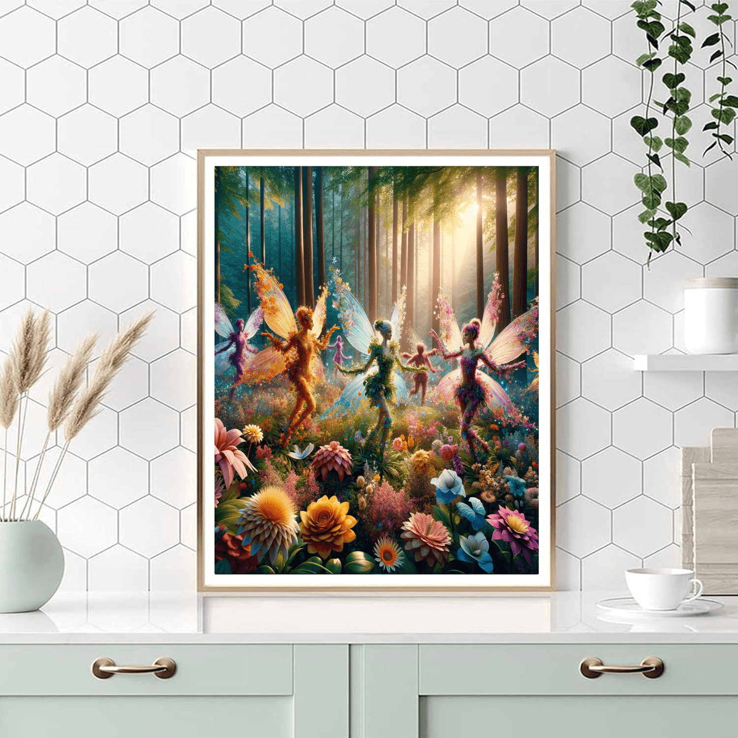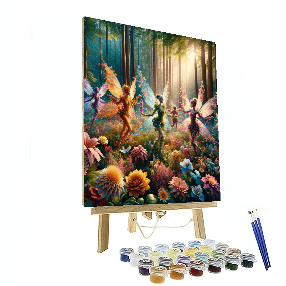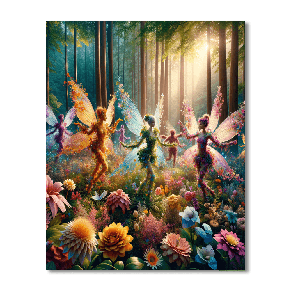 Step into a magical world with this enchanting depiction of woodland fairies dancing among flowers. Perfect for childrens rooms or play areas, this piece sparks imagination and creativity, inviting stories of adventure and wonder.
