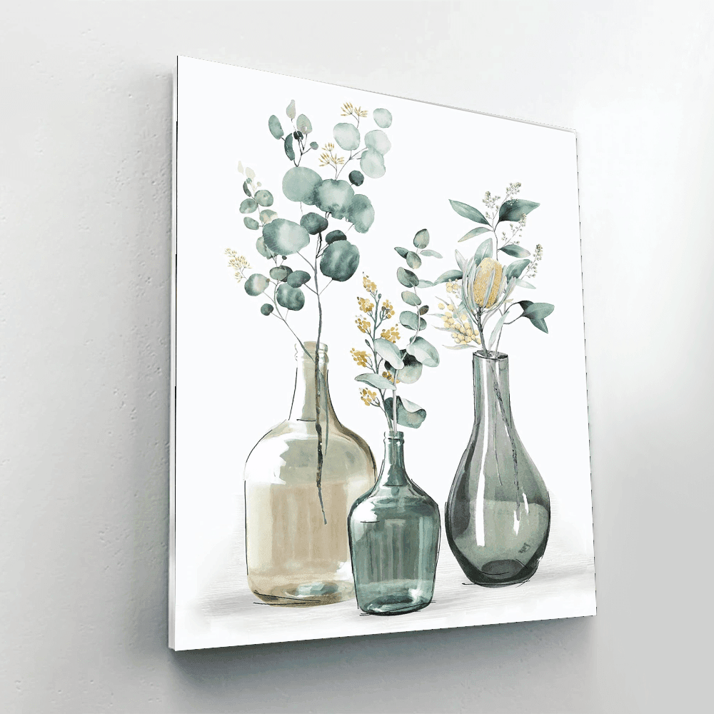 Introduce a serene and artistic touch to your decor with the Ethereal Flora in Glass Vases Paint By Numbers Kit. This piece beautifully captures the timeless grace of delicate flowers and foliage arranged in transparent glass, rendered with a soft watercolor effect that adds a tranquil and airy ambiance to any room.