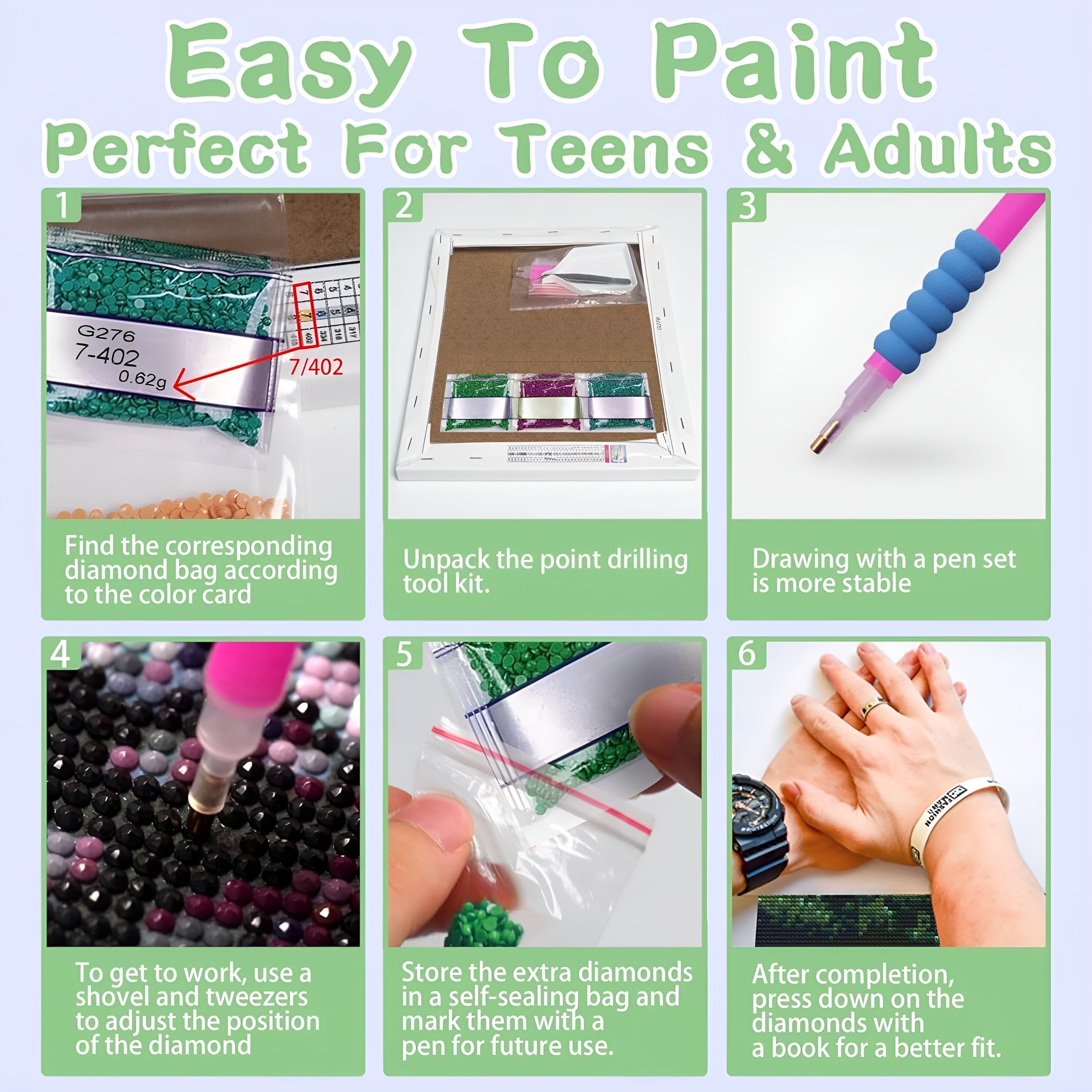 All-Inclusive Kit: Includes a pre-framed canvas, gift box, diamond color chart, self-sealing bags, pointed tray, three-head pen, correction tool, pen holder, tweezers, glue, and adhesive patches.