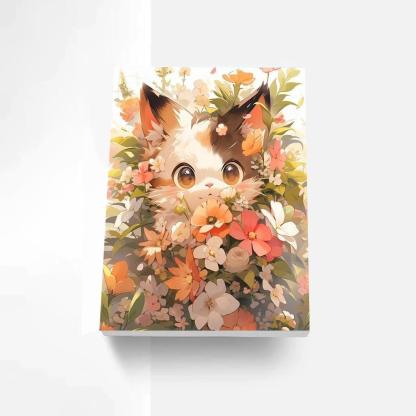 Design: Features an adorable kitten as the centerpiece, surrounded by a multitude of flowers, creating a scene.