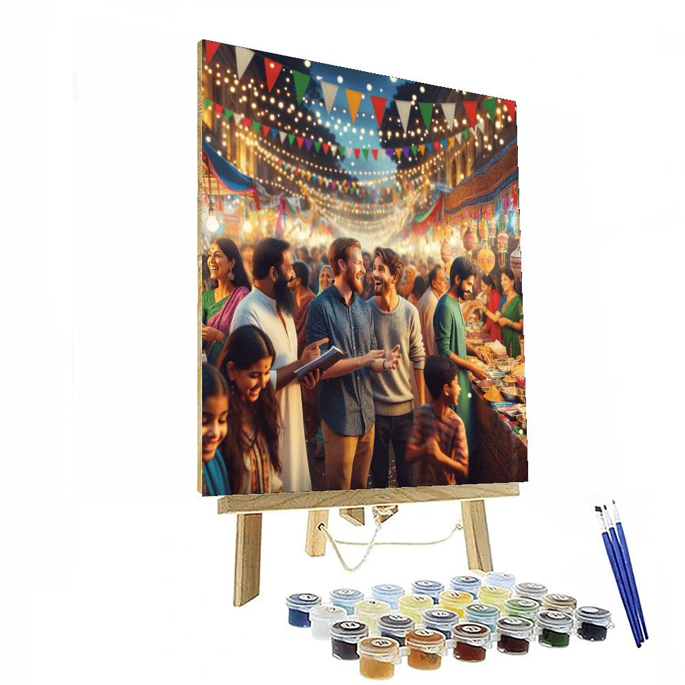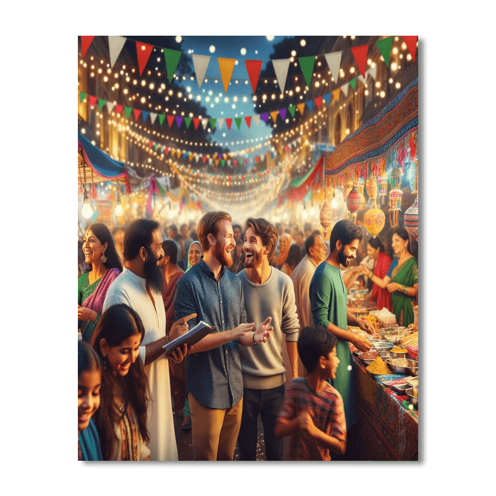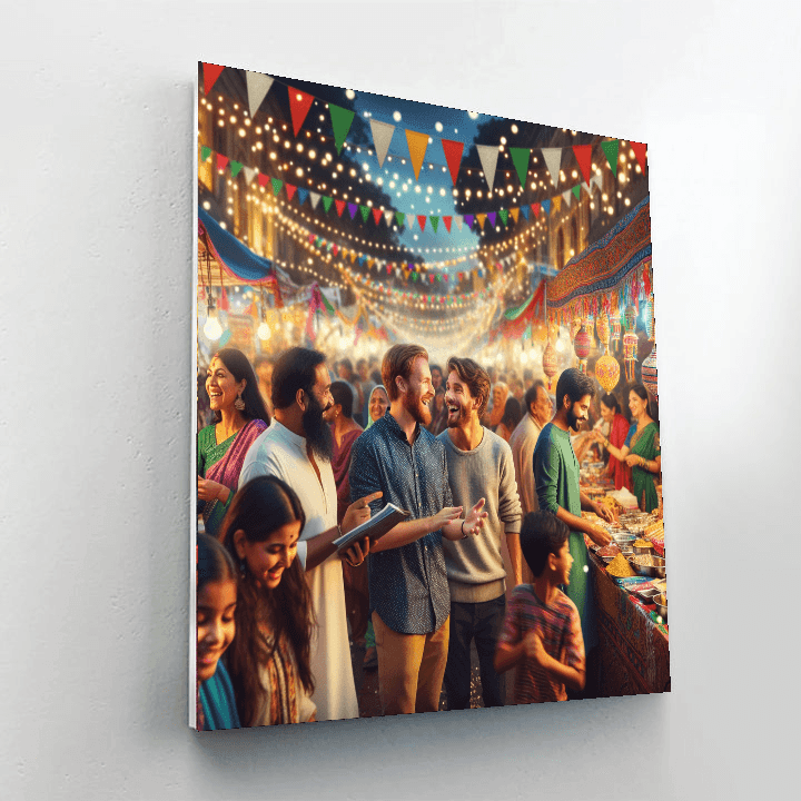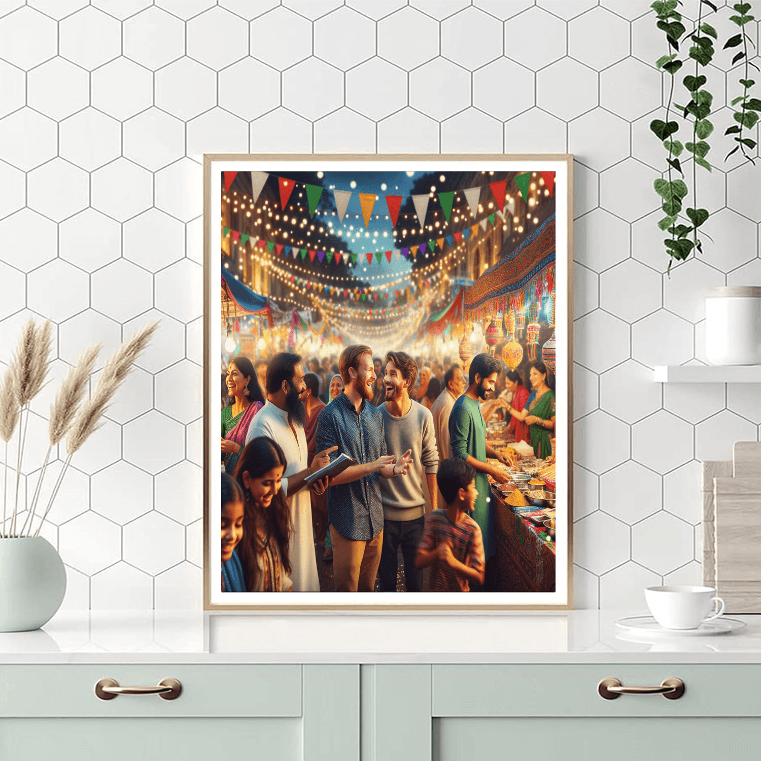 Immerse yourself in the vibrant atmosphere of Festive Market Street Celebration. This lively scene captures a bustling street market during a festival, filled with colorful stalls, flags, and lights. People of all ages are seen enjoying the festivities, adding a dynamic human element to the scene. This piece is perfect for energizing spaces like dining rooms or kitchens, bringing the joy and community spirit of a street festival into your home, encouraging gatherings and celebrations.